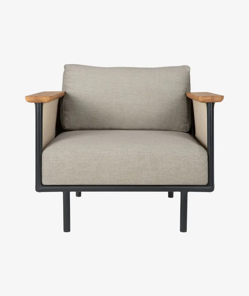 Settle Outdoor Lounge Chair w. Armrest invites you to settle into its comfort, providing an ideal setting for enjoying the outdoors all day. Its airy steel frame, complete with visible belts and intricate details, enhances its visual allure from all angles, while its armrests, made from FSC™-certified (FSC-C028824) sapele mahogany wood, add a warm, tactile feel. Settle’s steel frame is galvanized, primed and powder-coated, ensuring corrosion resistance for long-lasting use. The plush cushions, made with quick-dry foam and durable outdoor textiles, offer fast-drying resilience in rain showers and year-round durability when used with an outdoor cover.
