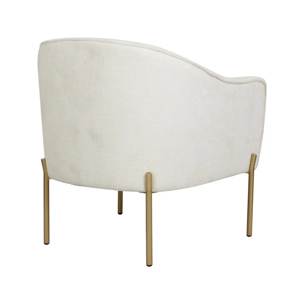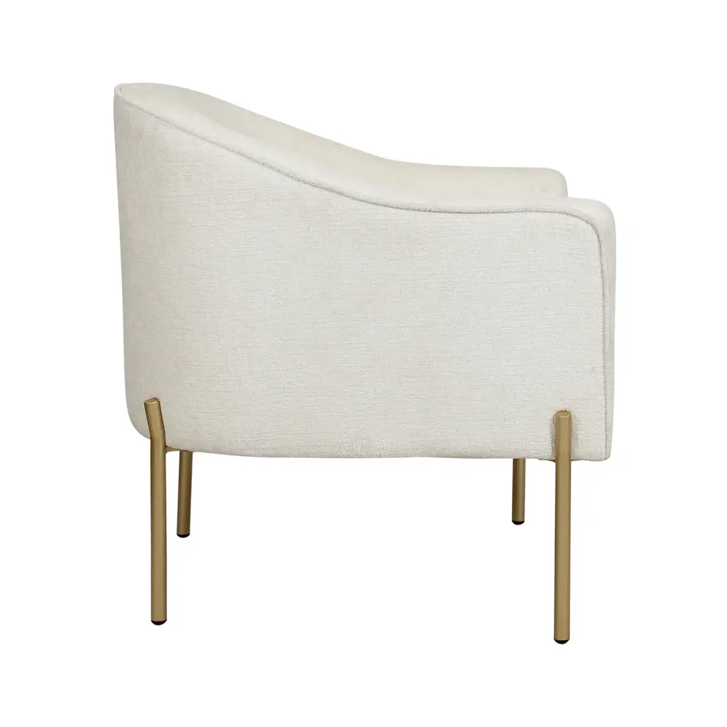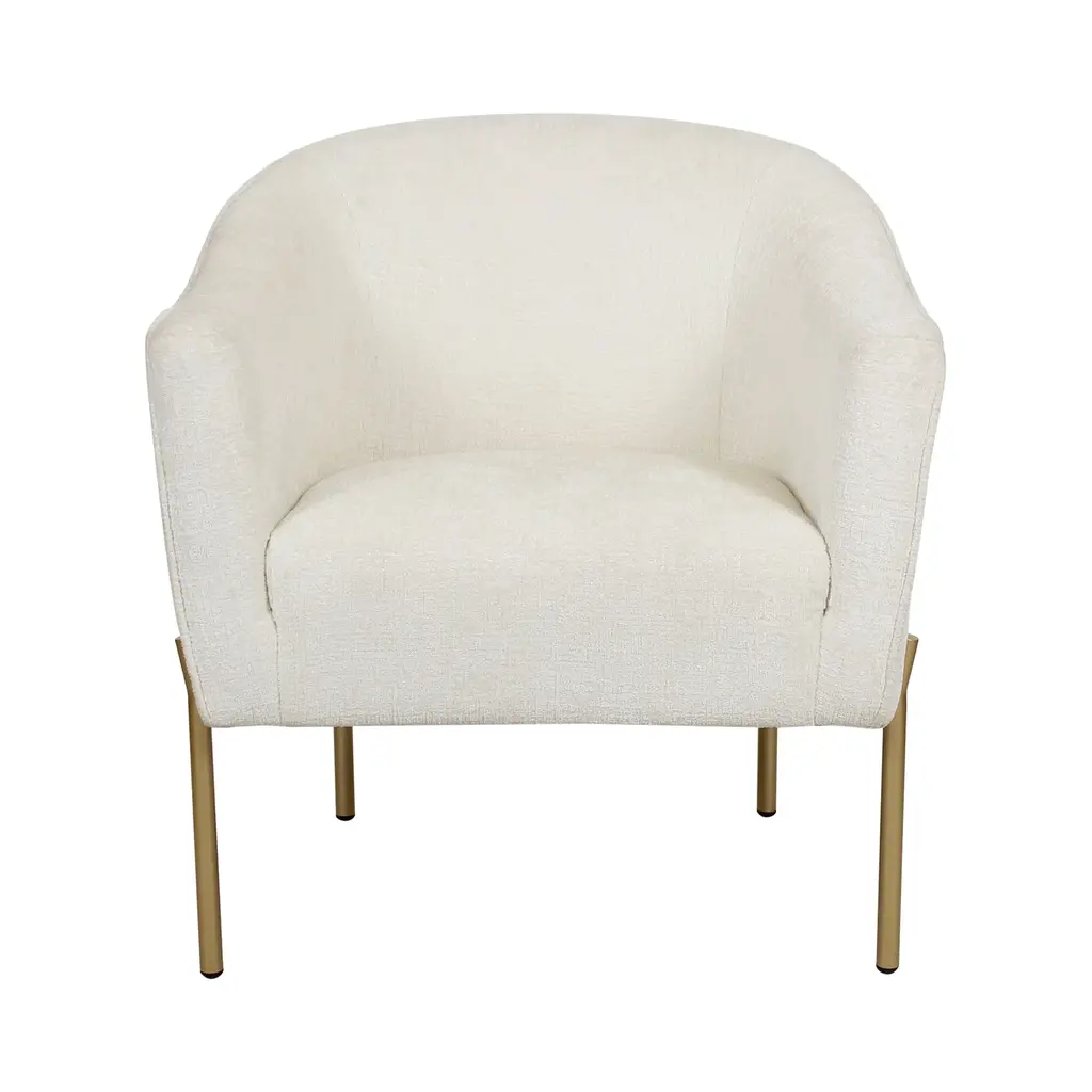 A perfect blend of style and comfort, this modern club chair features simple, solid metal legs with a gold finish and luxe chenille white upholstery. These accent chairs take inspiration from chic hotel lounges, with a hint of 40s Art Deco styling. Add distinctive everyday luxury to your living room, home office or glamourous dressing room.