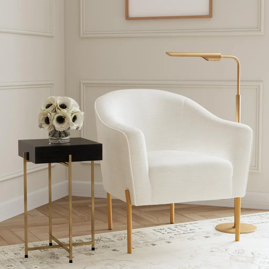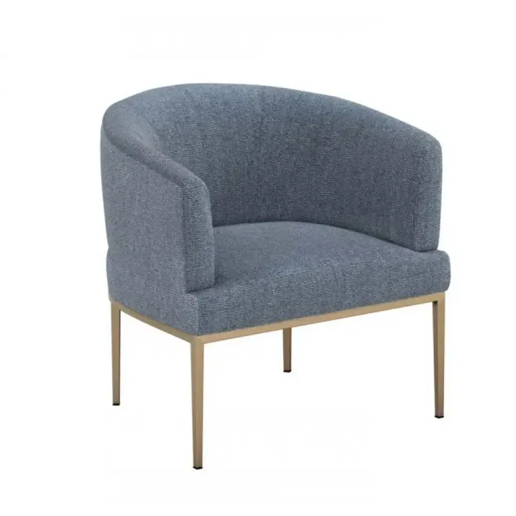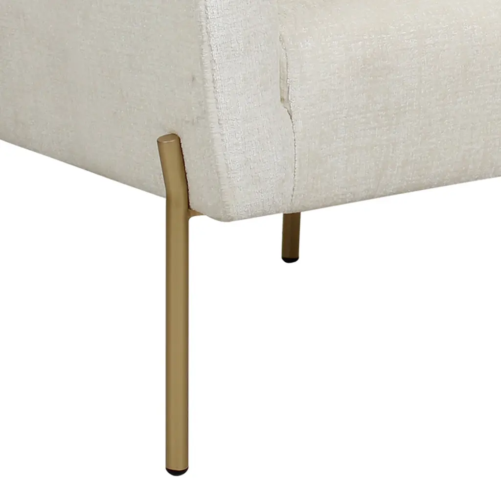 A perfect blend of style and comfort, this modern club chair features simple, solid metal legs with a gold finish and luxe chenille white upholstery. These accent chairs take inspiration from chic hotel lounges, with a hint of 40s Art Deco styling. Add distinctive everyday luxury to your living room, home office or glamourous dressing room.
