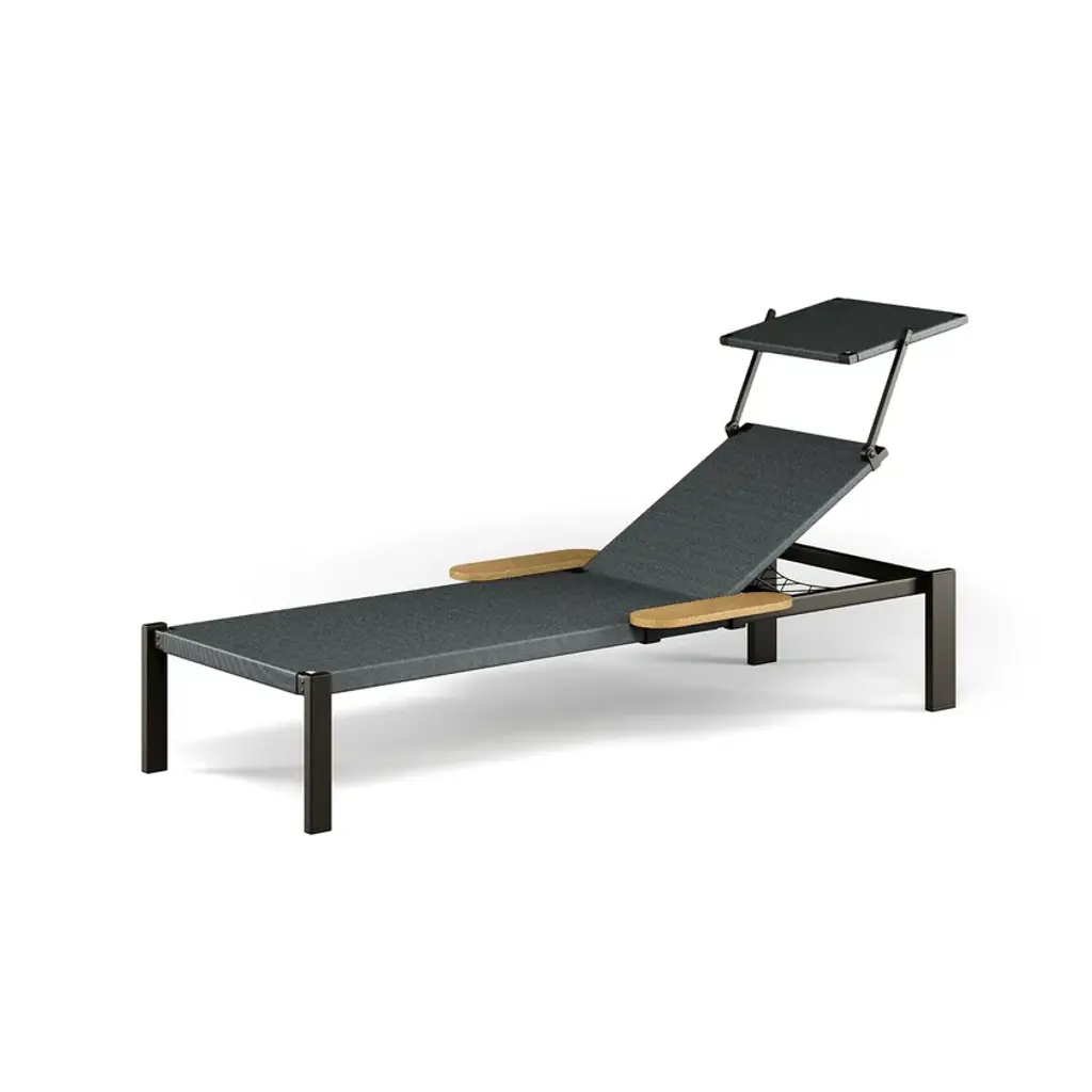 Shine is an aluminum and emu-tex garden lounger with retractable wheels. Also available with canopy.The modern, quintessential lines of Arik Levy's Shine collection are designed for both the Home and Contract sectors. A full collection of aluminium and teak furniture, with an understated design: Shine has an innate versatility that makes it perfect for both indoor and outdoor settings. Chairs, armchairs, lounge chairs and stools are available with both aluminium and FSC® teak seats. The collection is completed by single sunbeds with frames in either aluminium or FSC® teak, double sunbeds, tables of various sizes, fixed and extensible, suitable for different space requirements and contexts of use.Available colours: structure: matt white, black, dark brown, dove greytop: teakLounger fabric: white, black, brown, dove grey