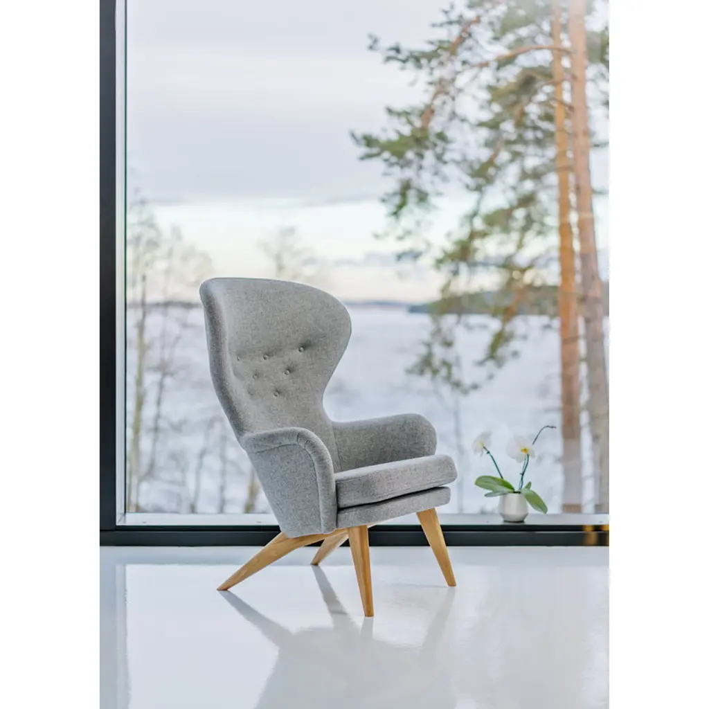 The elegant Siesta armchair was designed by Carl-Gustaf Hiort af Ornäs in 1952. The chair catches the eye with its sculptural silhouette featuring a high backrest and slanted wooden legs. The frame is made of a single sheet of pressed plywood, and the upholstery of the back is finished off with decorative buttons. The Siesta armchair was introduced at the Milan Triennial in 1957 and originally manufactured by Hiort af Ornäs’ own factory Puunveisto Oy in Helsinki, Finland. Today, the chair is available as a reissue.