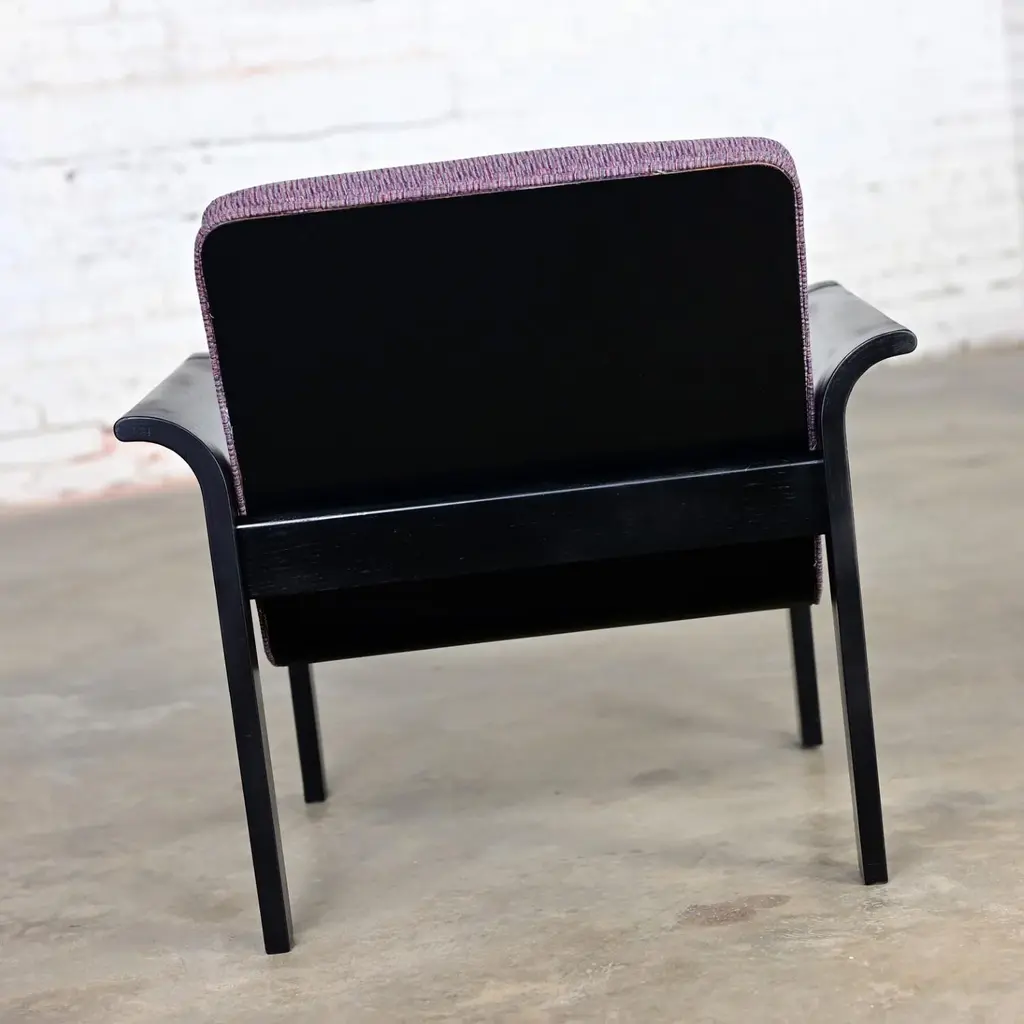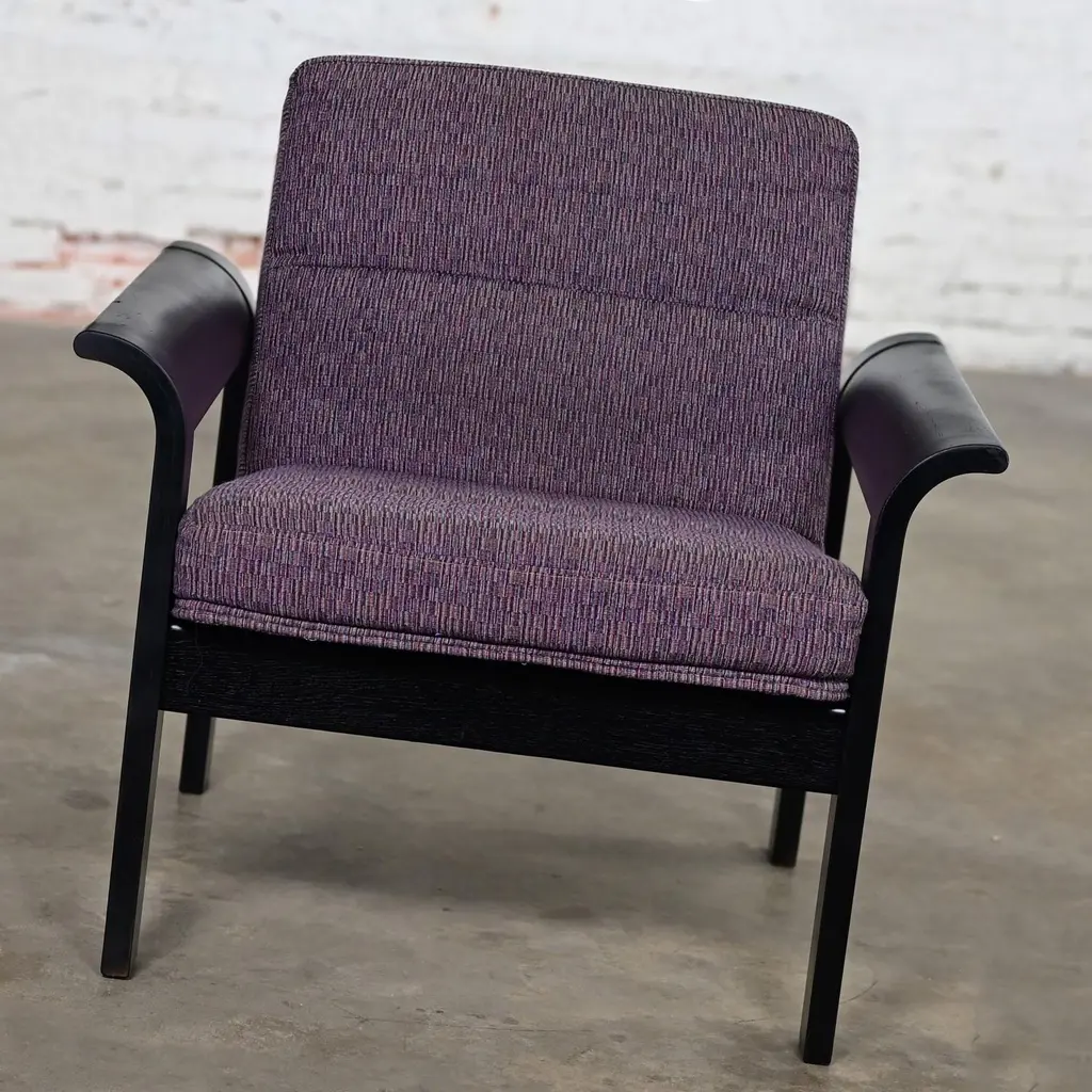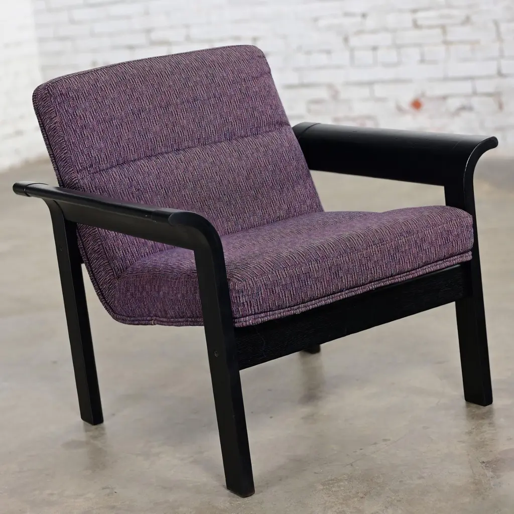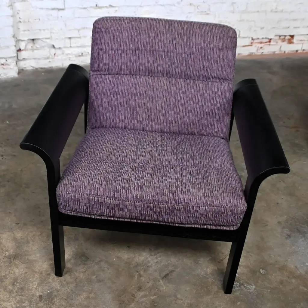 Fabulous Danish Modern black painted blonde oak bentwood lounge chair upholstered in purple fabric designed by Rud Thygesen & Johnny Sorensen, made by Magnus Olesen, distributed by Rudd International. We have 5 available and are selling them per chair. Circa, Late 20th Century. Beautiful condition, keeping in mind that this is vintage and not new so will have signs of use and wear even if it has been refinished or restored. The frames of these chairs had some flaws that were best repaired and covered so we chose to paint the original light oak a deep beautiful black. Original upholstery is in fabulous condition. Please see photos, zoom in for details, and see long description as they are part of the condition report. We attempt to portray any imperfections. Circa, Late 20th Century. NOTE A: We do have listings here as well for a pair of chairs or all 5 chairs just in case that makes it easier and there is a little price break that way. NOTE B: The chair in the photo is an example. We will send you photos of the exact chair/chairs you will be getting prior to shipping. Is there anything quite as fabulous as a prestigious purple lounge chair? Well, YES… if there are FIVE of them!! And that’s exactly what we have to offer to you! Plus, they bear QUITE the reputation!! This is a phenomenal Danish or Scandinavian Modern lounge chair designed by the elite Rud Thygesen and Johnny Sorensen for Magnus Olesen and distributed by Rudd International of Denmark. We have 5 available and are selling them per chair. They are comprised of gorgeous black painted oak frames with flared out bentwood arms and straight legs that are actually one piece and they feature front and back stretchers which hold the molded seat giving it a floating illusion. AWESOME!! The seat and backs are upholstered in a wonderful purple fabric, and they exude a unique organic Danish Modern feel. Their ergonomically sculpted and designed seats are both alluring in style and ridiculously comfortable! We can easily see these lounge chairs in an Organic or Danish Modern setting, but they will look equally as beautiful in your industrial loft or in a modern country style setting. They would also be wonderful extra seating in your living room or in a game or theater room! And if you are outfitting a commercial office…these would be perfect! Wherever you use them, these fabulous purple lounge chairs are ready to take your seating experience to the next level! Rud Thygesen and Johnny Sorensen both graduated for the Danish School of Arts, Crafts, & Design in 1966 and opened their own design studio that same year. While still in school they established a cooperation with Magnus Olesen. In 1971 Magnus Olesen was involved in the first models of a range of laminate furniture of which the mutual connection; both technologically and aesthetically, is apparent in aesthetic and functional design. They created multiple furniture series, mostly laminated woods and have contributed greatly to the development of molded and laminated woods and have designed some of the most prestigious Danish furniture pieces. After a 30-year successful partnership in 1995, both designers ended their partnership and went on to pursue solo careers. -Nordic Emotions Magnus Olesen was founded in 1937 with a strong belief in Danish craftsmanship and is still a well-reputed furniture company today. They develop and manufacture functional designed furniture of high quality and durability in cooperation with today’s leading designers and architects. Since its founding Magnus Olesen has worked with such well-respected designers as Kofod-Larsen, Kai Kristiansen, Rud Thygesen & Johnny Sorensen, Niels Gammelgaard, Busk & Hertzog, and lately also Strand & Hvass & Says Who… always remaining true to its design roots while keeping up with the developments of time. Their well-established design and production company is located in Durup Denmark, and they have a gorgeous Showroom located in Copenhagen. These lounge chairs are the epitome of Danish or Scandinavian Modern excellence… created by elite designers for a renowned international company and manufactured from a platform well-known for their attention to quality, comfort, and timeless designs. Plus, their PURPLE!! What are you waiting for? Make them yours!! Chairs: • Height – 29.5 Inches • Width – 30 Inches with Arms • Depth – 29 Inches • Seat Height – 16 Inches • Arm Height – 21 Inches • Inside Seat Width – 22.5 Inches • Inside Seat Depth – 18.5 Inches • Inside Back Height – 15.5 Inches • Weight – 32.8 Pounds Each Crated Size: • Height – 35 Inches • Width – 36 Inches • Depth – 35 Inches • Crated Weight – 200 Pounds