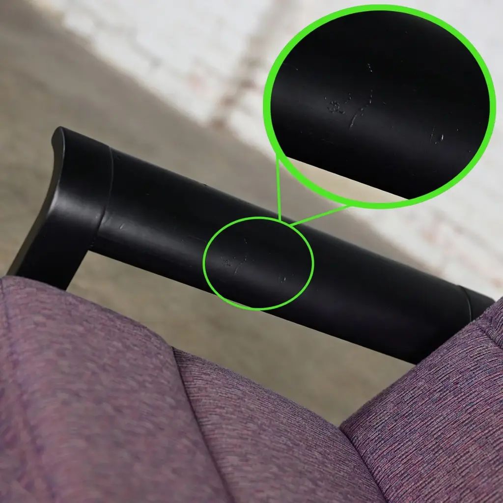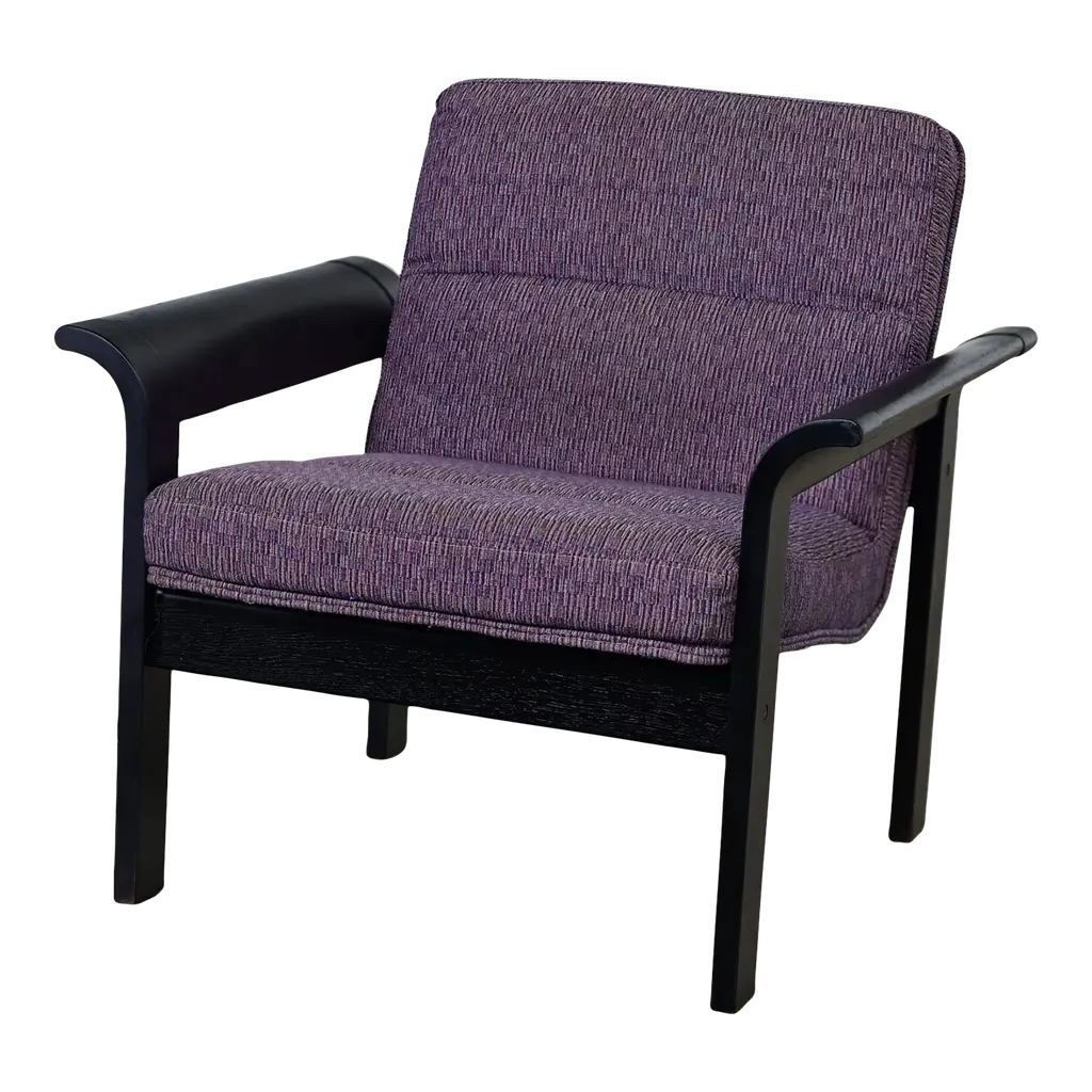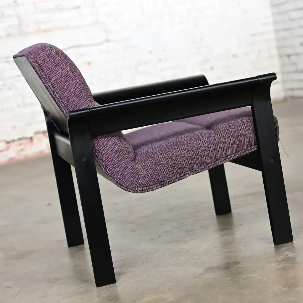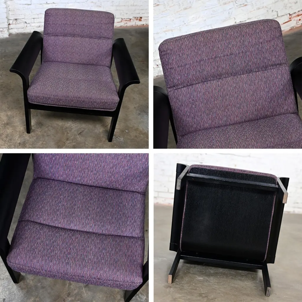 Fabulous Danish Modern black painted blonde oak bentwood lounge chair upholstered in purple fabric designed by Rud Thygesen & Johnny Sorensen, made by Magnus Olesen, distributed by Rudd International. We have 5 available and are selling them per chair. Circa, Late 20th Century. Beautiful condition, keeping in mind that this is vintage and not new so will have signs of use and wear even if it has been refinished or restored. The frames of these chairs had some flaws that were best repaired and covered so we chose to paint the original light oak a deep beautiful black. Original upholstery is in fabulous condition. Please see photos, zoom in for details, and see long description as they are part of the condition report. We attempt to portray any imperfections. Circa, Late 20th Century. NOTE A: We do have listings here as well for a pair of chairs or all 5 chairs just in case that makes it easier and there is a little price break that way. NOTE B: The chair in the photo is an example. We will send you photos of the exact chair/chairs you will be getting prior to shipping. Is there anything quite as fabulous as a prestigious purple lounge chair? Well, YES… if there are FIVE of them!! And that’s exactly what we have to offer to you! Plus, they bear QUITE the reputation!! This is a phenomenal Danish or Scandinavian Modern lounge chair designed by the elite Rud Thygesen and Johnny Sorensen for Magnus Olesen and distributed by Rudd International of Denmark. We have 5 available and are selling them per chair. They are comprised of gorgeous black painted oak frames with flared out bentwood arms and straight legs that are actually one piece and they feature front and back stretchers which hold the molded seat giving it a floating illusion. AWESOME!! The seat and backs are upholstered in a wonderful purple fabric, and they exude a unique organic Danish Modern feel. Their ergonomically sculpted and designed seats are both alluring in style and ridiculously comfortable! We can easily see these lounge chairs in an Organic or Danish Modern setting, but they will look equally as beautiful in your industrial loft or in a modern country style setting. They would also be wonderful extra seating in your living room or in a game or theater room! And if you are outfitting a commercial office…these would be perfect! Wherever you use them, these fabulous purple lounge chairs are ready to take your seating experience to the next level! Rud Thygesen and Johnny Sorensen both graduated for the Danish School of Arts, Crafts, & Design in 1966 and opened their own design studio that same year. While still in school they established a cooperation with Magnus Olesen. In 1971 Magnus Olesen was involved in the first models of a range of laminate furniture of which the mutual connection; both technologically and aesthetically, is apparent in aesthetic and functional design. They created multiple furniture series, mostly laminated woods and have contributed greatly to the development of molded and laminated woods and have designed some of the most prestigious Danish furniture pieces. After a 30-year successful partnership in 1995, both designers ended their partnership and went on to pursue solo careers. -Nordic Emotions Magnus Olesen was founded in 1937 with a strong belief in Danish craftsmanship and is still a well-reputed furniture company today. They develop and manufacture functional designed furniture of high quality and durability in cooperation with today’s leading designers and architects. Since its founding Magnus Olesen has worked with such well-respected designers as Kofod-Larsen, Kai Kristiansen, Rud Thygesen & Johnny Sorensen, Niels Gammelgaard, Busk & Hertzog, and lately also Strand & Hvass & Says Who… always remaining true to its design roots while keeping up with the developments of time. Their well-established design and production company is located in Durup Denmark, and they have a gorgeous Showroom located in Copenhagen. These lounge chairs are the epitome of Danish or Scandinavian Modern excellence… created by elite designers for a renowned international company and manufactured from a platform well-known for their attention to quality, comfort, and timeless designs. Plus, their PURPLE!! What are you waiting for? Make them yours!! Chairs: • Height – 29.5 Inches • Width – 30 Inches with Arms • Depth – 29 Inches • Seat Height – 16 Inches • Arm Height – 21 Inches • Inside Seat Width – 22.5 Inches • Inside Seat Depth – 18.5 Inches • Inside Back Height – 15.5 Inches • Weight – 32.8 Pounds Each Crated Size: • Height – 35 Inches • Width – 36 Inches • Depth – 35 Inches • Crated Weight – 200 Pounds