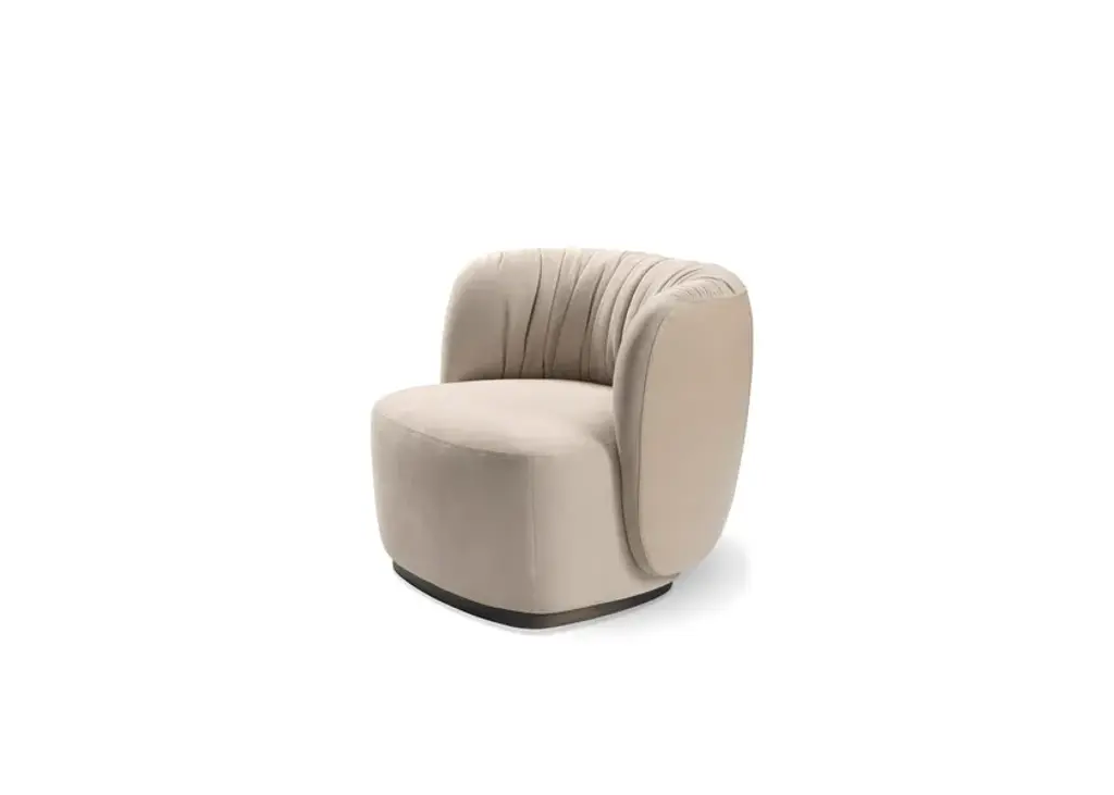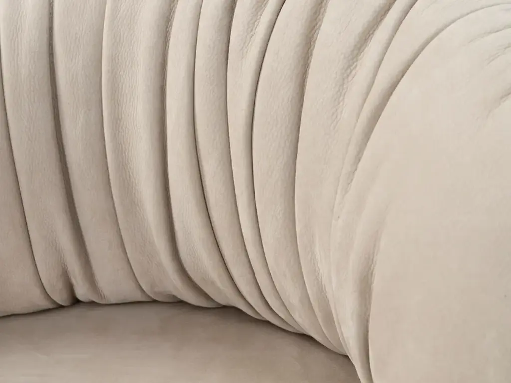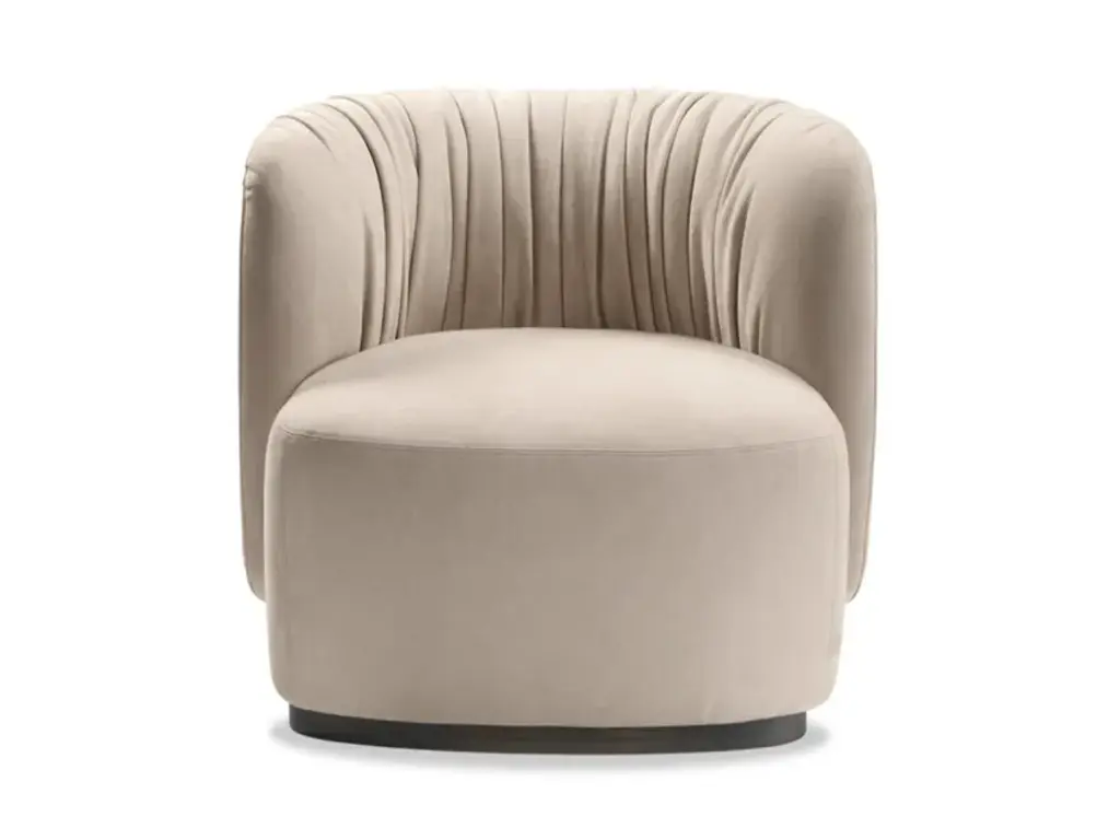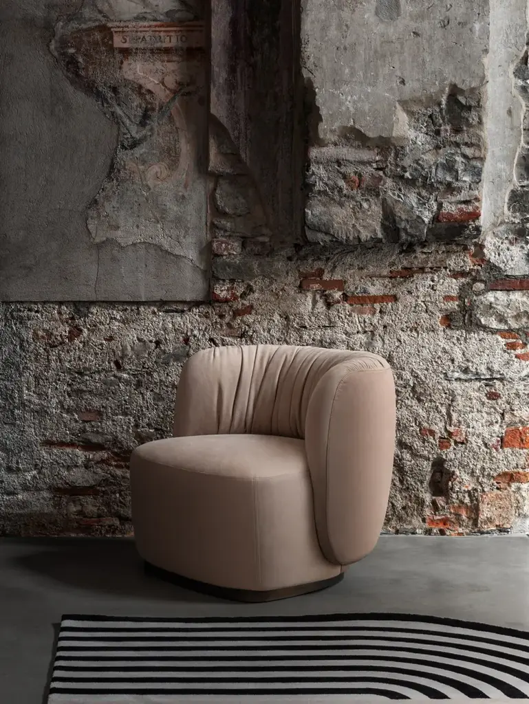 The Sipario armchair is upholstered in leather and is characterized by a draped Nabuk backrest recalls a stage curtain: like a drape that closes the stage in theaters, here gently wraps the soft seat of small dimensions of this lounge chair. It is available in a wide range of leathers, fabrics and velvets.Technical featuresStructure: Base in plywood panel and polyurethane rubber of different densitiesCushions: Cushions in polyurethane rubber by mould of different densitiesCovers: Covers are not removableBase: Sipario is based on aluminium ring cutted by water jet