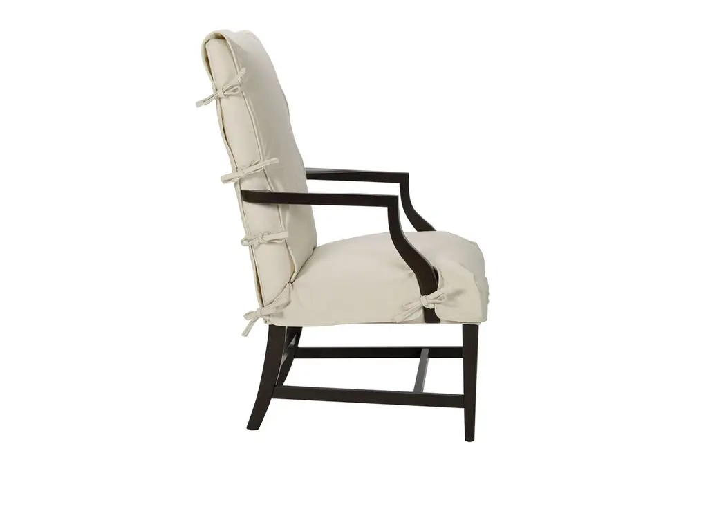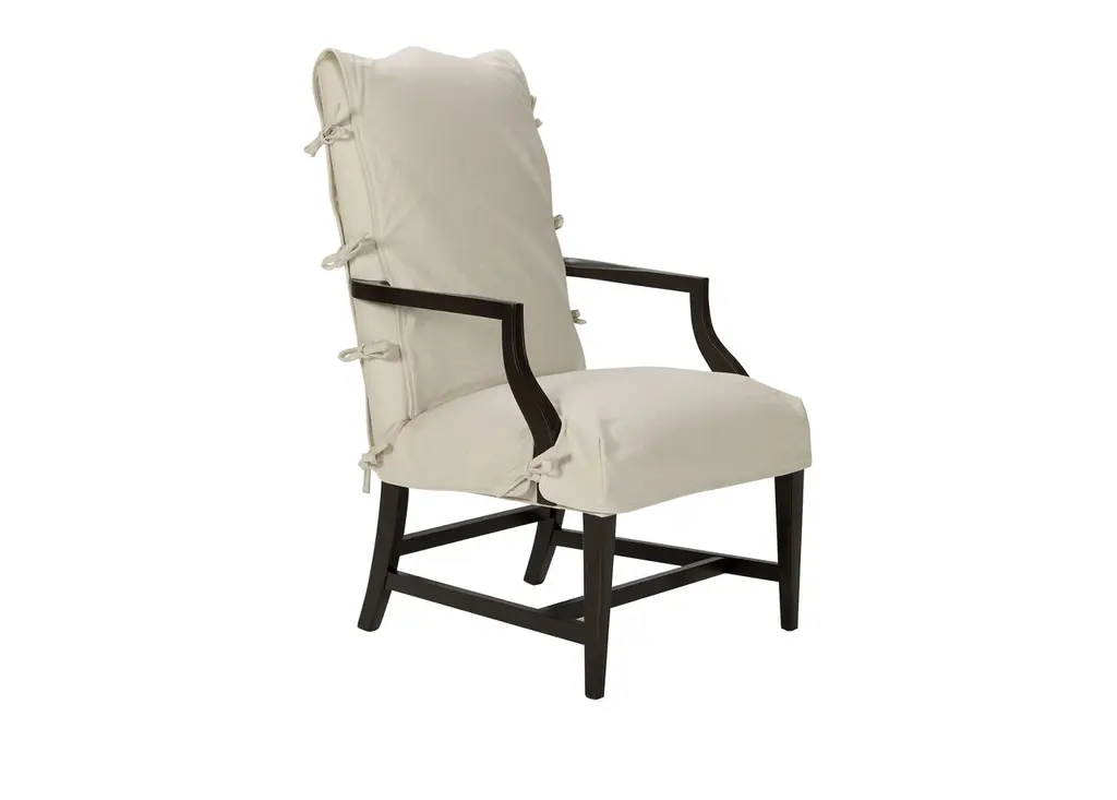 Her reputation precedes her - her chair follows. The classic eighteenth century silhouette is replete with a high upholstered back and short arms resting on incurvate supports. A gracious accent, dining, or secretary desk chair, it's beautiful in a relaxed tieback slipcover in a plethora of fabrics.