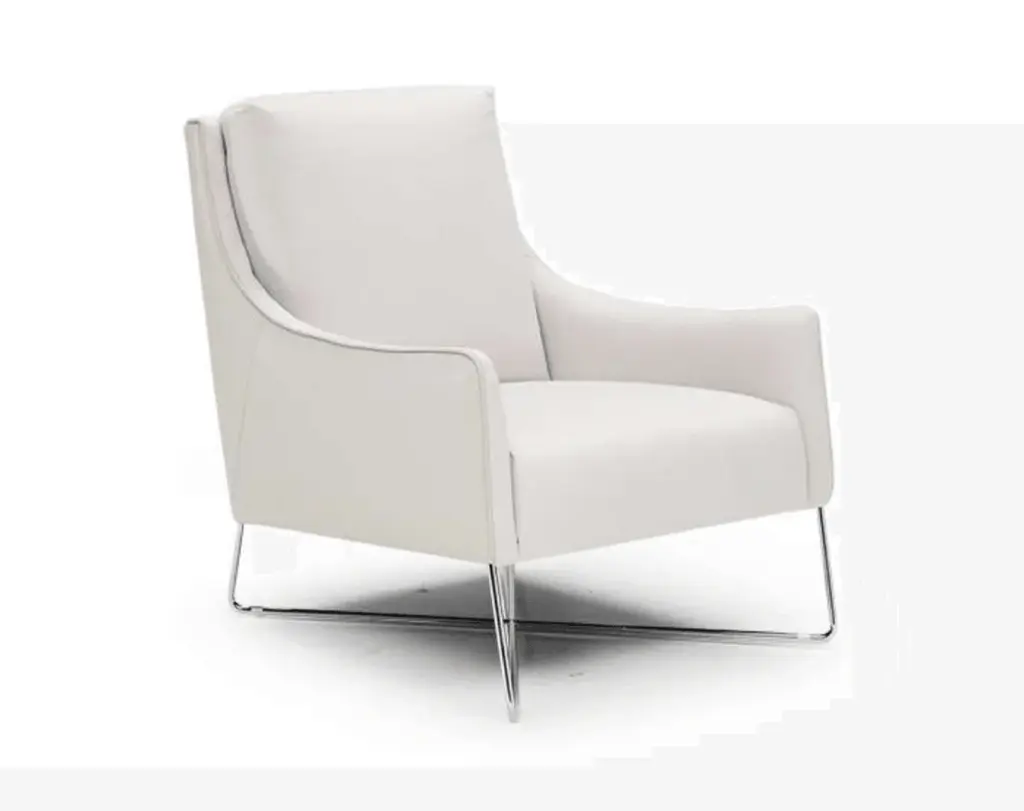 Elevate your space with the Sloped Arm Lounge Chair by Dema Arnold. Featuring a sleek metal frame, padded with molded polyurethane foam and bonded protective fabric. Rest upon silver colored thermoplastic legs and non-slip feet for a luxurious and secure seating experience.