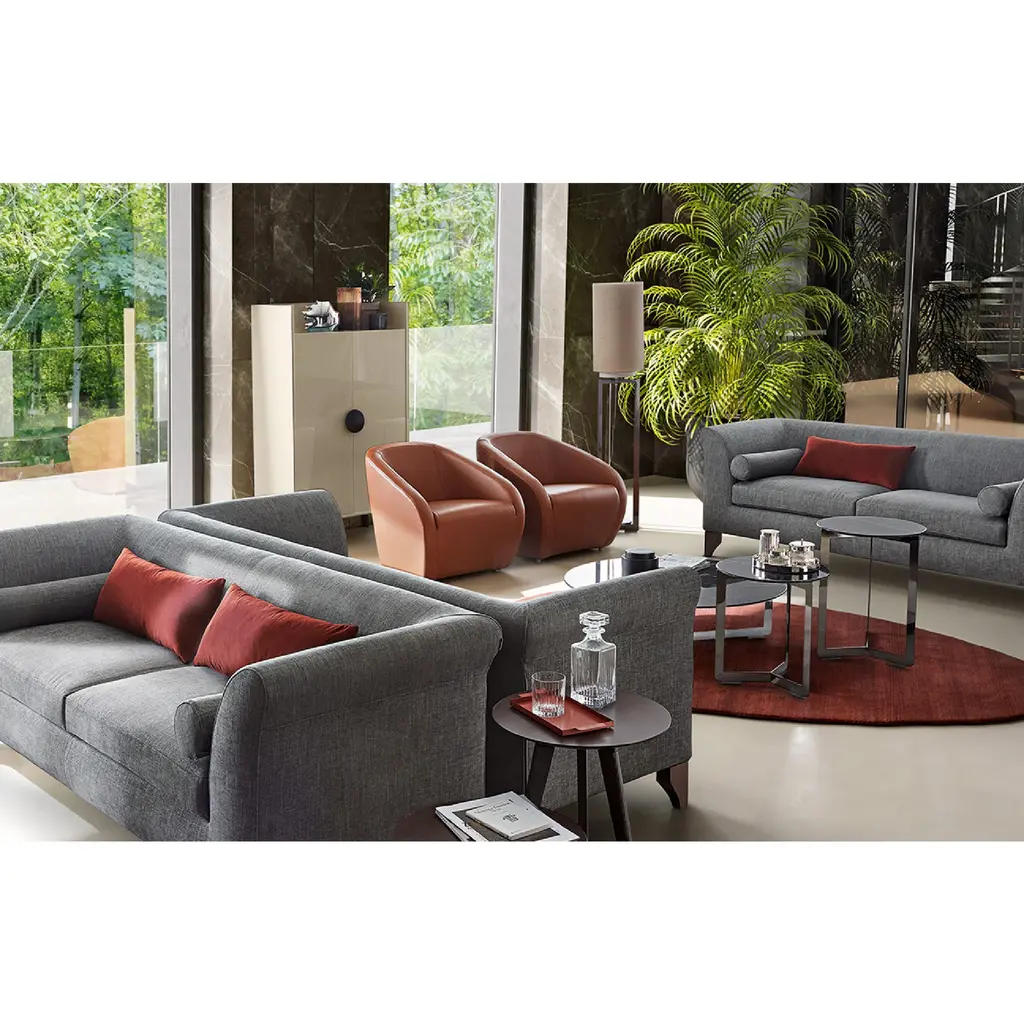 Elevate your space with the Sloped Arm Lounge Chair by Dema Arnold. Featuring a sleek metal frame, padded with molded polyurethane foam and bonded protective fabric. Rest upon silver colored thermoplastic legs and non-slip feet for a luxurious and secure seating experience.