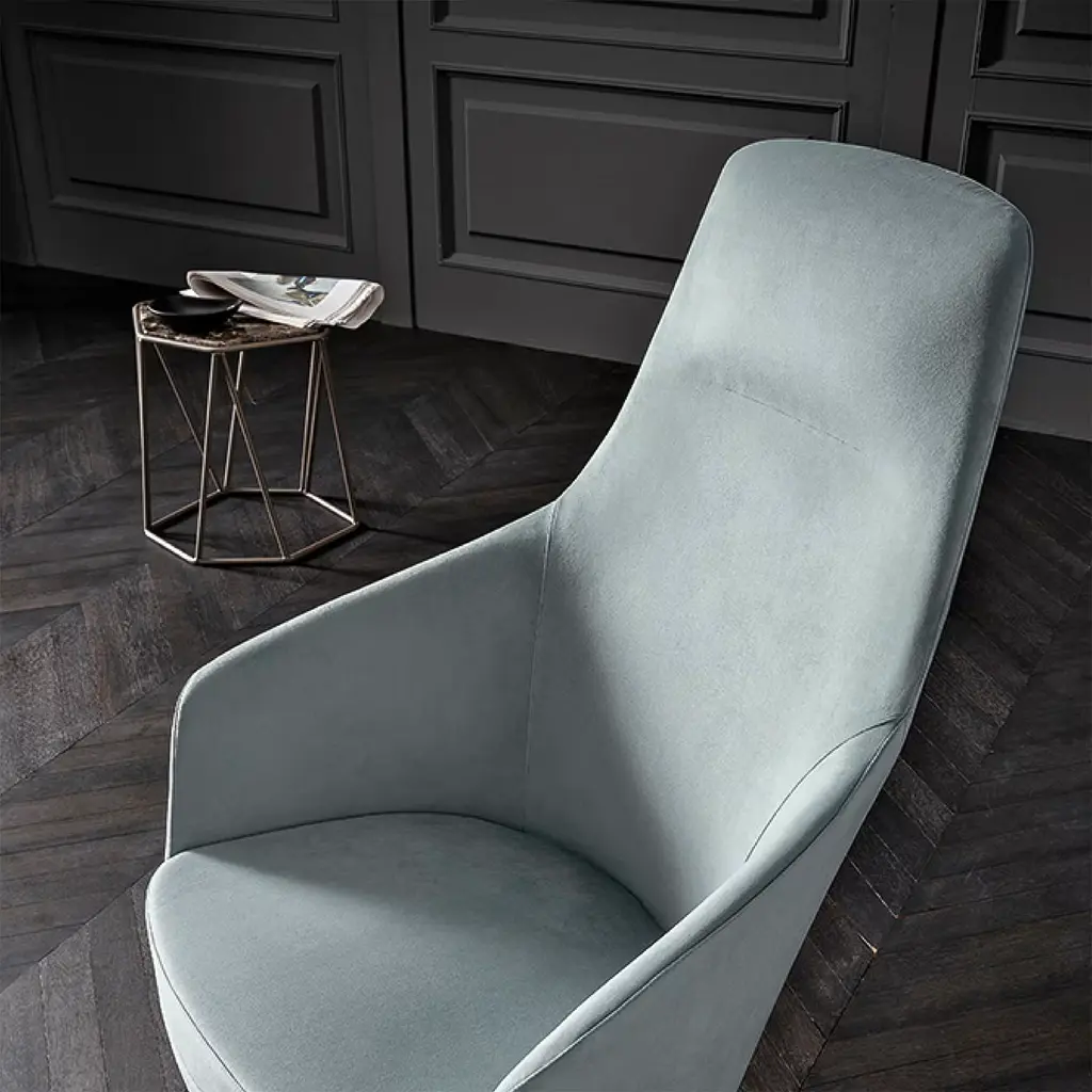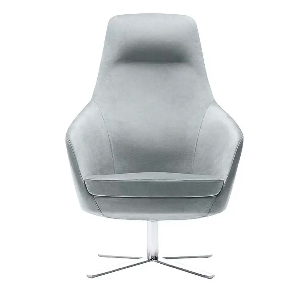 Any modern office or eclectic home will be splendidly accented by this armchair, showcasing a delicate light-blue upholstery wrapped around its elegant body outlined by seamless curves. Raised on a glaring base in chromed metal, the 42cm-high seat and backrest conceal a sturdy steel shell under rich padding in cold-foamed polyurethane for exceptional, long-lasting comfort. Available in multiple variants upon request to the Concierge.