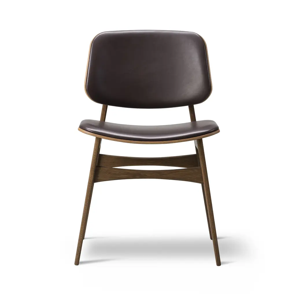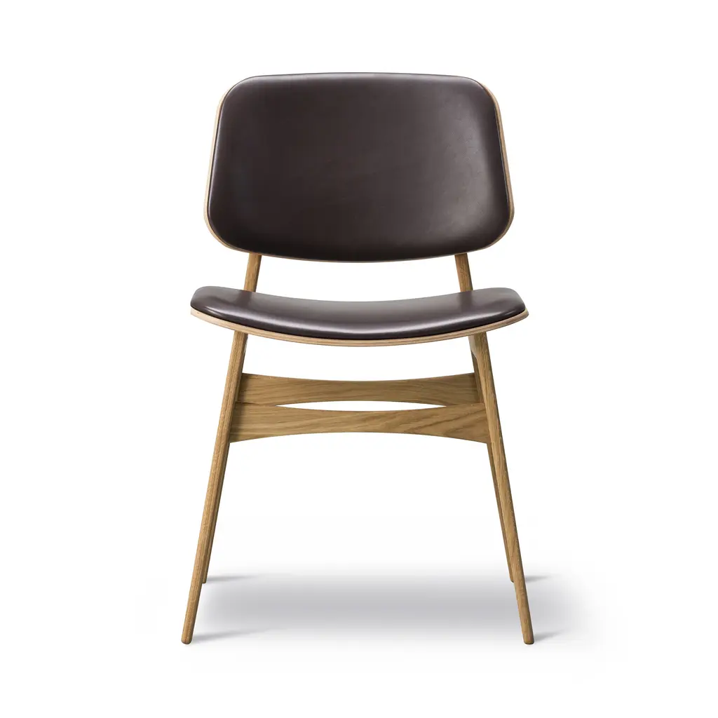 The Soborg Upholstered Chair from Fredericia Furniture offers comfort and versatility with its generous proportions and customizable upholstery. Suitable for various settings such as restaurants, meeting rooms, workspaces, or homes, an expertly crafted solid wood frame is accented by gracefully curved stretchers and rounded edges. Designed by Børge Mogensen in 1950, the chair's replaceable components make it a durable and sustainable choice. Highlights