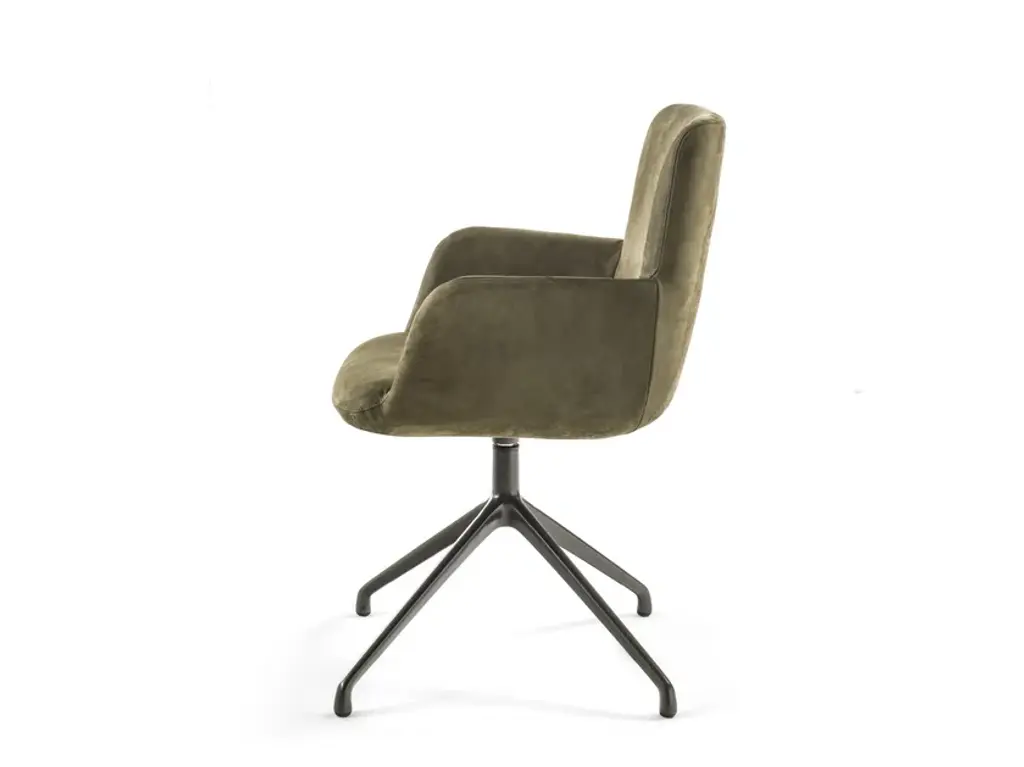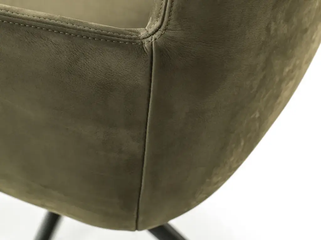 Soft Arm is a chair with enveloping structure made of polyurethane, backrest, seat and armrests covered with leather or fabric with visible stitching. Revolving aluminium base.AVAILABLE FINISHES:D1: fabric: canvas, divina melange 2, hallingdal 65, velvet harald, bouclè, milano M107, tokyo M115D2: fabric: mapleD3: leather: camoscio, cristalD4: leather: nabukD6: COL, COMB2: lacquered iron: irondustB3: lacquered iron matt brushed effect: aged bronze, stainless steel, titanium
