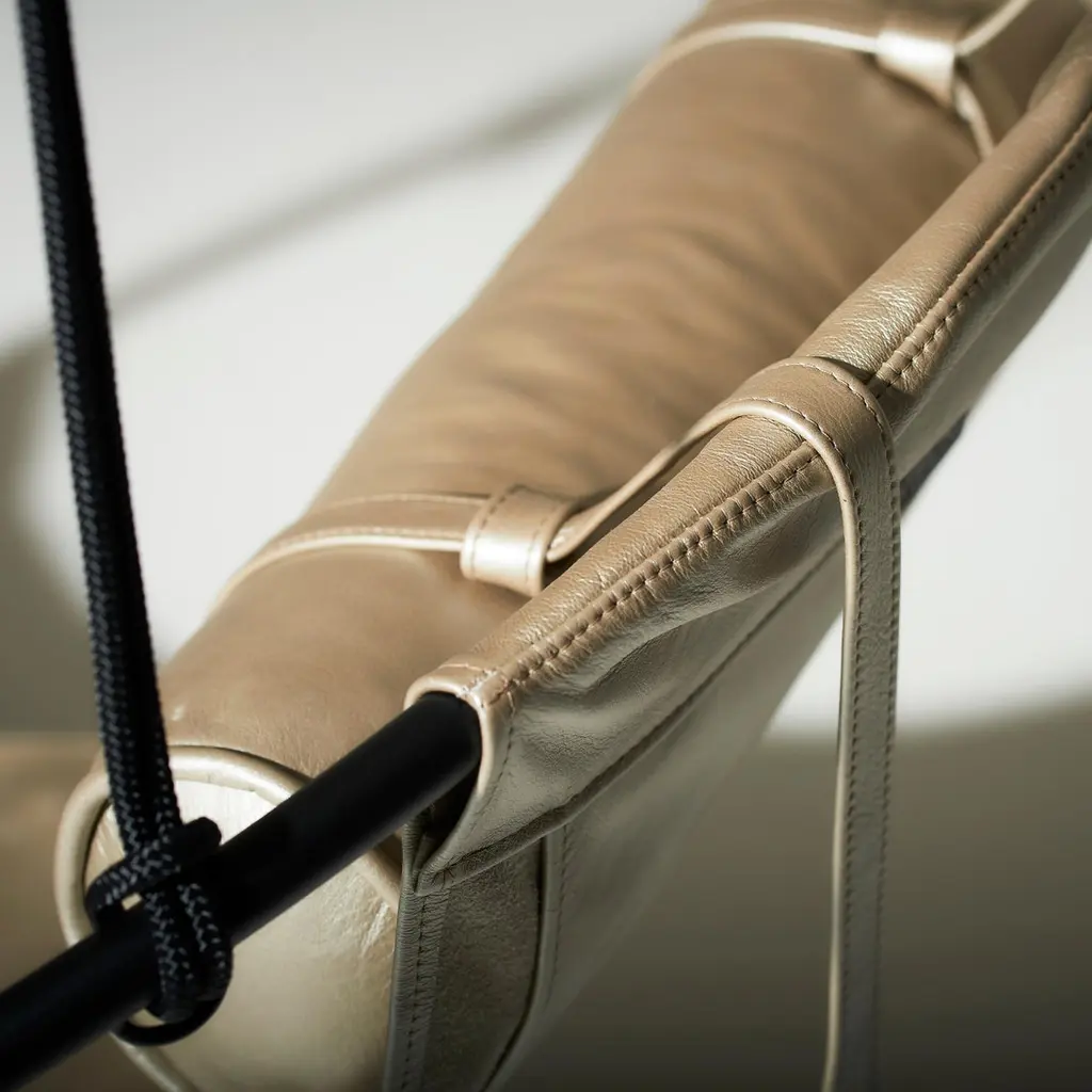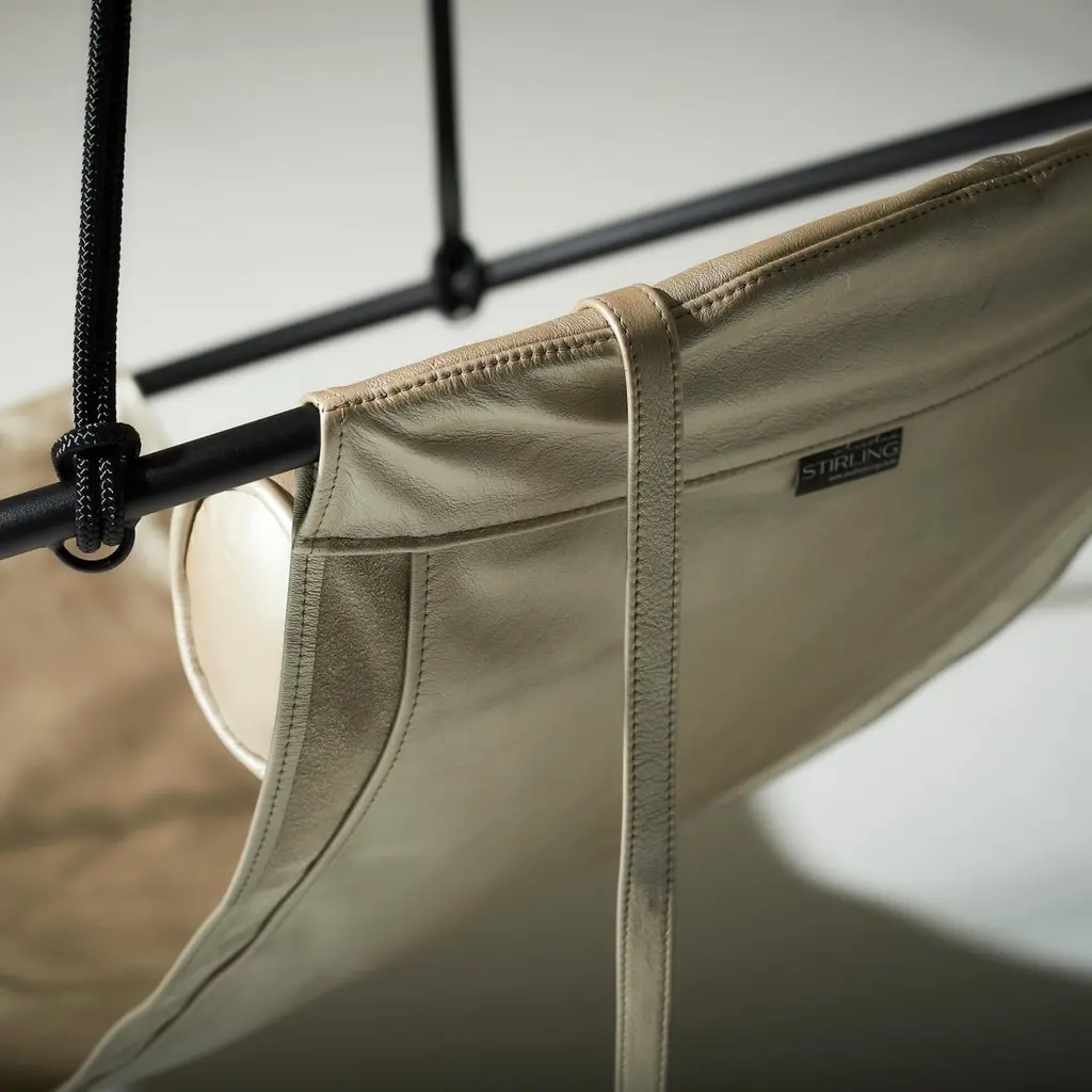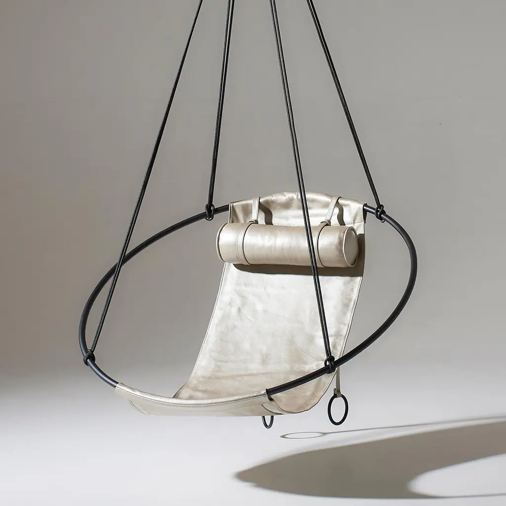 Stripped away from all excess, this hanging chair has a circular frame with the sheets of soft leather hanging loose within it, to create a sleek, sexy, and oh so comfortable experience. This chair’s clean lines and lightness makes it a perfect fit for any interior space. This chair is a laid-back favourite.Each one is handmade with care by our craftsmen using beautifully coloured pliable leather that is soft to the touch. The chair is made of a double layer of leather and lined with South African shwe-shwe material for extra strength.The beauty of leather is that each hide has natural markings and features, which means that each piece is unique, with its own personality. There might also be slight colour variations. The craftsmanship and skill of the artist’s hand therefore constitutes an inherent part of the making of your particular piece, a feature we celebrate as part of the creative process.As you live with your product, the leather will evolve. With the correct care, the appearance of your newly purchased piece will retain its beauty, developing its own character and patina.We support products that are created by hand, demonstrating the unique skill of the artisan and support one-of-a-kind pieces, and variance in design due to the process of hand crafting. In a world of homogenized mass production, slower designed, handmade products require less energy than mass-produced items and often last longer, reducing the cycle of waste in our “throw-away” culture.Hanging mechanisms are supplied in standard lengths, ready for installation. Contact us for:- available colour options- information on hanging options and standsA bolster / neck cushion in matching leather is included with the straps and weights to hold it in place – dependent on which ones we have in stock Beautiful Modern Minimal Contemporary and unique Made By Hand Disassembles and splits in half for flat packing – great in economising packing and freight Indoor & Under Cover Patio Maximum Capacity 120 kgs / 265 lbs Powder Coated Made from Rust Treated Mild Steel Made in South AfricaDimensions: L (arm to arm) x W (front to back) x H (top to bottom)100 cm x 100 cm x 35 cm Inches approx. 39.4" x 39.4'' x 13.8"Weight: 8kg / 18 lbs1 Year Warranty-Products to be free from defects in material and workmanship for a period of one (1) year from date of sale. Any product found to be defective within this time period may be returned to our factory, freight prepaid, with prior return authorization for repair or replacement.