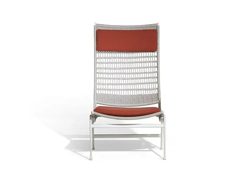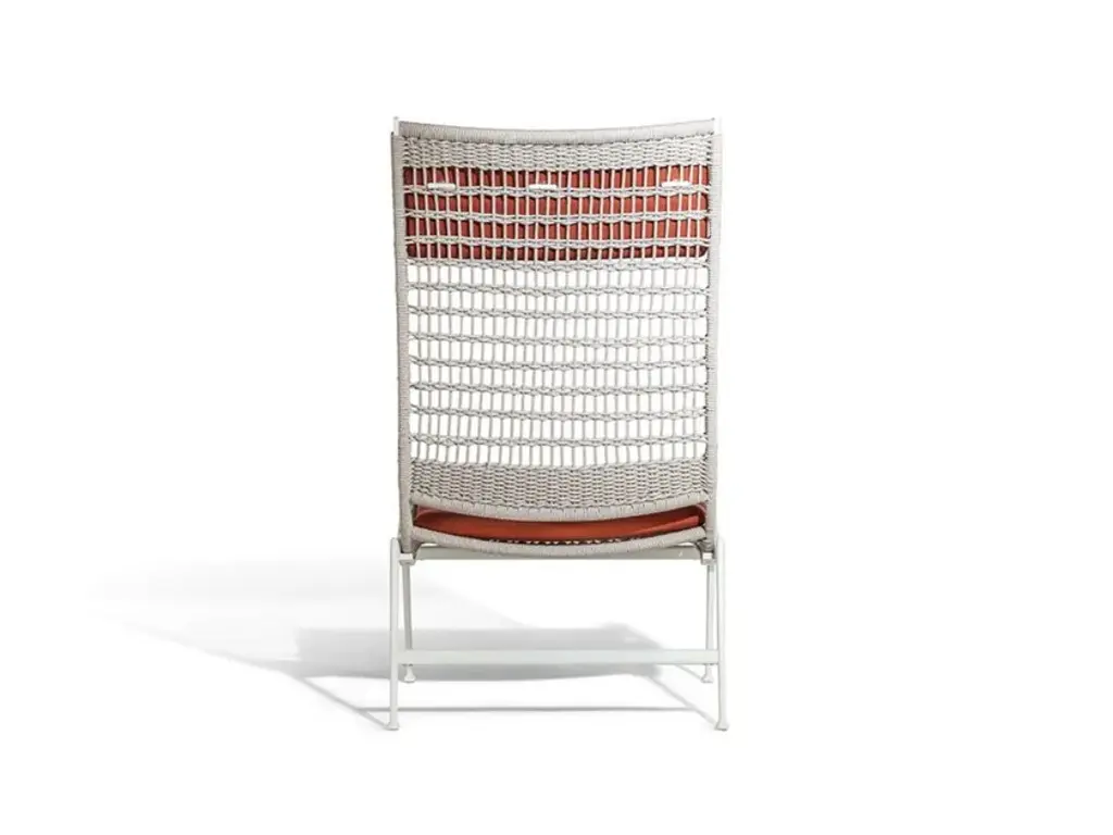 Outdoor furnishings witha made in Italy design and master craftsmanship, the high-back outdoor armchair with armrests encourages informal moments together, furnishing gardens, terraces, verandas, patios, rooftops, poolside areas and even yacht and ship decks.The distinguishing feature is the high backrest, where the handmade rope weave creates transparent effects, playing with light and shadow. It can be complemented with an outdoor cushion as a headrest or with a comfortable padded seat support. Part of the Solaria outdoor collection by Ludovica + Roberto Palomba, rounding off the range from the Poltrona Frau Boundless Living Outdoor Collections.
