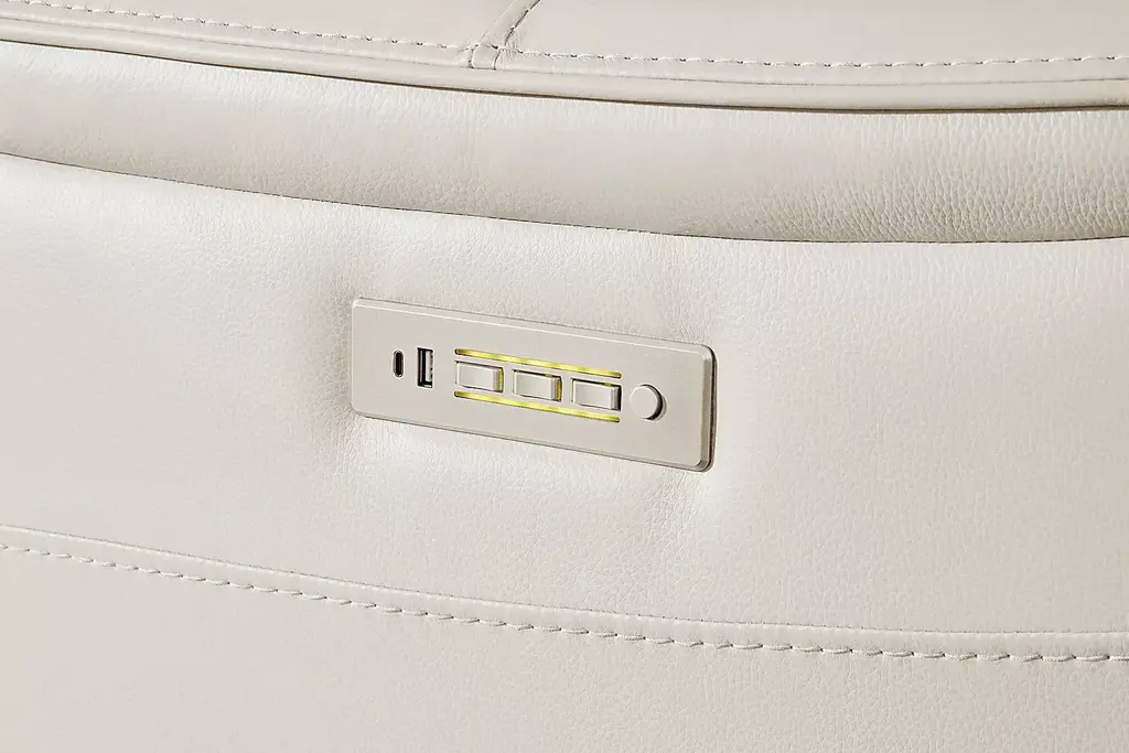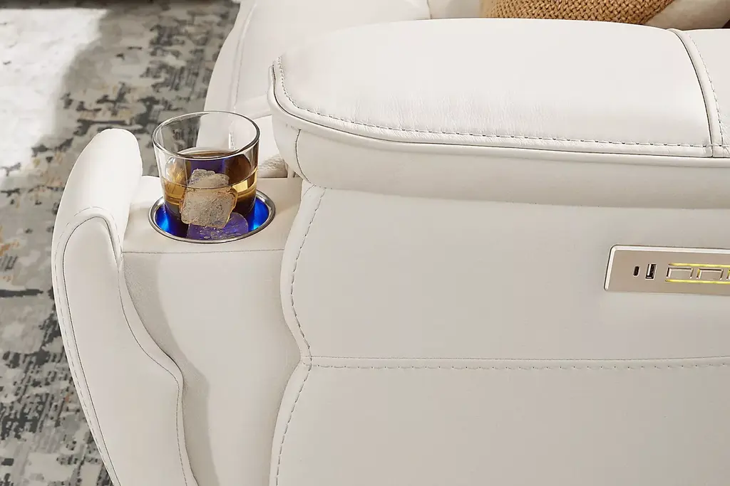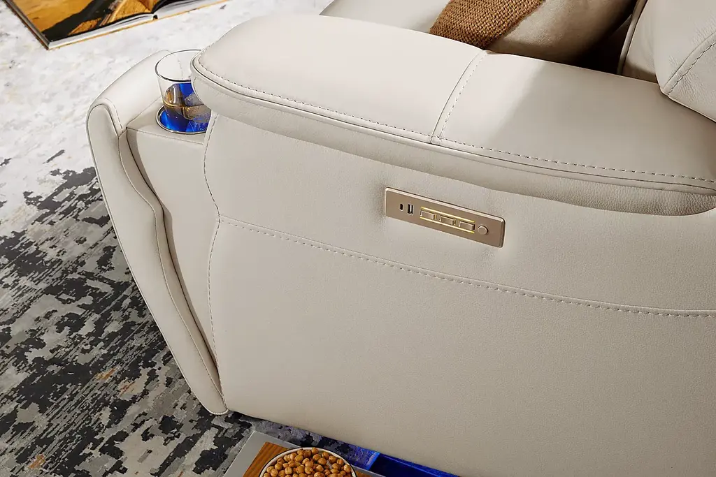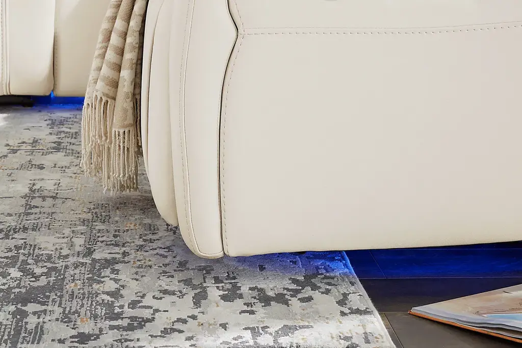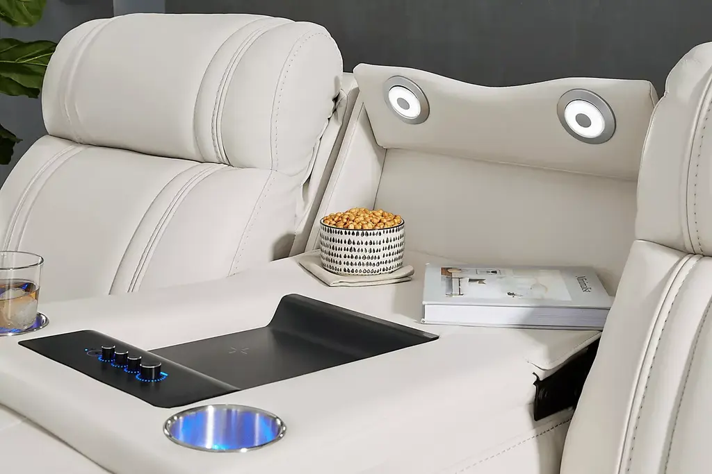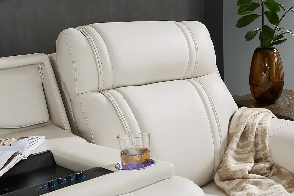 Commanding with bold style and breathtaking indulgence, the Sound Tech living room by Shaq opens endless horizons of entertainment and excitement to explore and share. Sumptuous ice-white leather where the body touches is accented with top-stitched designs that outline every curve. To escape into music, movies, and games, an array of full-range speakers and subwoofers inside the seat bases and arms envelop you in crystal clear surround-sound wireless audio while responsive vibration matches the action for a full-body sensory experience. Each reclining seat has its own advanced audio controls and lighted cupholders. These are hidden beside the wireless charging trays in the sofa fold-down table and the loveseat console. Triple power reclining offers adjustable lumbar supports, headrests and footrests as well as air massage and a zero gravity mechanism for total relaxation. USB ports appear on each motion switch, and baserail theater lighting offers a classy touch. Upholstery: Top grain leather where the body touches and polyurethane fabric sides and backs. Leather is a durable, low maintenance product, however, general regular maintenance is necessary. To keep your leather clean, vacuum it regularly, removing any dust, and clean it with water and a mild non-detergent soap. Accent pillows not included.