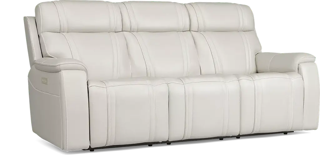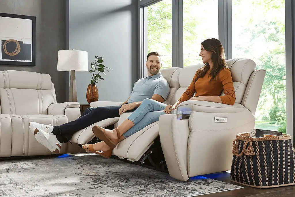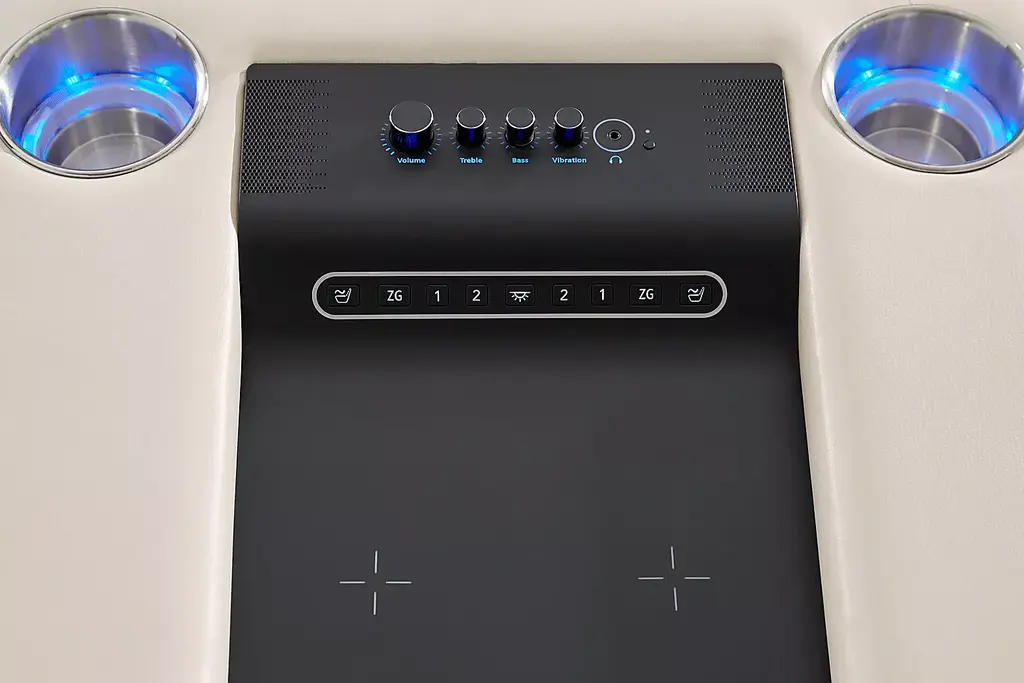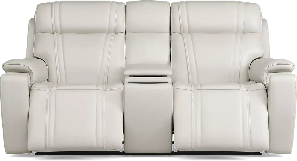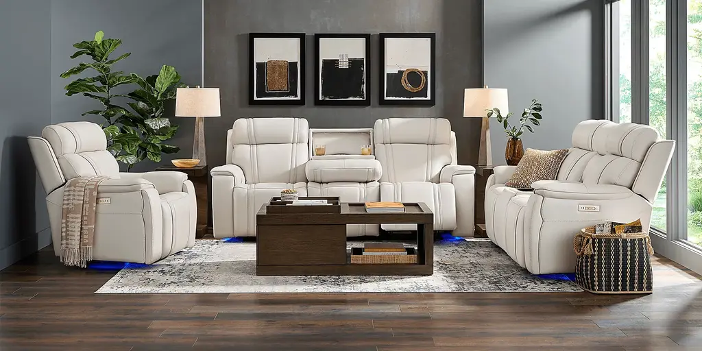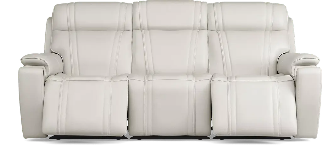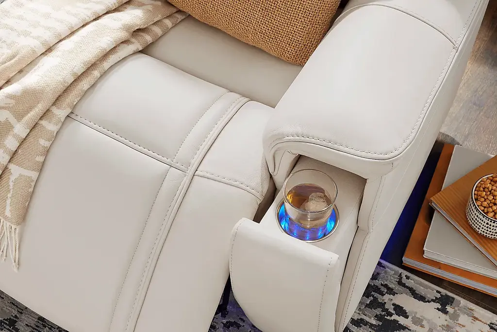 Commanding with bold style and breathtaking indulgence, the Sound Tech living room by Shaq opens endless horizons of entertainment and excitement to explore and share. Sumptuous ice-white leather where the body touches is accented with top-stitched designs that outline every curve. To escape into music, movies, and games, an array of full-range speakers and subwoofers inside the seat bases and arms envelop you in crystal clear surround-sound wireless audio while responsive vibration matches the action for a full-body sensory experience. Each reclining seat has its own advanced audio controls and lighted cupholders. These are hidden beside the wireless charging trays in the sofa fold-down table and the loveseat console. Triple power reclining offers adjustable lumbar supports, headrests and footrests as well as air massage and a zero gravity mechanism for total relaxation. USB ports appear on each motion switch, and baserail theater lighting offers a classy touch. Upholstery: Top grain leather where the body touches and polyurethane fabric sides and backs. Leather is a durable, low maintenance product, however, general regular maintenance is necessary. To keep your leather clean, vacuum it regularly, removing any dust, and clean it with water and a mild non-detergent soap. Accent pillows not included.