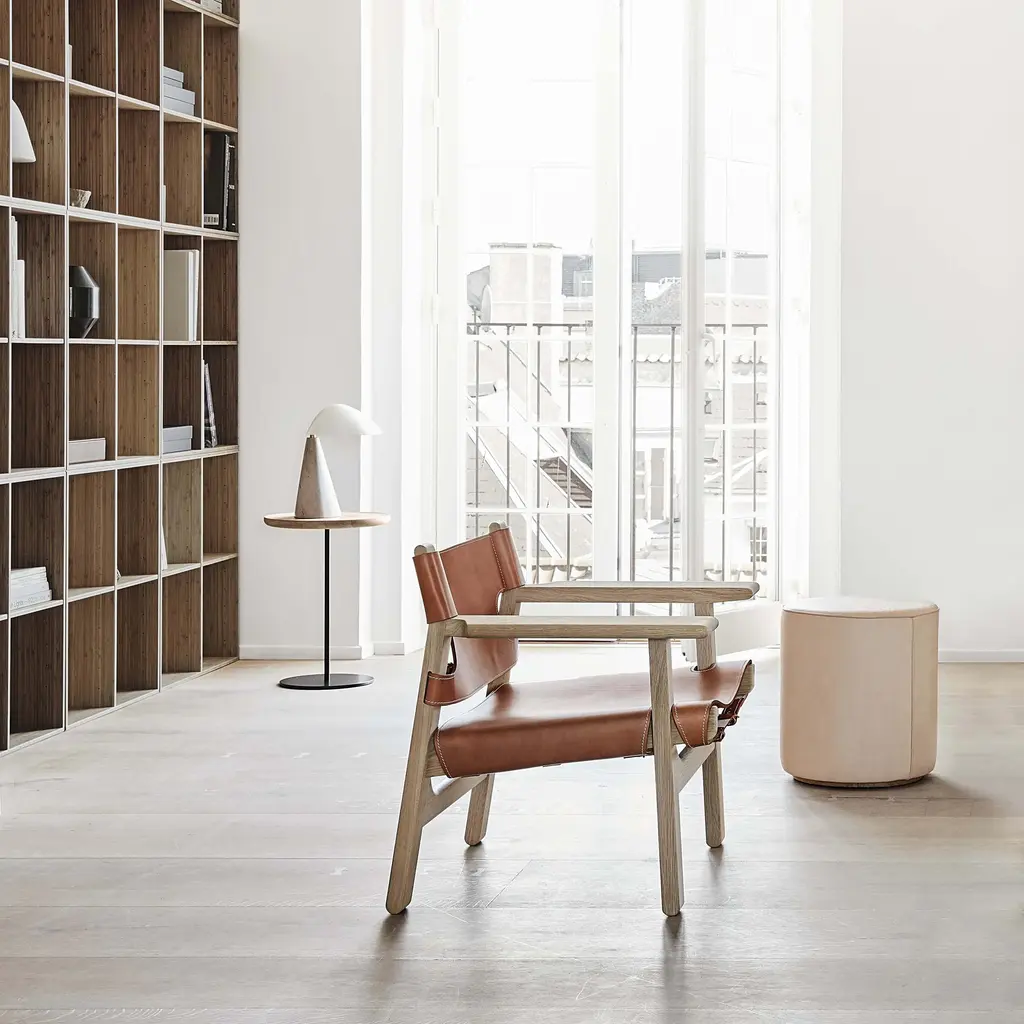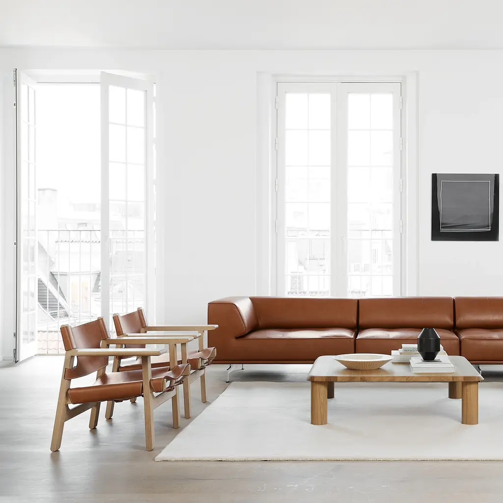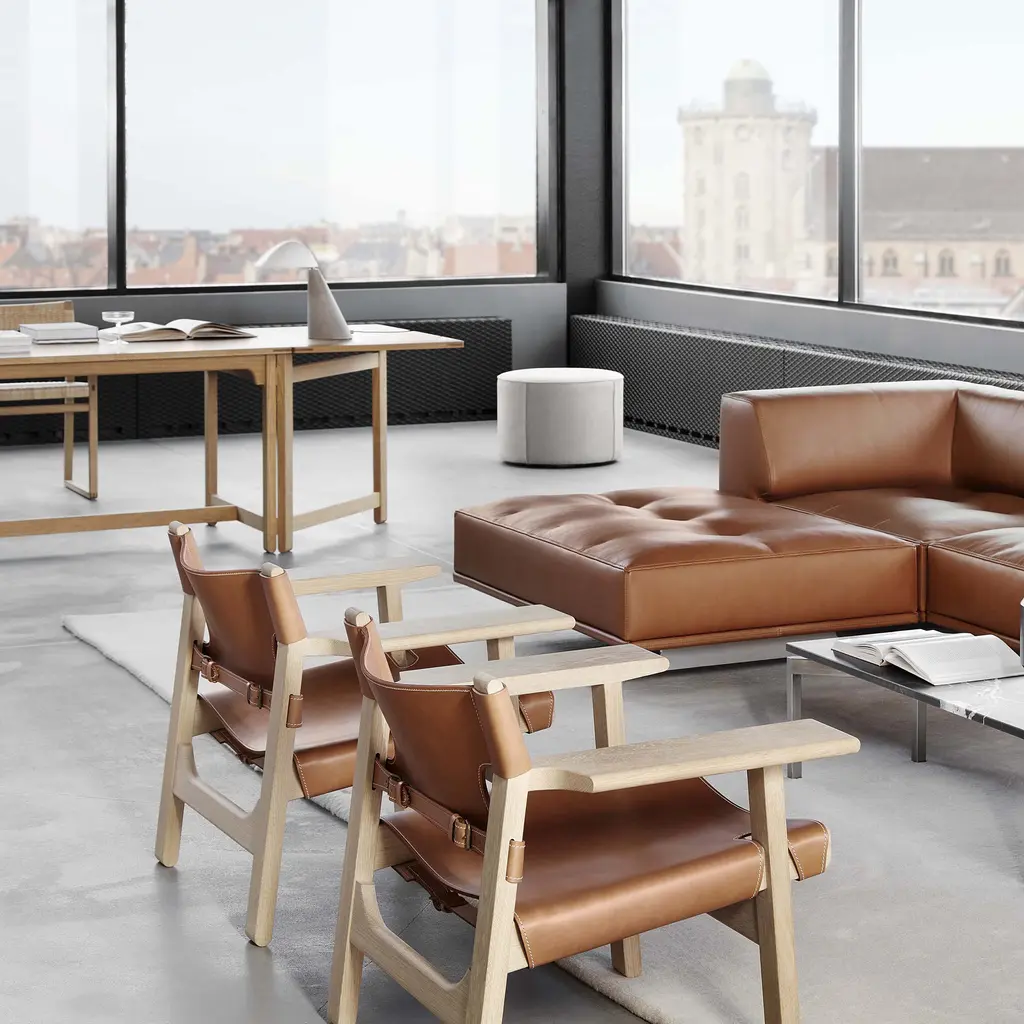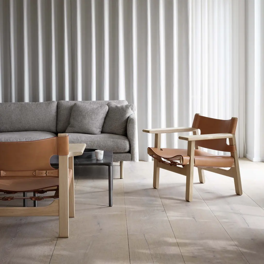 Showcasing a sling-style seat crafted from buttery soft leather, the Spanish Lounge Chair from Fredericia Furniture presents a firm seat while gently cradling you as you relax in style. Designed with exaggerated proportions and equestrian-inspired style, the wide-set arms act as the perfect perch to rest an ice-cold drink or favorite book with ease. Highlights