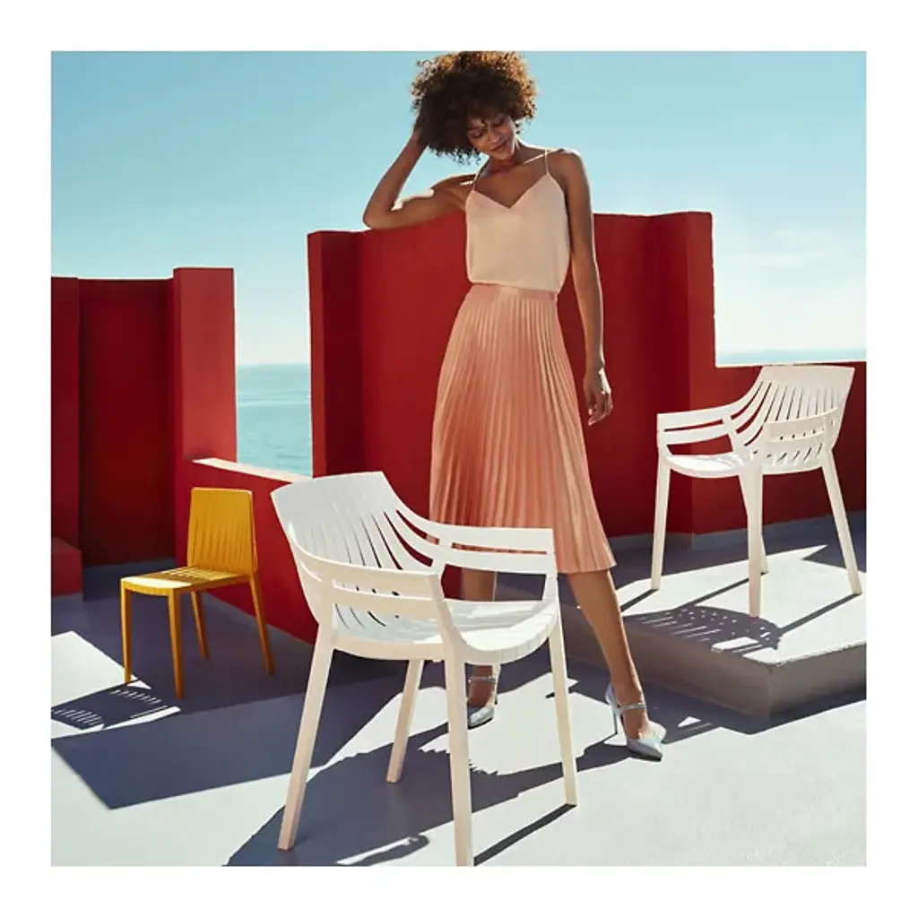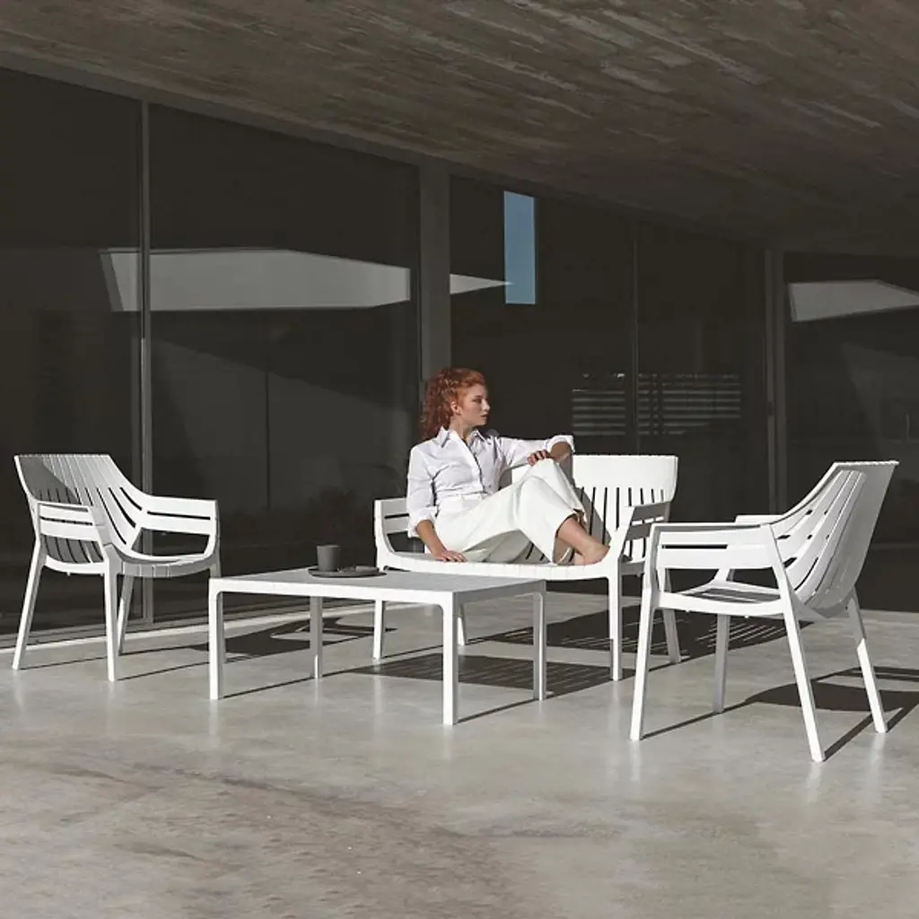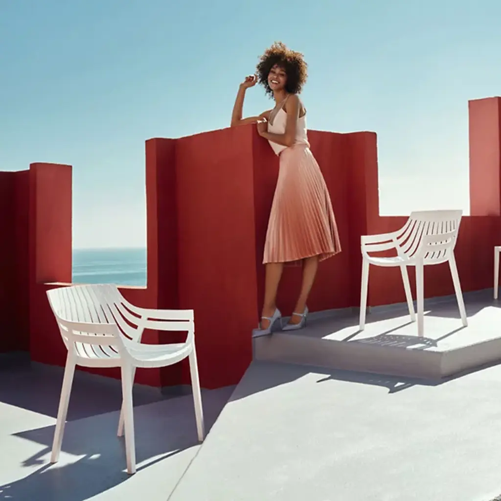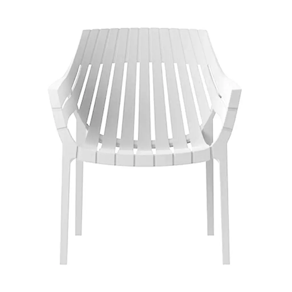 Relax into the contoured and refined simplicity of the Spritz Outdoor Lounge Chair from Vondom. A stylish and sleek-surfaced structure created by Archirivolto and inspired by the wooden fences near beaches, its four-legged frame is made in Spain from injected polypropylene with fiberglass. This robust construction is solid enough for outdoor environments and smoothly finished enough for inside display, while the sleek legs support a rounded shell seat of slightly spaced slats that draw the eye and promote a sense of ease.