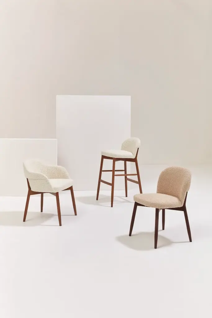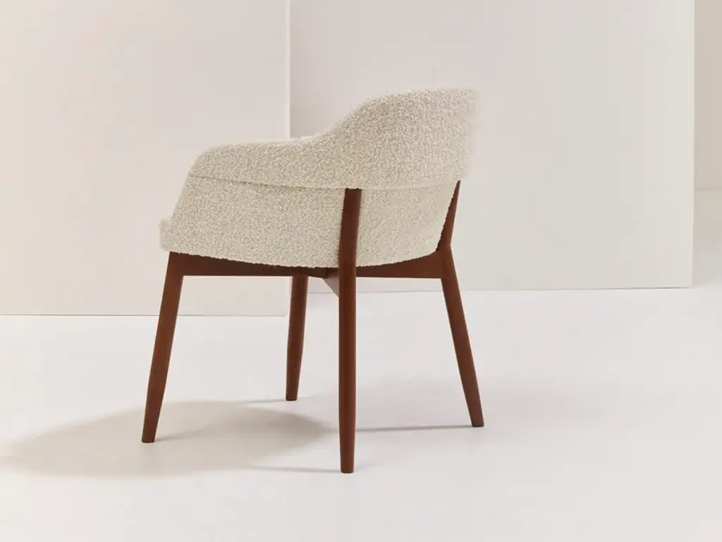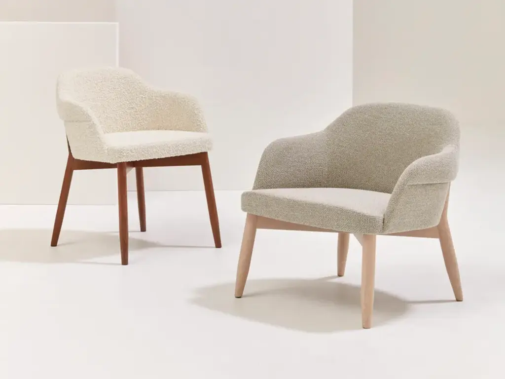 Spy 650 is an upholstered armchair with armrests, featuring a solid beech wood frame.Spy is a broad and complete collection of armchairs, tables, and coffee tables.The leitmotif is the design of the leg, which tapers to a point and flares out slightly.A distinctive stylistic feature of the seats is the craftsmanship of the shell, which is at its best at the back, folding inward to embrace the rear legs.There are four armchair models available, ranging from the elegant small armchair to the cozy and comfortable bergère.In addition to the wooden base, a metal version shaped to fit the upholstered shell is also available.