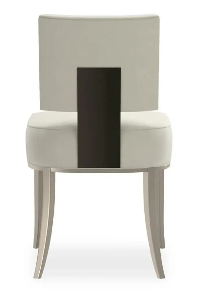 This contemporary side chair takes on dramatic style when you view the wide panel that shines off its back. Neutral fabric fully surrounds the square upper back and seat cushion that rest on an exposed wood frame, sabre legs and gracefully curving arms finished in Soft Silver Paint. This is a low, klismos chair with truly polished appeal.