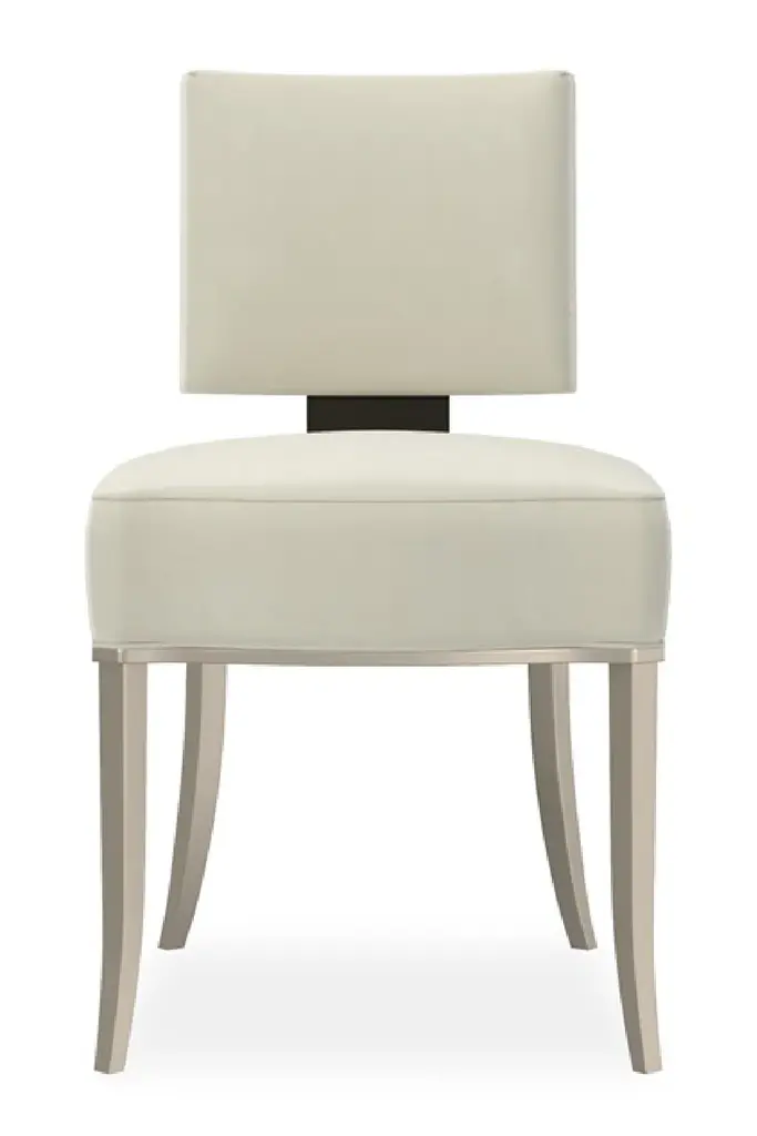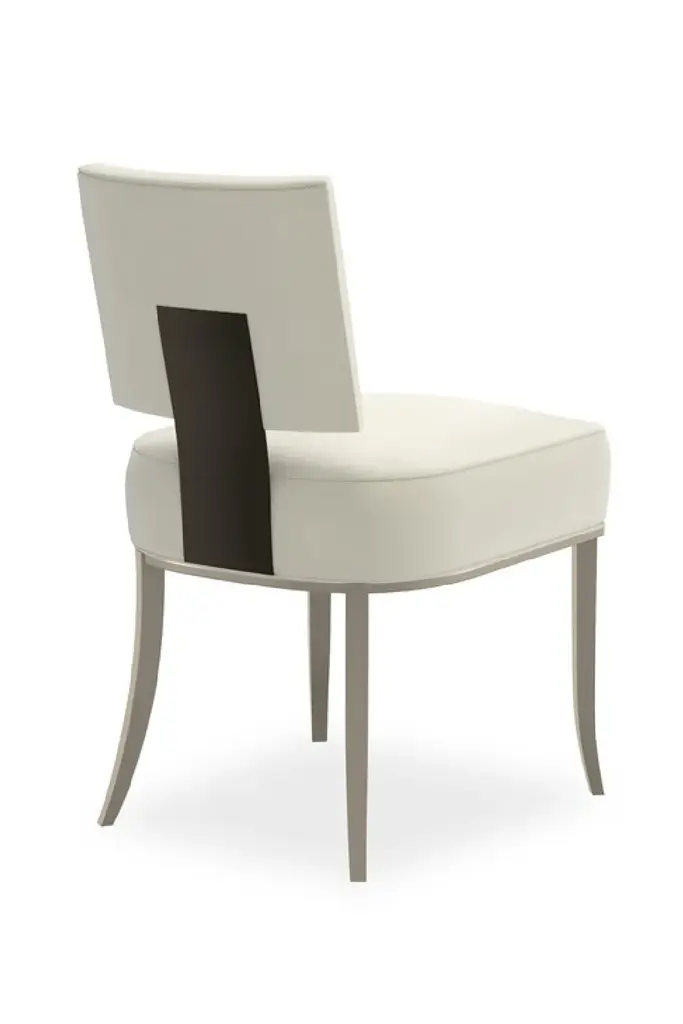 This contemporary side chair takes on dramatic style when you view the wide panel that shines off its back. Neutral fabric fully surrounds the square upper back and seat cushion that rest on an exposed wood frame, sabre legs and gracefully curving arms finished in Soft Silver Paint. This is a low, klismos chair with truly polished appeal.