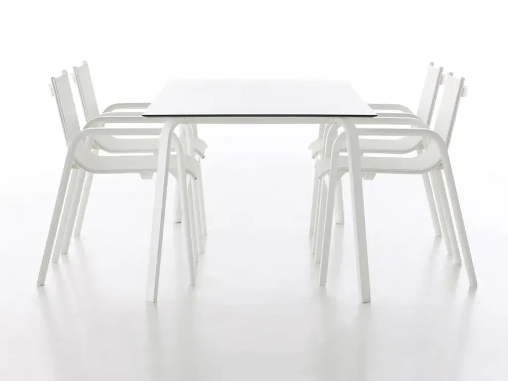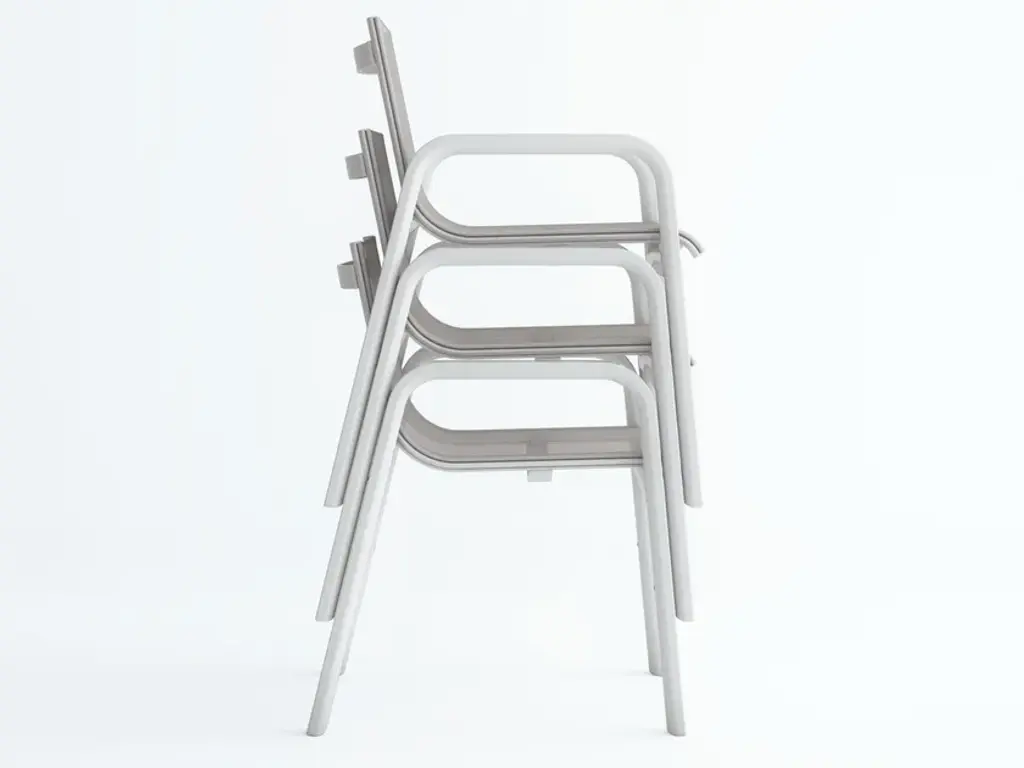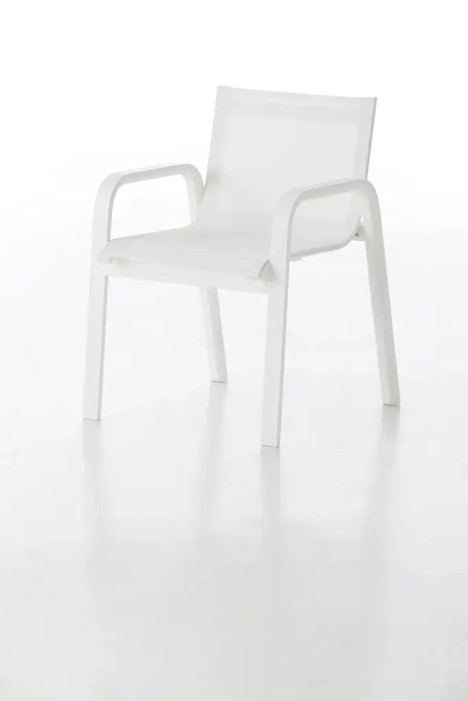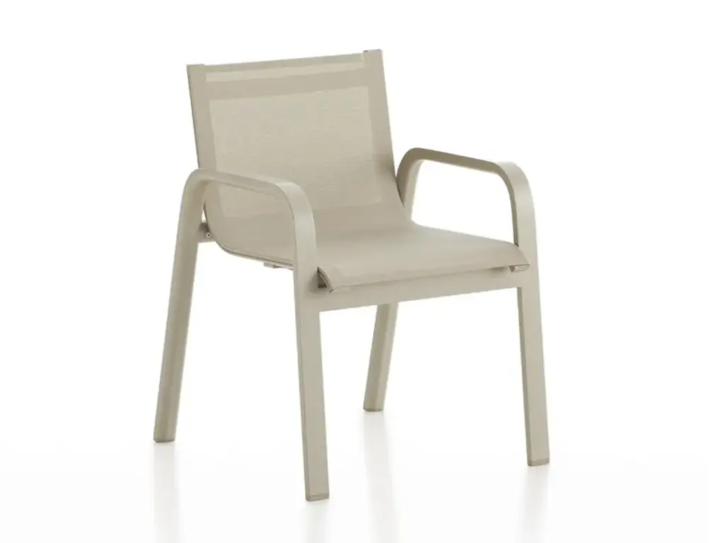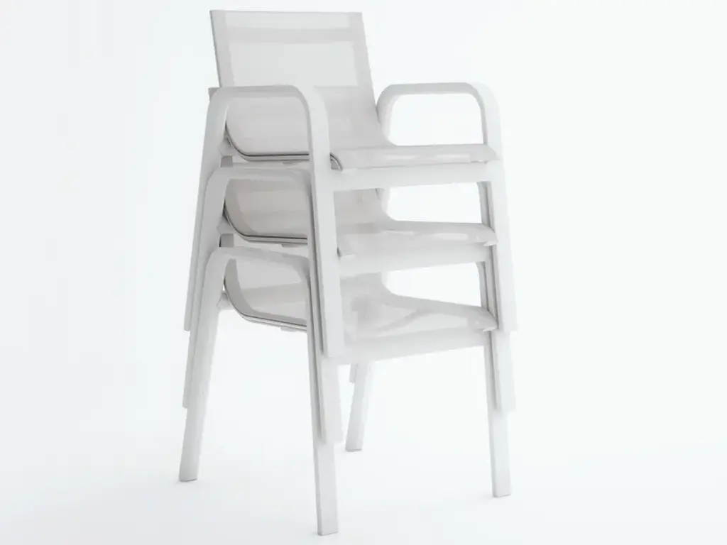 The STACK armchair is an outdoor armchair made from thermo-lacquered aluminium sections. Its light and subtle structure seems to be floating, and it has a self-supporting fabric element moulded to it.Elegance, balance, lightness and comfort.This airy and versatile contemporary designed armchair complements the other pieces in the collection, and, due to its formal sobriety, can also be diversely combined with outdoor chairs, moods and spaces.“Stack is a stackable outdoor furniture collection inspired by the nautical world with design elements reminiscent of the 1960’s and 1970’s. The collection’s clean and straightforward structures along with the materials used give shape to simple, balanced and incredibly light pieces. GANDIABLASCO’s innovative design uses self-supporting fabric over the extruded aluminum body to provide a simple construction with lightness and comfort. The Stack collection is ideal for both large contract installations as well as small residential projects.”Made of thermo-lacquered aluminium profiles, phenolic plate and Batyline fabric. Mats are covered with water-repellent fabric. Removable fabric cover.Model 3, Model 4, Model 5 and Model 6 made of therm-lacquered aluminium profiles and stiff polyurethane.Collections colour sample: white, agate grey, cement grey, sand, bronze, wine red, blue grey, grey blue, anthracite and black.Fabric colours: white, grey, stone, camel, green, sand, bronze, terracotta, blue and anthracite.