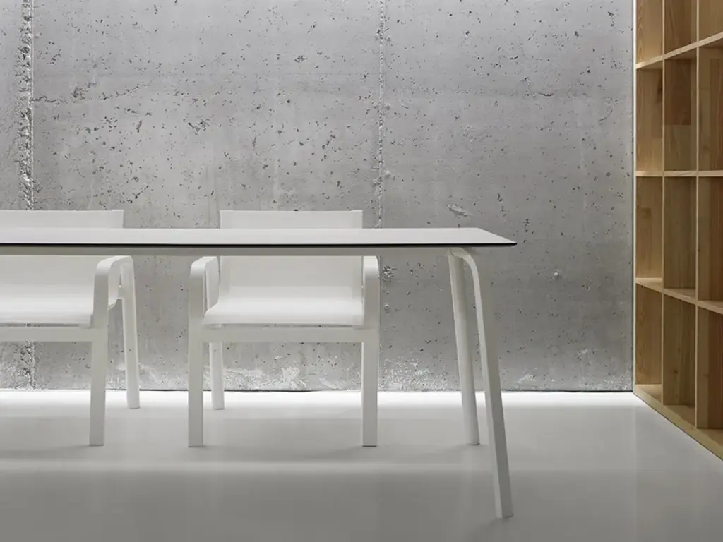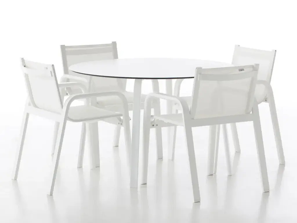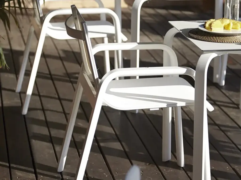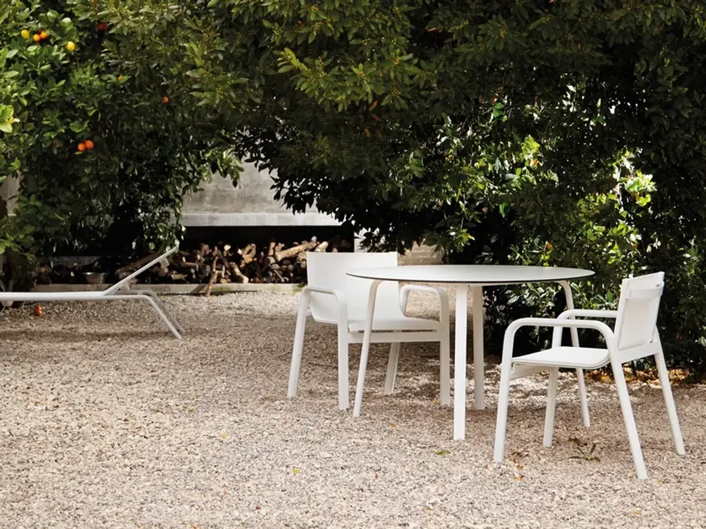 The STACK armchair is an outdoor armchair made from thermo-lacquered aluminium sections. Its light and subtle structure seems to be floating, and it has a self-supporting fabric element moulded to it.Elegance, balance, lightness and comfort.This airy and versatile contemporary designed armchair complements the other pieces in the collection, and, due to its formal sobriety, can also be diversely combined with outdoor chairs, moods and spaces.“Stack is a stackable outdoor furniture collection inspired by the nautical world with design elements reminiscent of the 1960’s and 1970’s. The collection’s clean and straightforward structures along with the materials used give shape to simple, balanced and incredibly light pieces. GANDIABLASCO’s innovative design uses self-supporting fabric over the extruded aluminum body to provide a simple construction with lightness and comfort. The Stack collection is ideal for both large contract installations as well as small residential projects.”Made of thermo-lacquered aluminium profiles, phenolic plate and Batyline fabric. Mats are covered with water-repellent fabric. Removable fabric cover.Model 3, Model 4, Model 5 and Model 6 made of therm-lacquered aluminium profiles and stiff polyurethane.Collections colour sample: white, agate grey, cement grey, sand, bronze, wine red, blue grey, grey blue, anthracite and black.Fabric colours: white, grey, stone, camel, green, sand, bronze, terracotta, blue and anthracite.