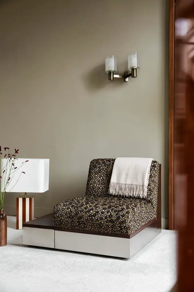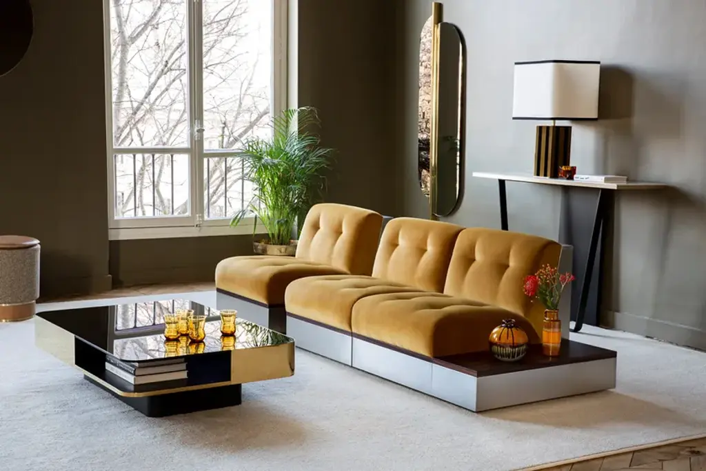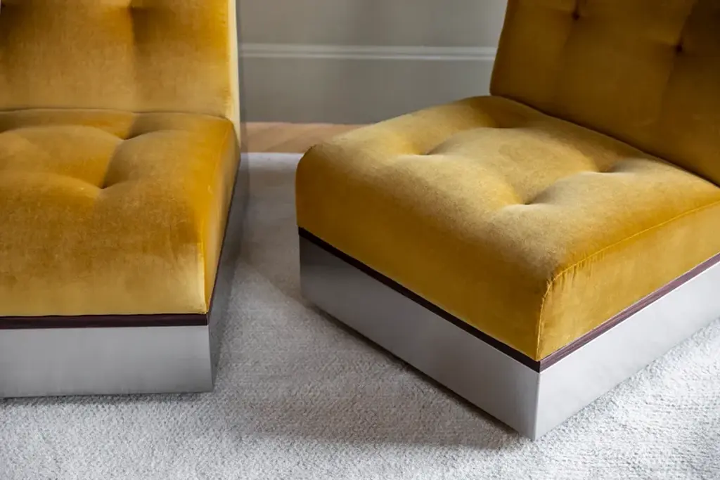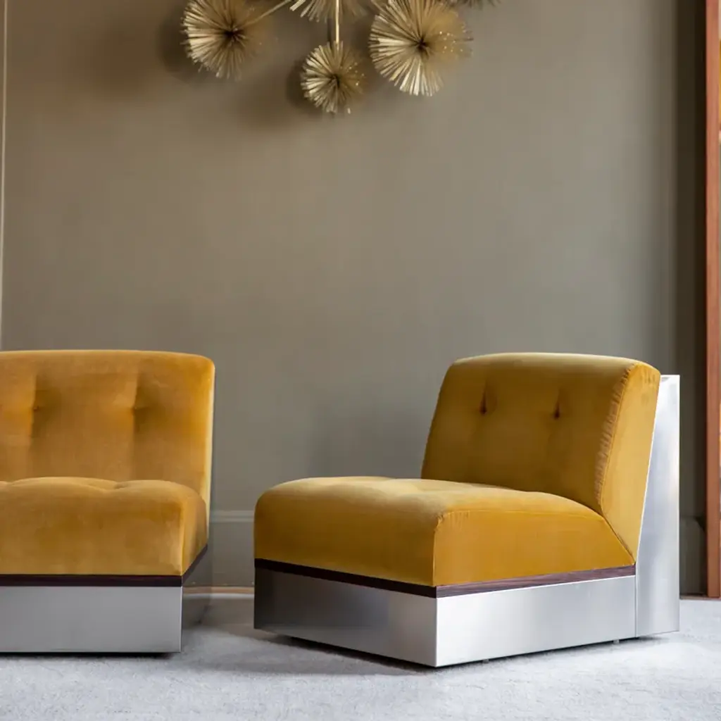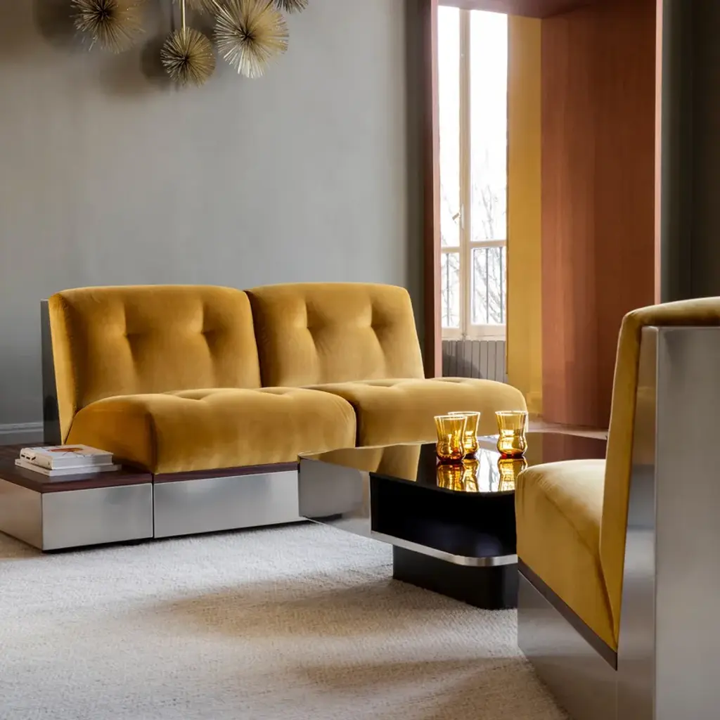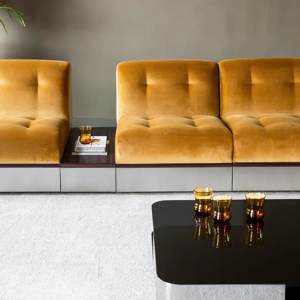 Stanley is a modular fabric and stainless steel armchair.Stainless steel frame. Rosewood frame. Expanded polyurethane foam.Also in the corner version.Well-built design accented by stainless steel and rosewood to be modulated according to the client's desires. With its retro Sci-Fi lines and generous volumes, the new Stanley collection is an ultra-comfortable trip back to the 1970s. The Stanley sofa and armchair are endlessly adaptable and are experienced in "lounge mode".