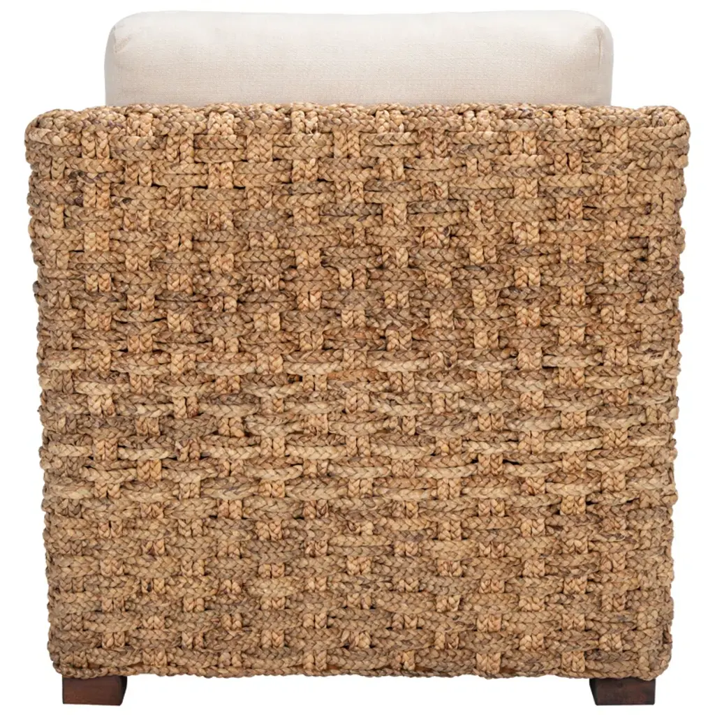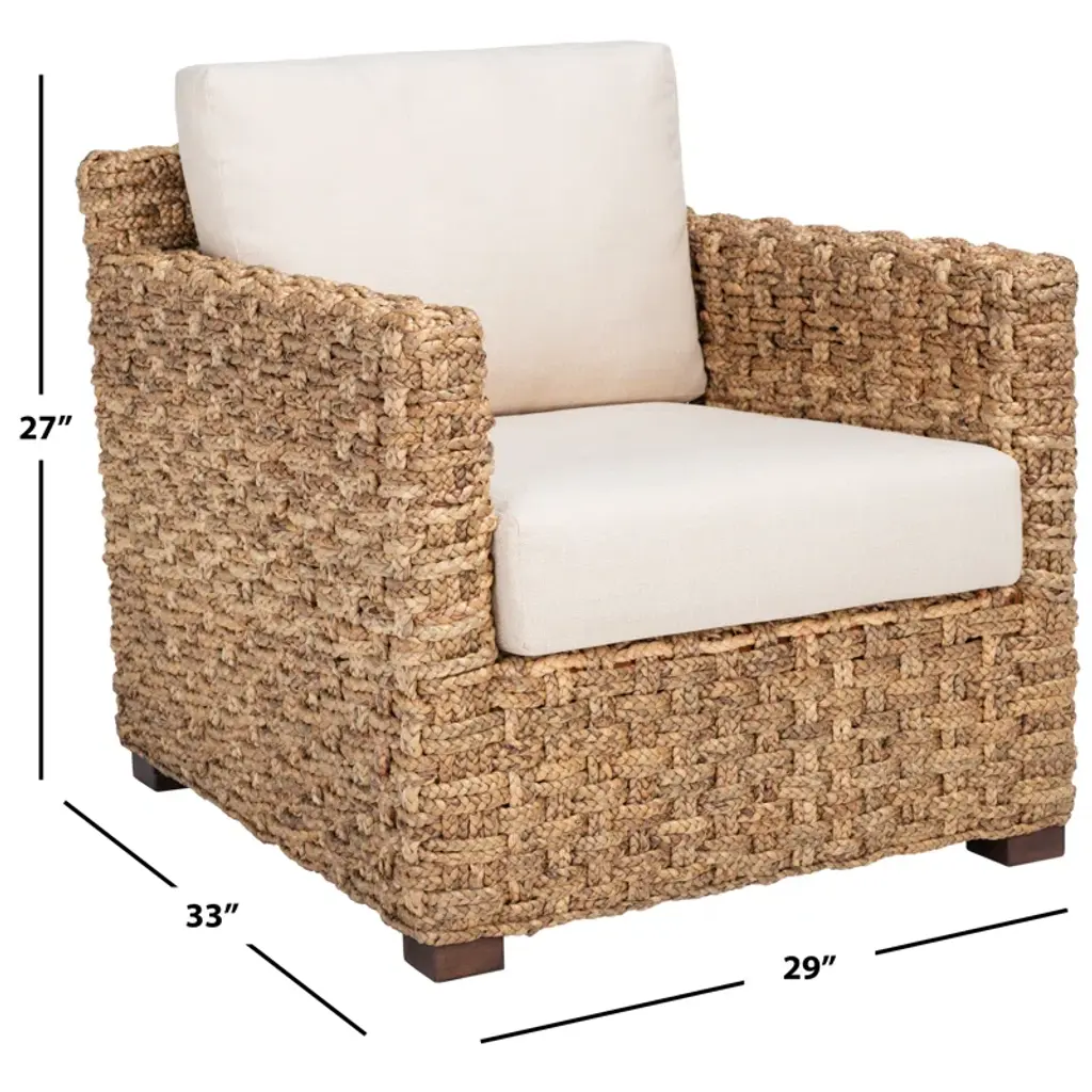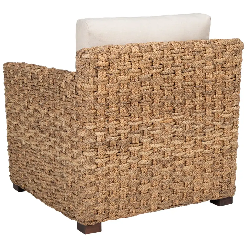 Bring a touch of British Colonial ambiance to your décor with this Steiner accent chair. A tropical twist on the classic arm chair, Steiner braided natural water hyacinth detail is absolutely stunning, and plush beige cushions emanate luxurious coastal calm.