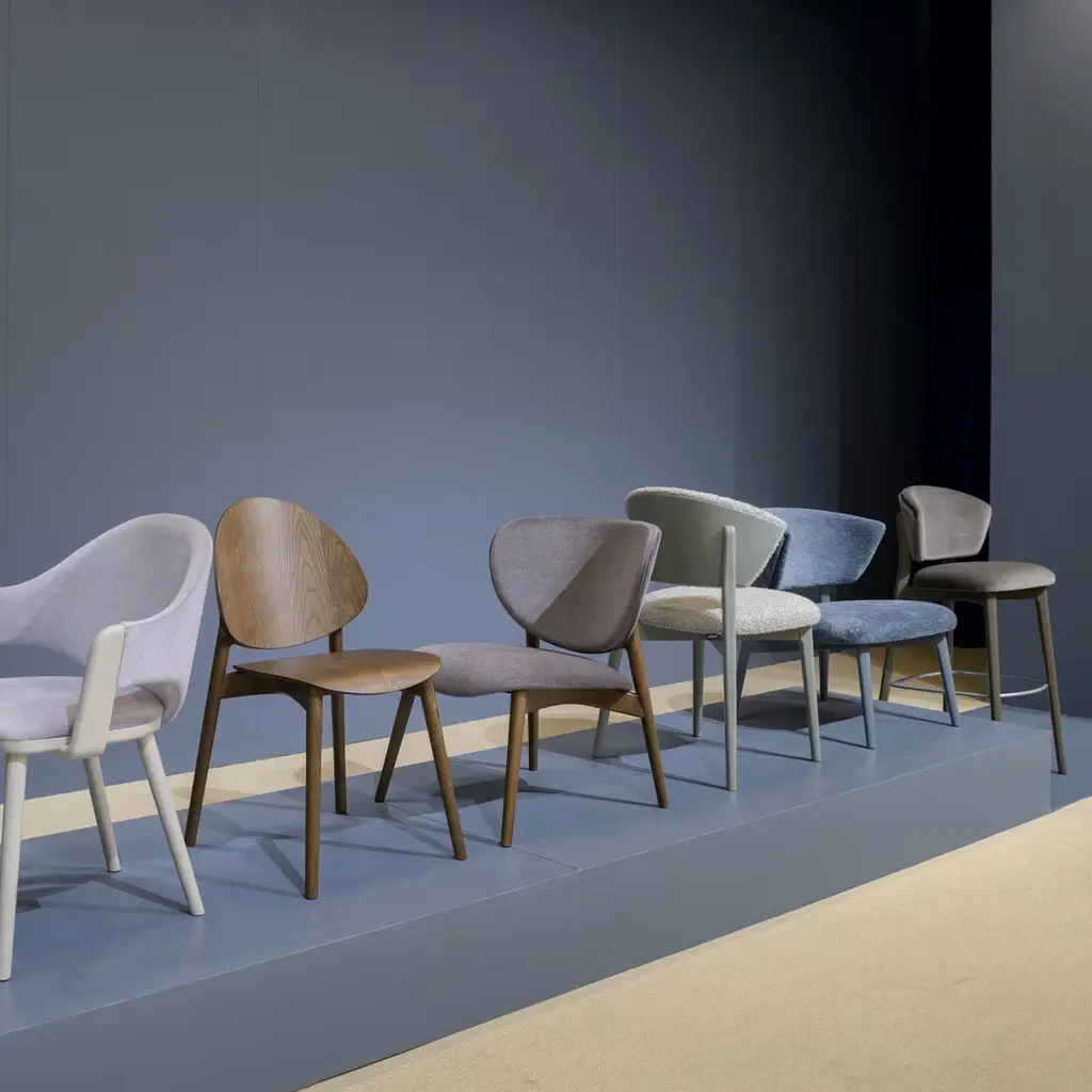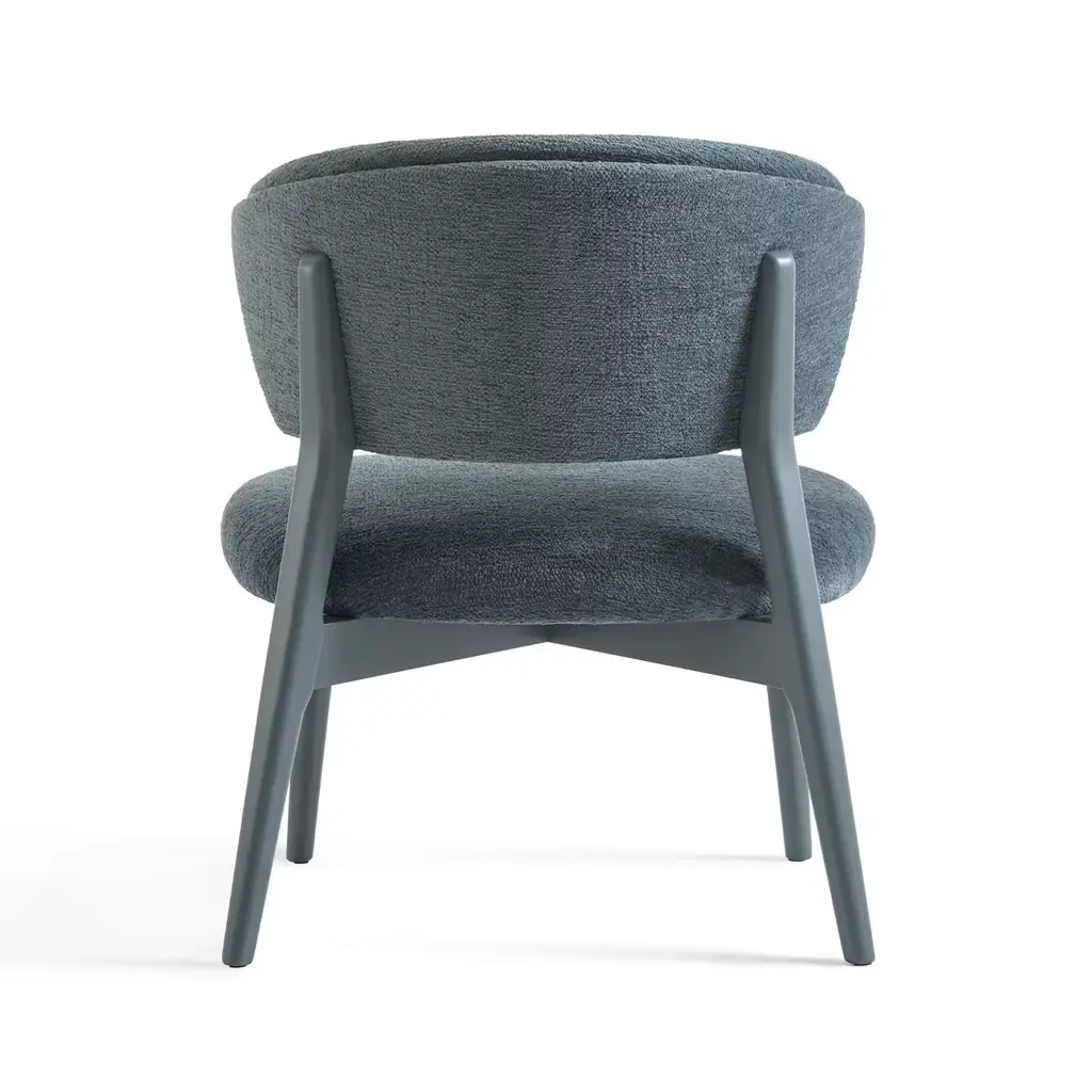 Stella 823 by Matteo Ragni is a lounge chair characterized by a distinctive enveloping backrest that ends with two sharp cuts inspired by star points, designed for contract environments. It features a generous padding on the seat and backrest for enhanced comfort. The structure is finished in a muted blue tone, with upholstery in nevada fabric. Its solid and reassuring presence fits discreetly into various interiors.