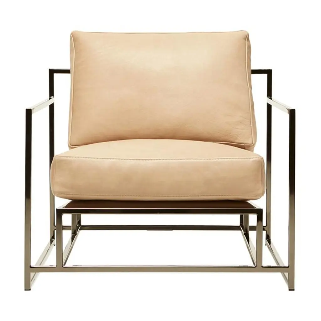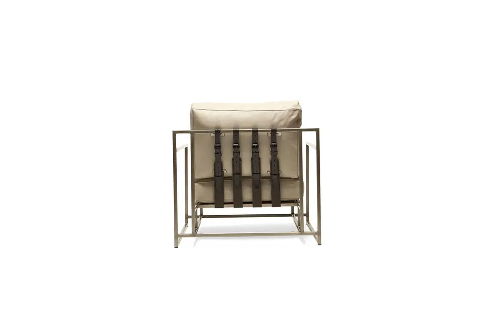 The Inheritance Armchair by Stephen Kenn is as comfortable as it is unique. The design features an exposed construction composed of three elements - a steel frame, plush upholstery, and supportive belts. The deep seating area is perfect for a relaxing lounge experience. Every Stephen Kenn piece is made to order through our Los Angeles studio in partnership with a number of small businesses and fabricators in the LA area. With this highly customizable armchair you can select from a wide range of finishes and materials to complement your home and lifestyle - please message us to see our Customization Guide with all available options.This version of our Inheritance Armchair is upholstered in cream leather by Moore & Giles. The foam seat cushion has been wrapped in down for added comfort and sits atop an antique nickel frame. The armchair is strapped with support belts featuring charcoal cotton webbing, black leather, and blackened steel buckles.