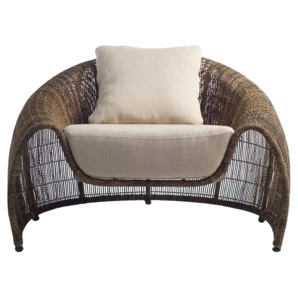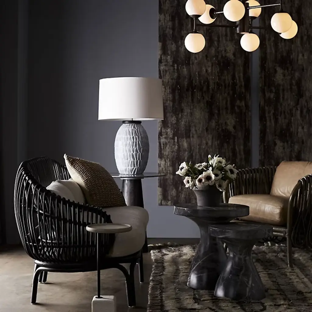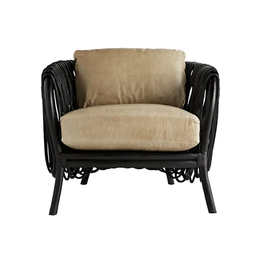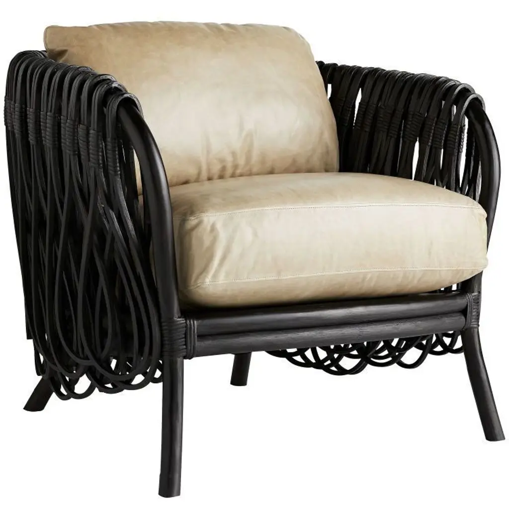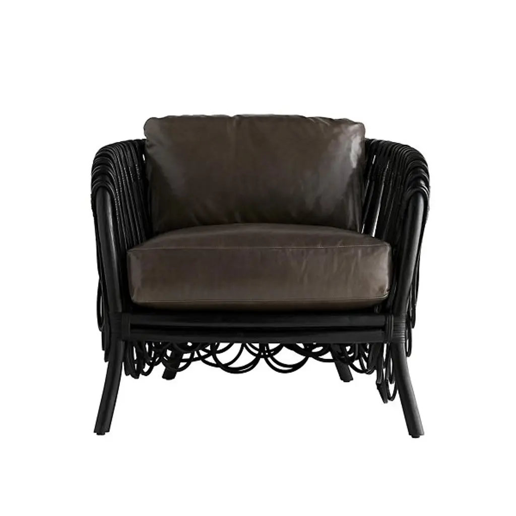 Organic, luxurious, and comfortable. The Strata Lounge Chair from Arteriors features a strong core that’s made out of Rattan poles, which are bent into an alluring, curving silhouette. These Rattan poles feature a deep, Black finish, while the Leather cushions are Graphite. This product’s most distinguishing feature, however, is the series of square cut strips of Rattan that form loops dangling over the edges of the arms and back for a unique and eye-catching appearance.