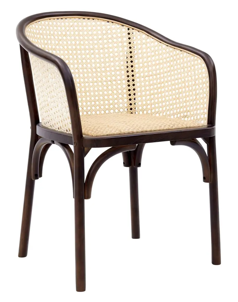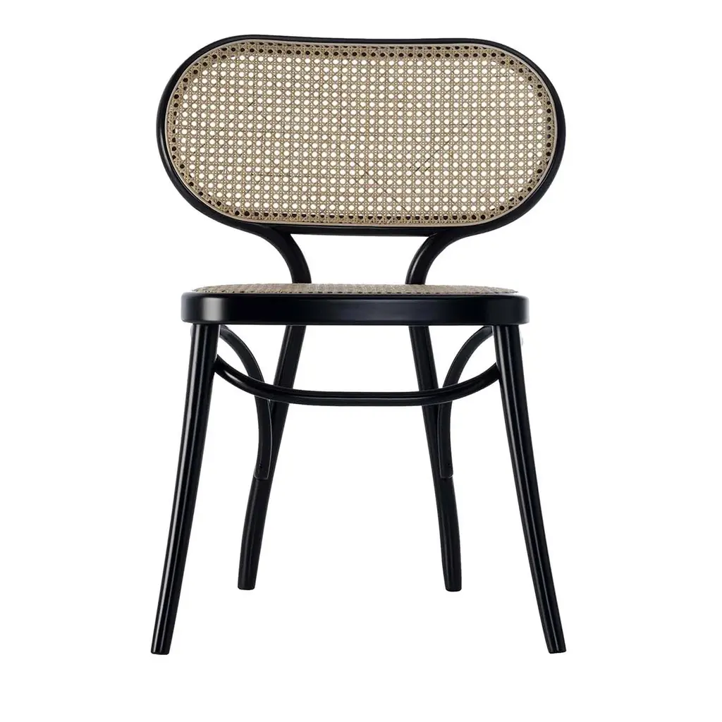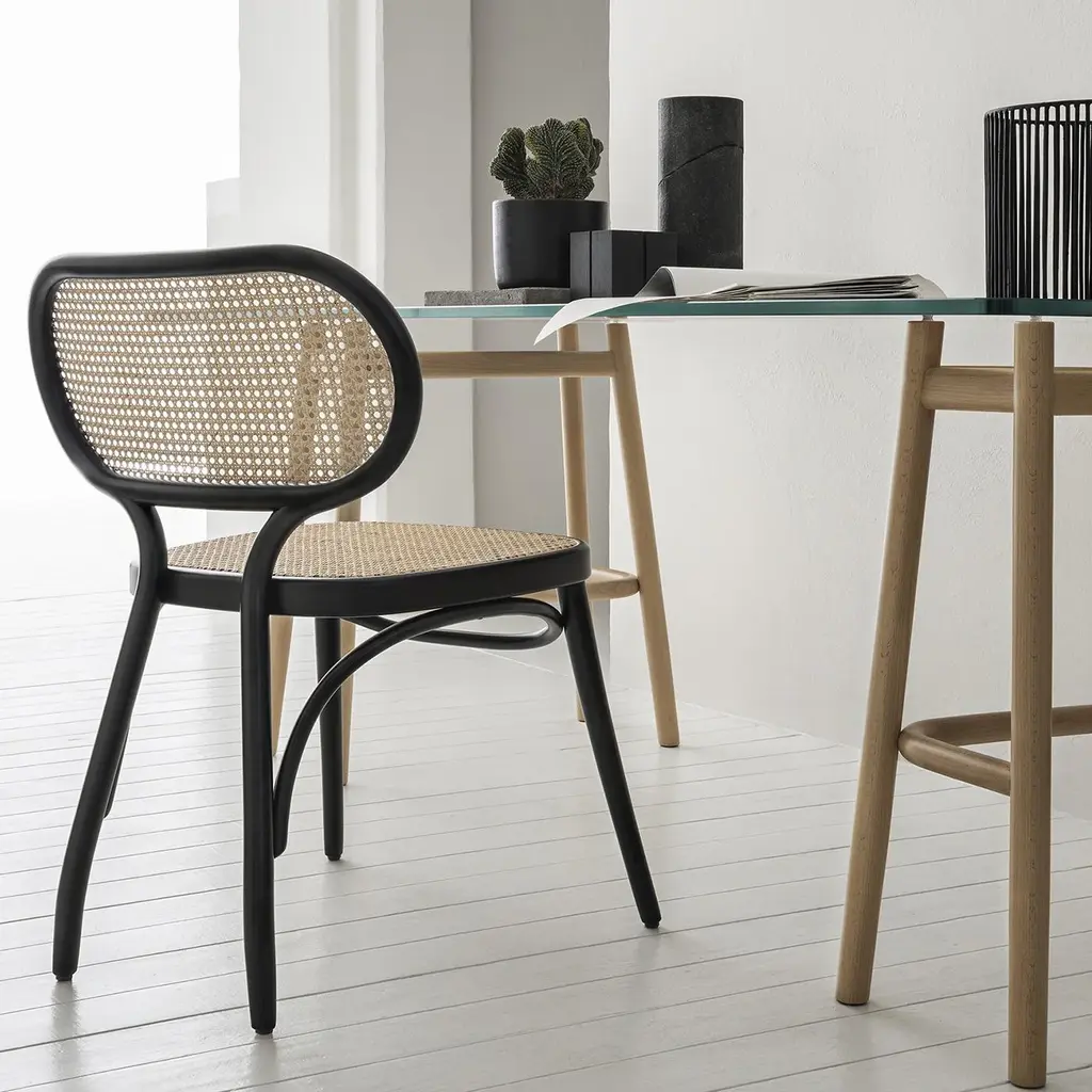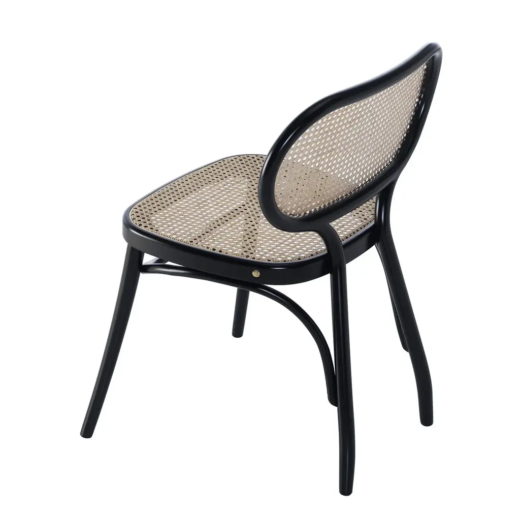 Designed by Nigel Coates in 2015, this stunning chair boasts the virtuous touch of beechwood curved with steam. The result is a sinuous silhouette with a generous seat and an ergonomic backrest, both in exquisite Viennese straw. The color of the textured straw strikingly contrasts with the black lacquer finish of the wood. Either by a modern table or combined with the Lehnstuhl Lounge Chair for a cohesive look, this piece will add a sophisticated and timeless touch to contemporary home. Signed by Maker