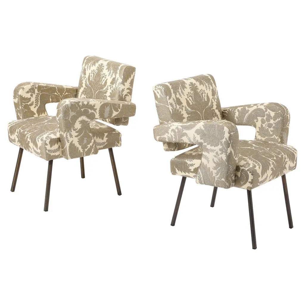 each custom made chair by Lx Rossi with in-curved sloping back cascading down to outscrolled terminals; flanked by a bowed loose cushion over a plain frieze apron all resting on tapering turned supports; the frame veneered in a taupe-colored shagreen