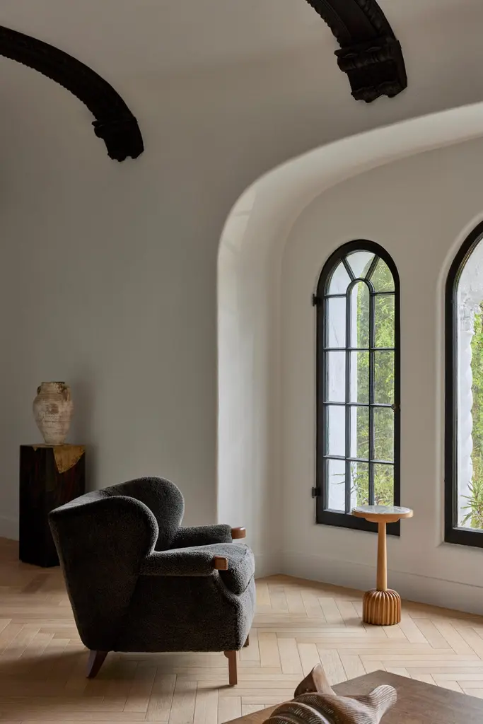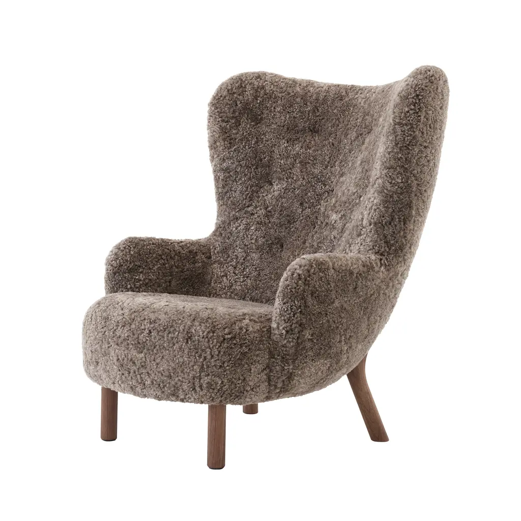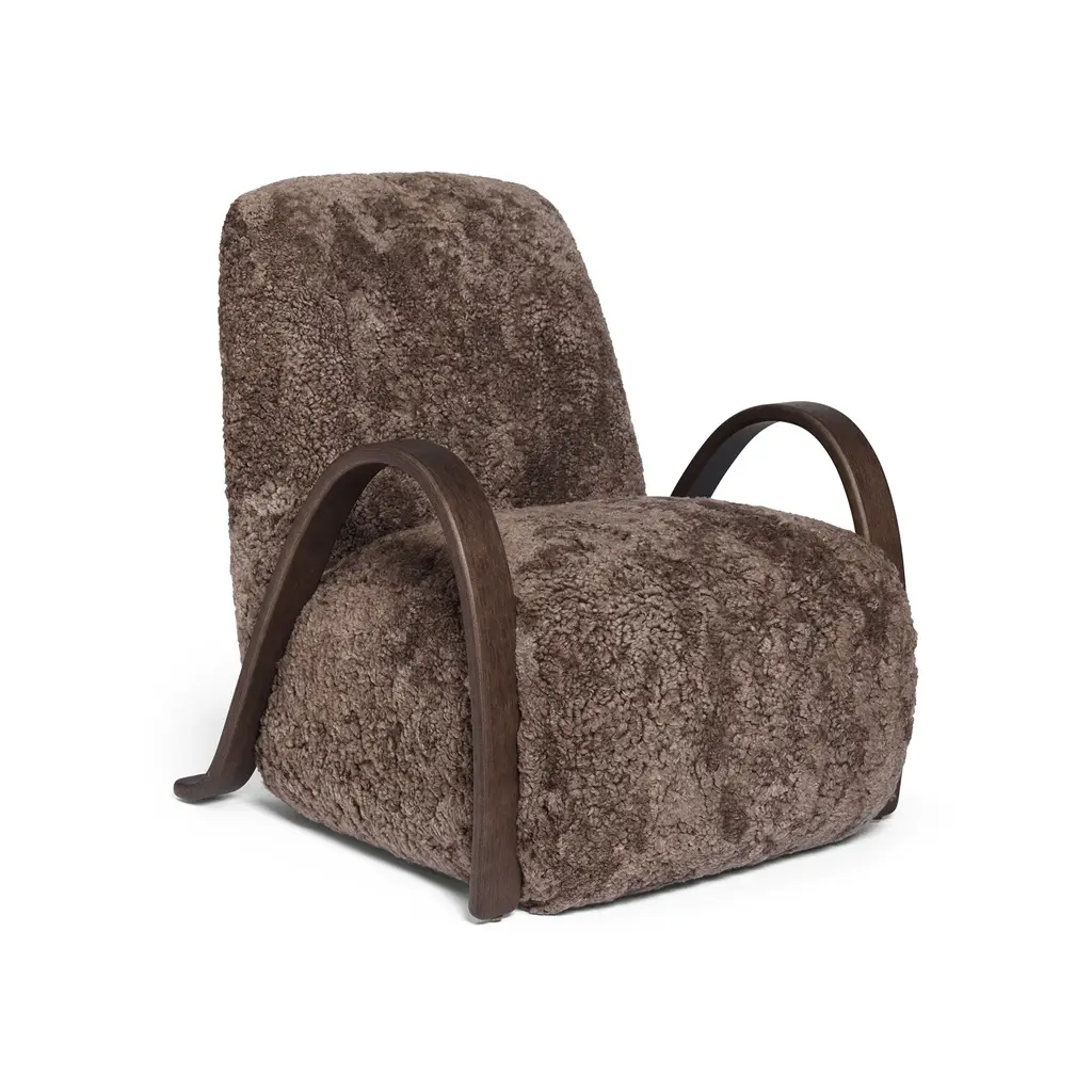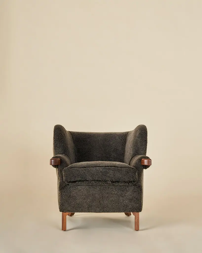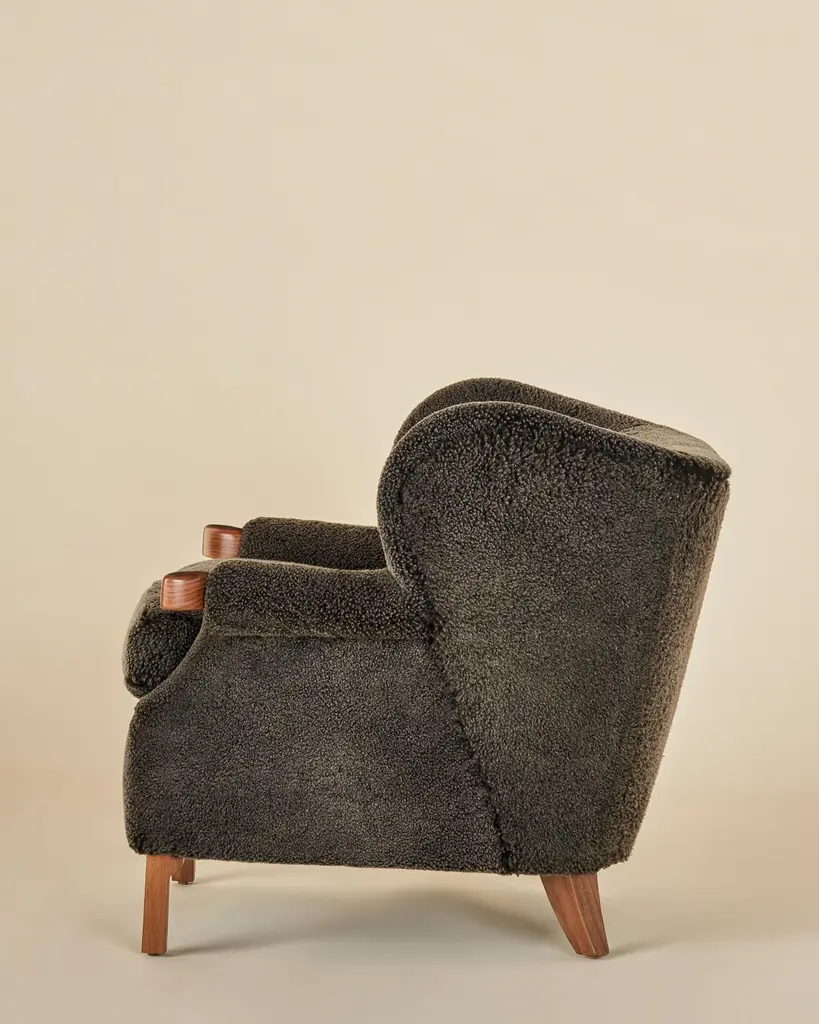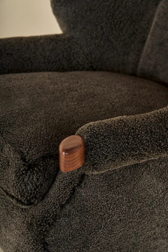 This cozy and elegant lounge chair boasts a sculptural shape with beautiful proportions. The arms are made of hand carved solid walnut detailing, and the seat depth strikes the perfect balance for the chair to adorn a formal space, or be used in a cozy setting. Shown in Coal Sheepskin and Walnut.Our collection pays homage to the everlasting idea of home, a place that is alive as its own character in the story. Taking a reductionist approach to tradition, each piece pairs effortless silhouettes with honest materials and builds on the past with balance and grace. Good design ages well and takes on a life of its own.