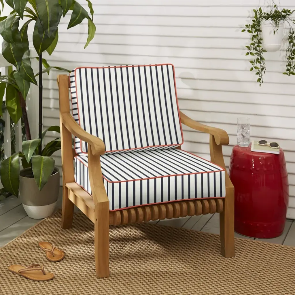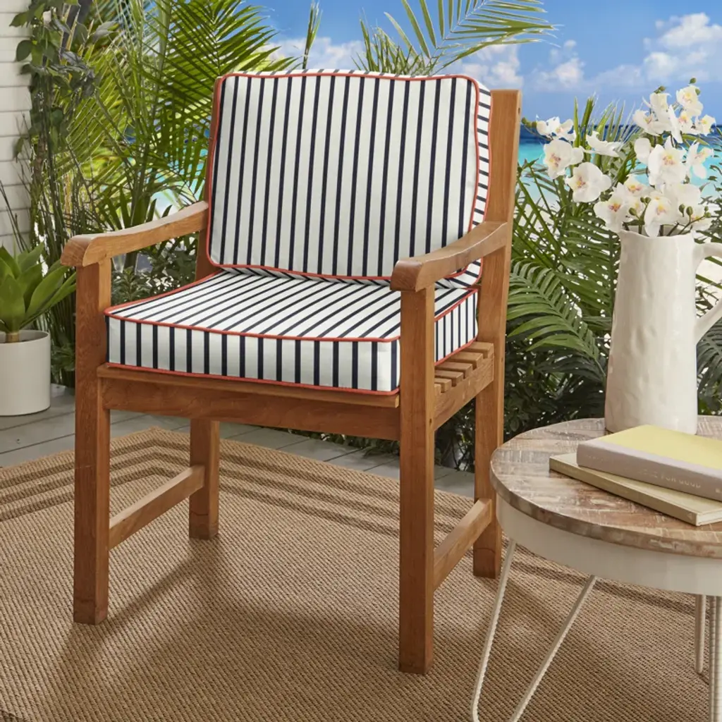 Nautical vibes ahoy! Elevate your outdoor seating with this reversible chair cushion. Its quick-drying foam blend is wrapped in weather-resistant acrylic fabric. The covers are easily removable for cleaning, and the UV, water, stain, and fade-resistant design ensures lasting appeal. So sit back, relax, and soak up the sun in style.