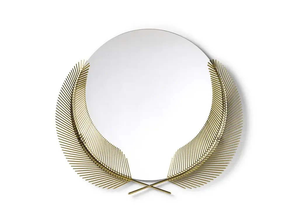 The round mirror surface is sunk into the graphic embrace of two palm fronds. The Sunset mirror is a wall-mounted declaration of the true summer paradise scenario that lingers just below the surface of the present moment.Mirror with palm leaves in brass available in different colors and sizes.Sunset Mirror (small) Ø55X70x60H cmNZ504PB101: BrassNZ504RG101: Copper plated brassSunset Mirror (Large) Ø70x87X77H cmNZ504PB102: BrassNZ504RG102: Copper plated brassNZ504DD102: Matt blackThis product belongs to the Ghidini1961 latest capsule collection, the " Midnight Glory: Ghidini1961's Blackout Collection." This exclusive collection redefines urban living with a carefully curated selection of premium design chairs and accent pieces that embody sophistication, innovation, and exclusivity.Featuring iconic items such as the Miami Chair, Frying Pan Mirror, Butterfly Coatrack, Bullet Vase, Opera Tables, and others, the "Blackout Empire: Ghidini1961's Midnight Collection" showcases the brand's unwavering commitment to exquisite craftsmanship and design excellence. Each piece is meticulously crafted with a new handmade finish, blending industrial know-how with exclusivity of design and materials.The " Midnight Glory: Ghidini1961's Blackout Collection " represents a bold statement of urban elegance and sophistication. From the sleek lines of the Opera Tables to the whimsical charm of the Butterfly Coatrack, each item invites you to experience the perfect fusion of industrial chic and modern luxury.