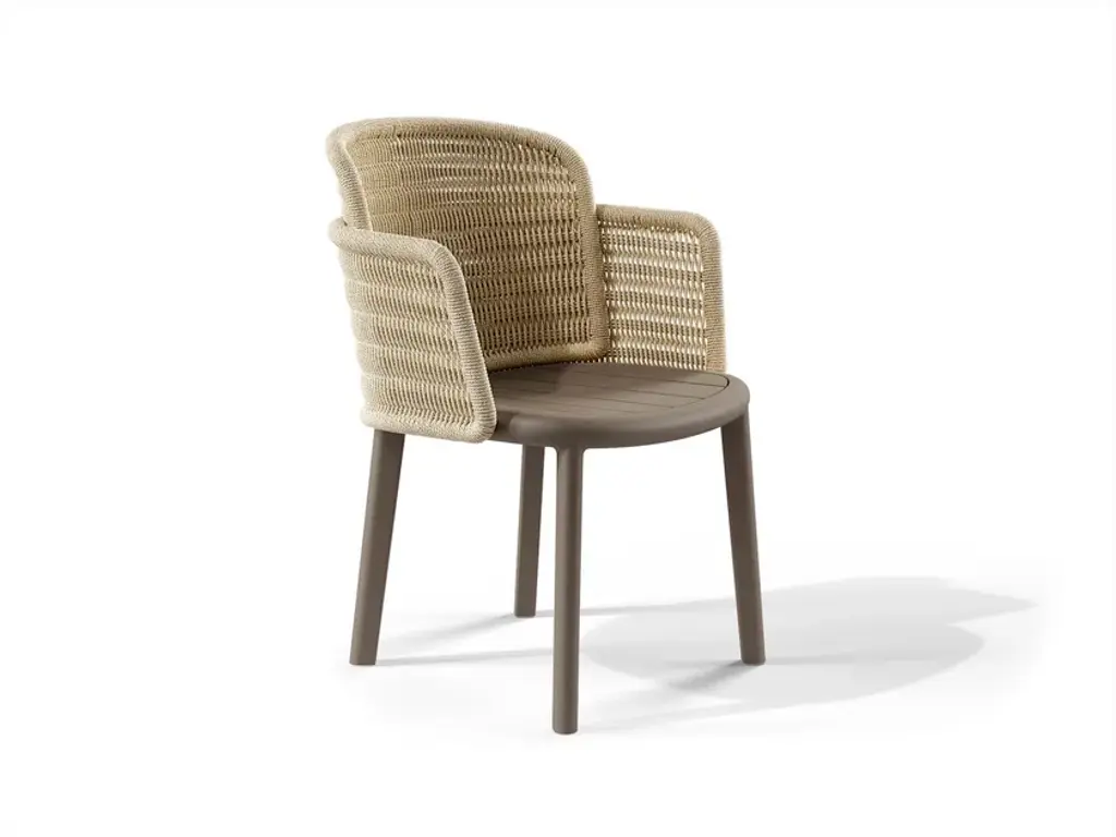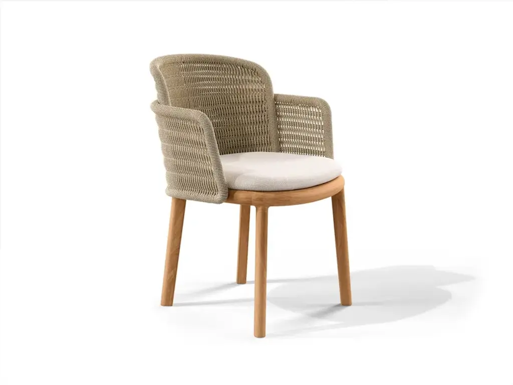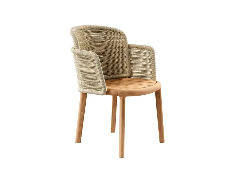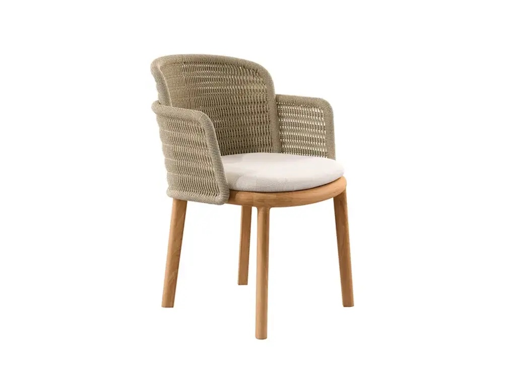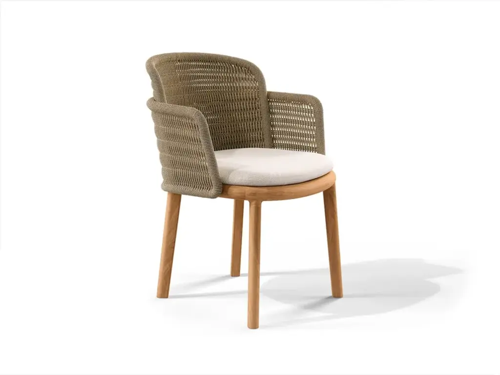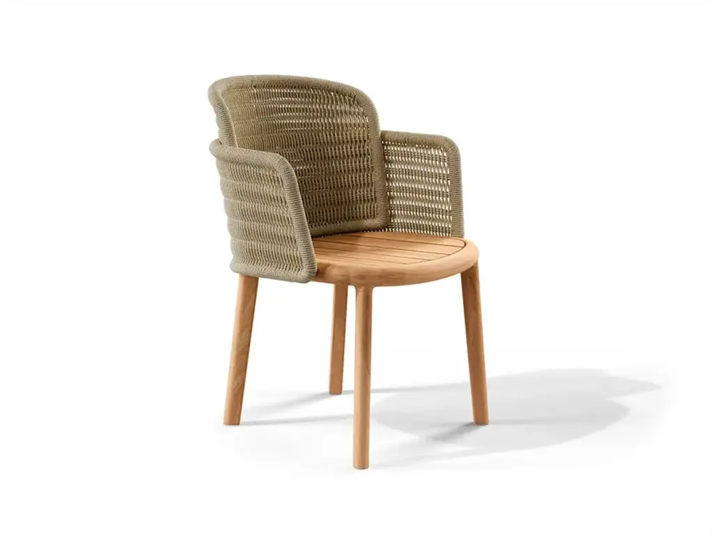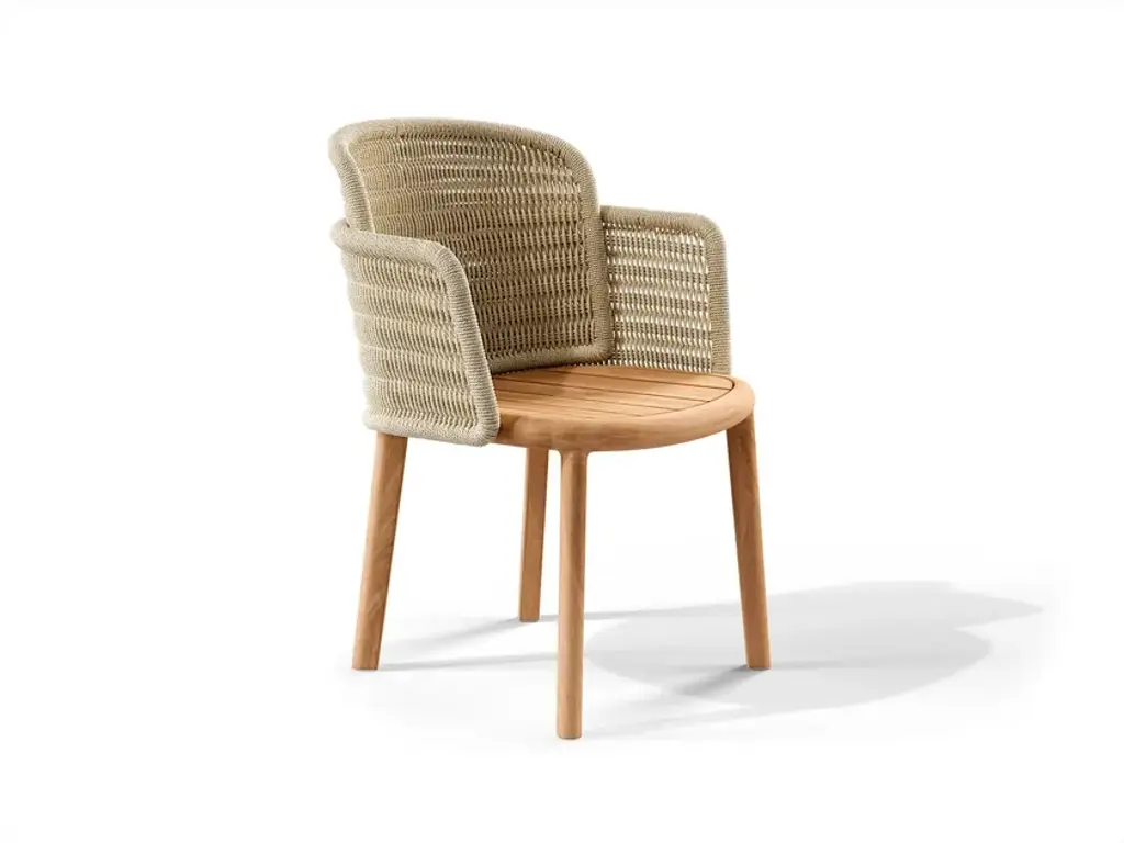 The Suro armchair truly enhances the combination of two materials: the elegant rigor of teak wood or powder coated aluminium and the flexibility of the braided rope weaving. Both materials elegantly blend into an exceptional design. The wood and aluminium both affirm the structure of the seat. The fiber backrest, as if hanging from the seat, forms an embracing cocoon-like flower petal which provides unique comfort thanks to its roundness.