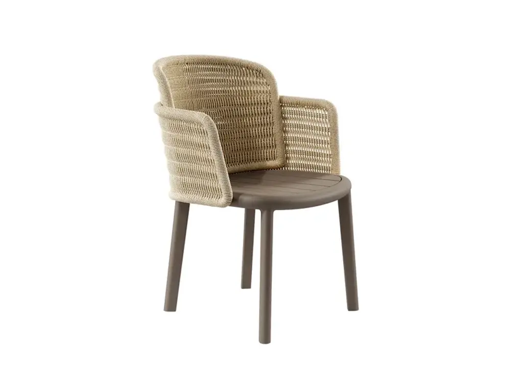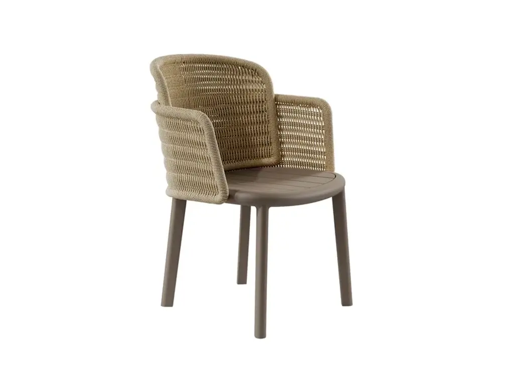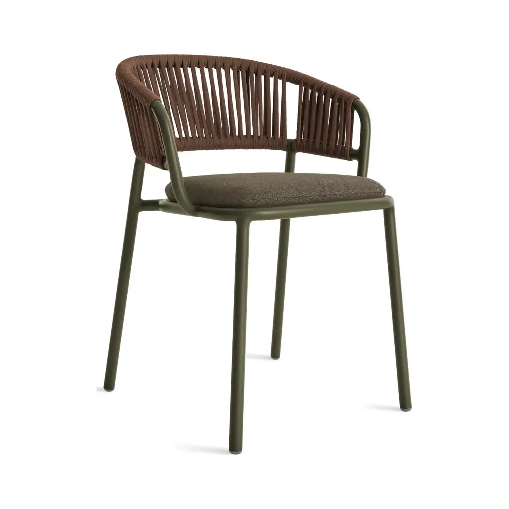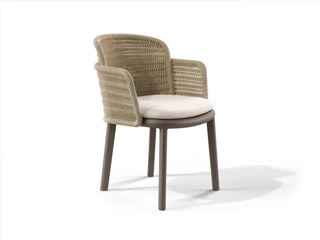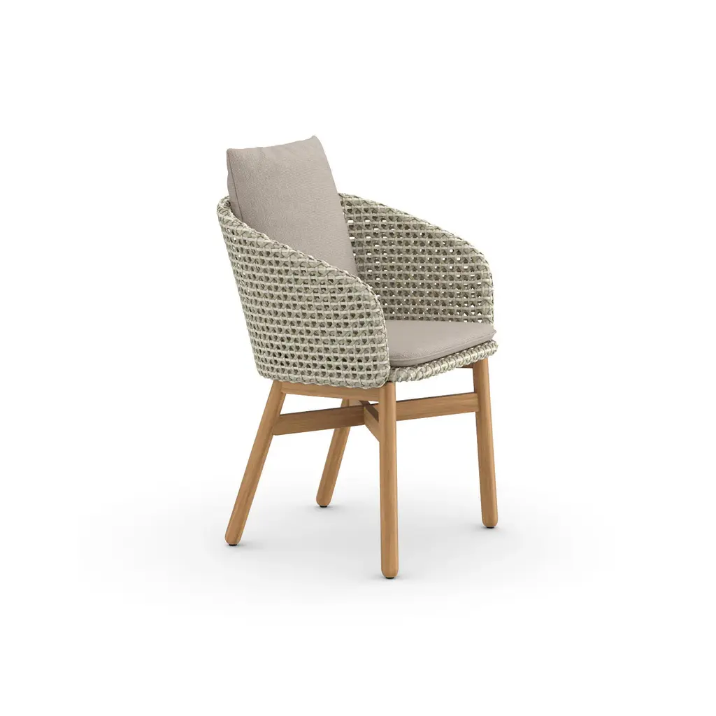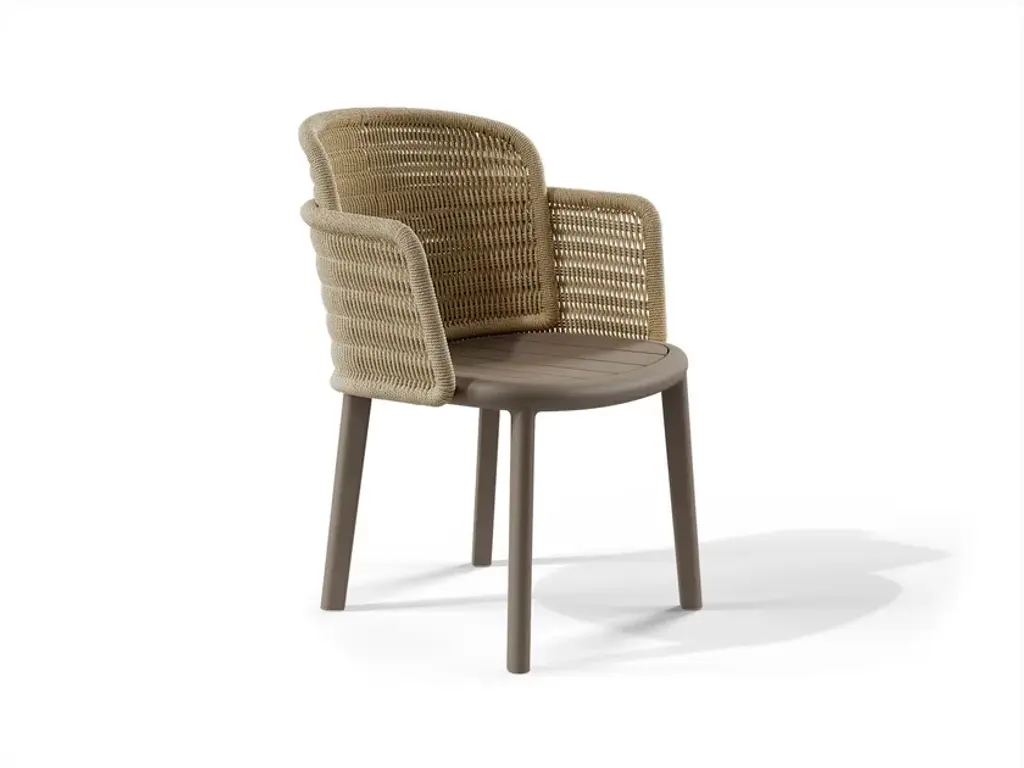 The Suro armchair truly enhances the combination of two materials: the elegant rigor of teak wood or powder coated aluminium and the flexibility of the braided rope weaving. Both materials elegantly blend into an exceptional design. The wood and aluminium both affirm the structure of the seat. The fiber backrest, as if hanging from the seat, forms an embracing cocoon-like flower petal which provides unique comfort thanks to its roundness.
