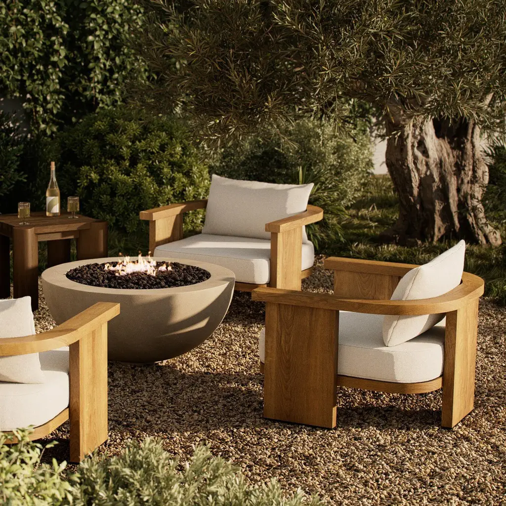 Add a touch of modern comfort to your outdoor space with the Tahana Outdoor Lounge Chair from Four Hands. Crafted from FSC-Certified wood, this chair features a clean and simple three-leg design and a curved seat back for added comfort. The included high performance cushions provide a luxurious touch, ensuring the perfect spot to relax and recharge in your garden or patio entertainment space. Highlights