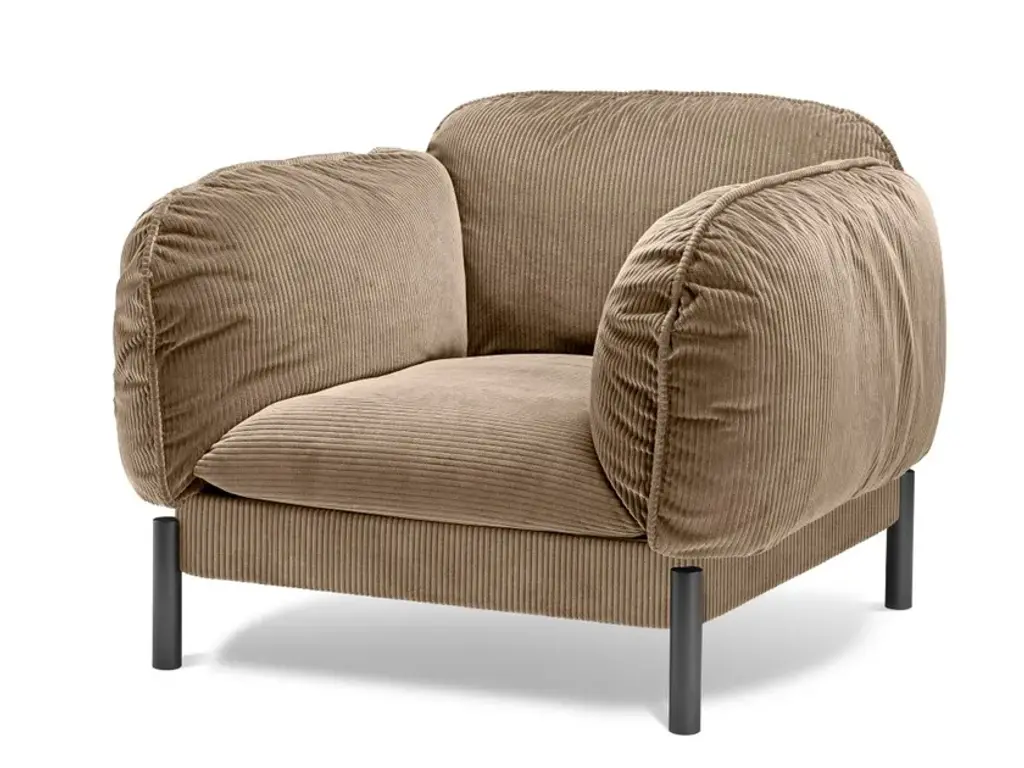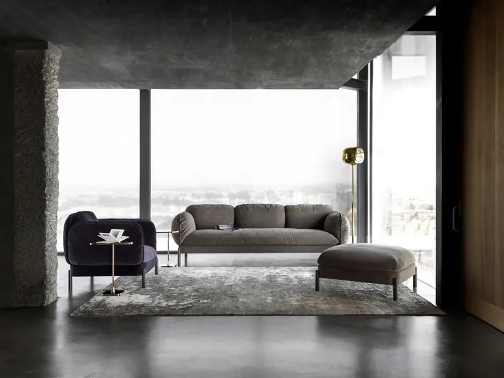 Tarantino is an armchair with armrests, part of the homonymous collection. Design Lorenza Bozzoli.Technical FeaturesStructure: Aluminum legs fixed on internal metal frame, aluminum side support.Cushions: Back cushions in high grammage wadding with internal rubber insert, covered with a quilted goose down in cotton lining. Seat cushions in polyurethane rubber of different densities covered with a quilted goose down in cotton lining.Covers: Covers are not removable.Base: The sofa, armchair and ottoman are made of Italian aluminum, bent in-house at Ghidini1961. Polished manually, and lacquered with a transparent finish to guarantee a long lasting durability.