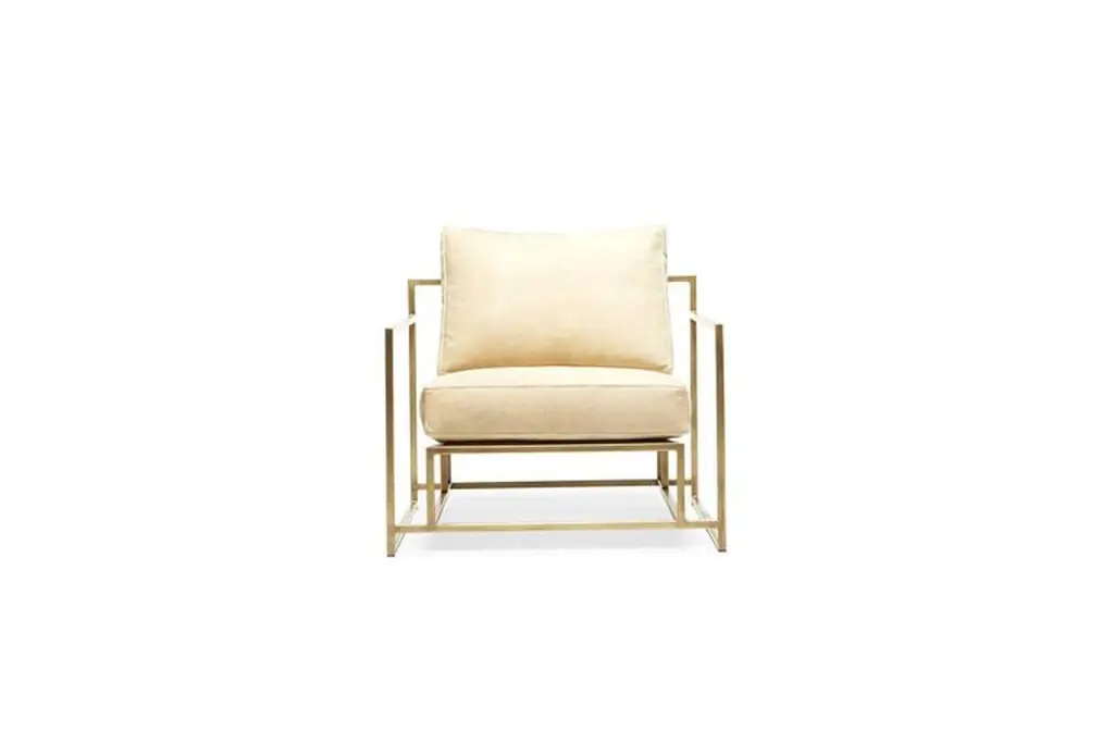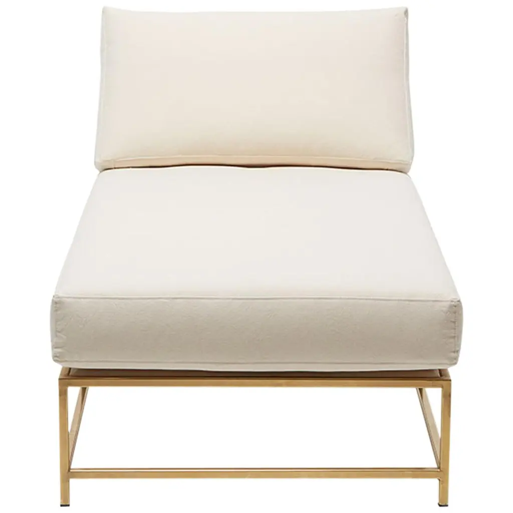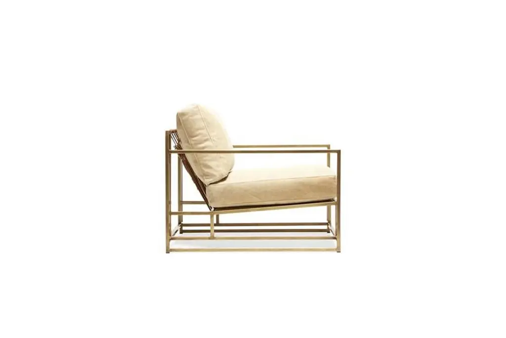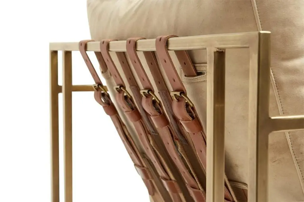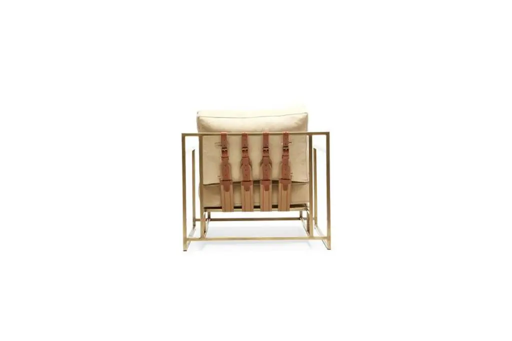 The Inheritance Armchair by Stephen Kenn is as comfortable as it is unique. The design features an exposed construction composed of three elements - a steel frame, plush upholstery, and supportive belts. The deep seating area is perfect for a relaxing lounge experience. Every Stephen Kenn piece is made to order through our Los Angeles studio in partnership with a number of small businesses and fabricators in the LA area. With this highly customizable armchair you can select from a wide range of finishes and materials to complement your home and lifestyle - please message us to see our Customization Guide with all available options.This version of our Inheritance Armchair is upholstered in pebbled taupe leather from the Cottswald Collection by Moore & Giles. The foam seat cushion has been wrapped in down for added comfort and sits atop an antique brass plated steel frame. The armchair is strapped with support belts featuring a replica of a WWII Swiss army "mule belt” with cognac leather and antique brass buckles.