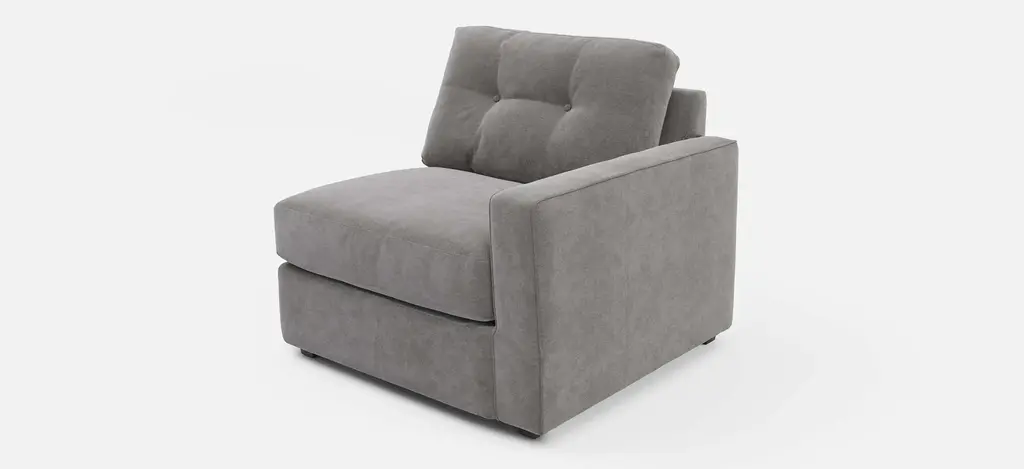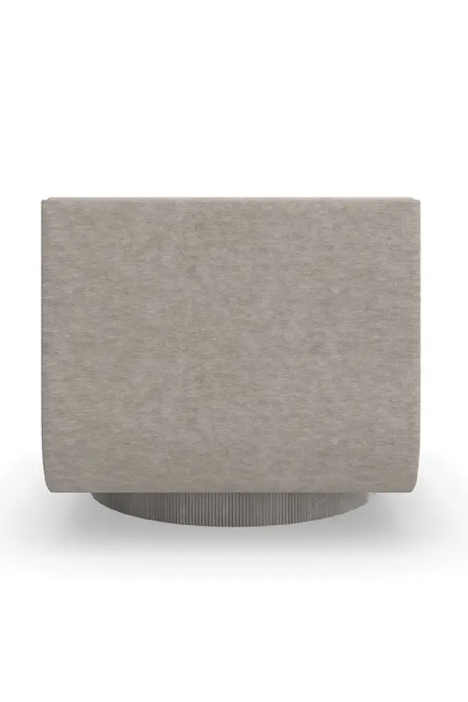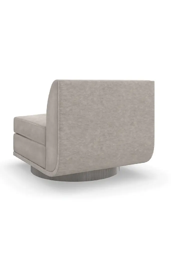 A Space Age-inspired design, this Clipper sectional component calls to mind the undulating, curvaceous aesthetic of an era that fused art and imagination with progress and innovation. Meticulously tailored, its streamlined silhouette is accentuated by a taupe faux-mohair velvet on the inside, and a tactile silver metallic fabric along the outside and back. Like a gear or cog, its rounded plinth base with a micro-reeding detail seamlessly mixes classicism with industrialism for a finishing touch that is uniquely Caracole.