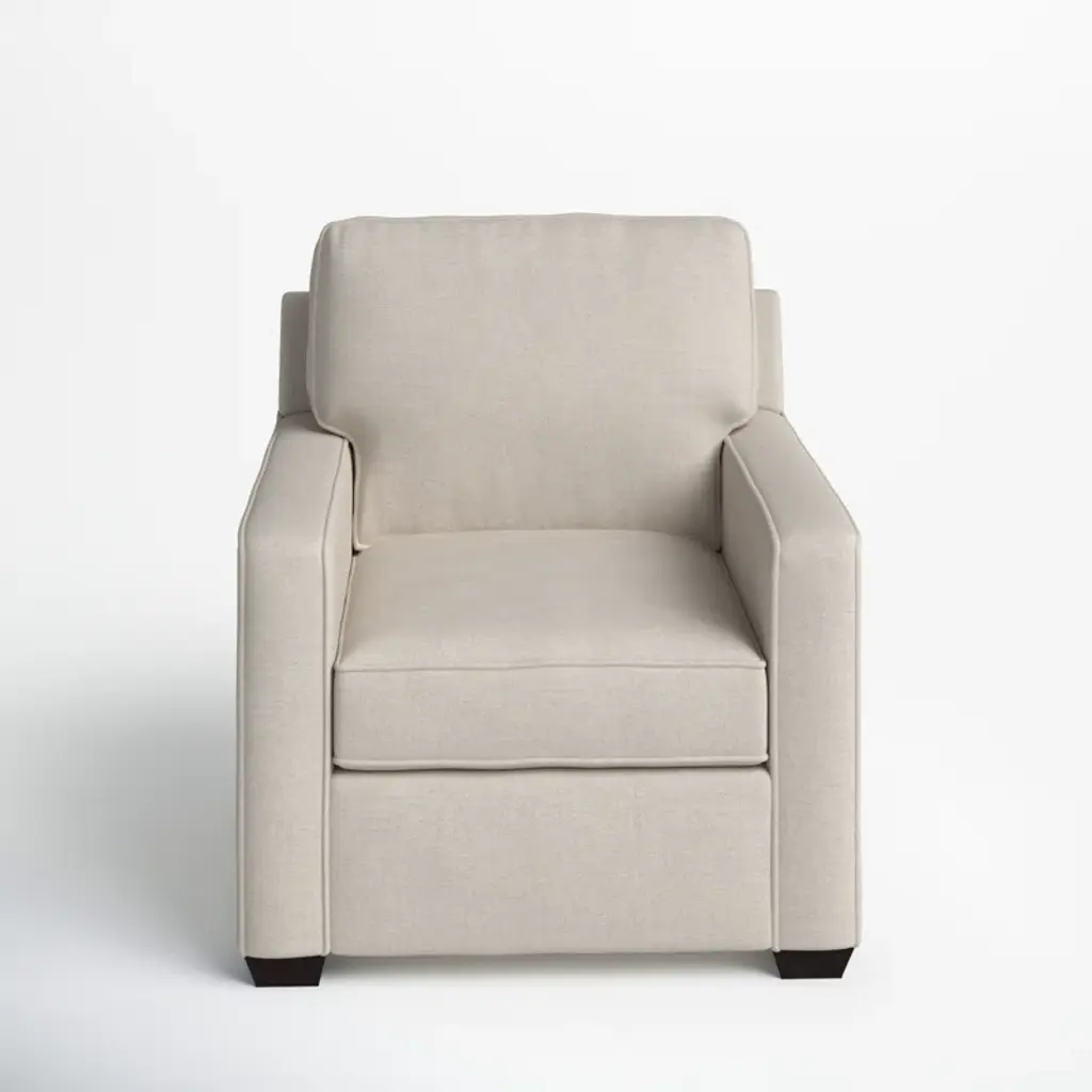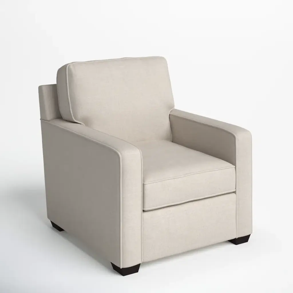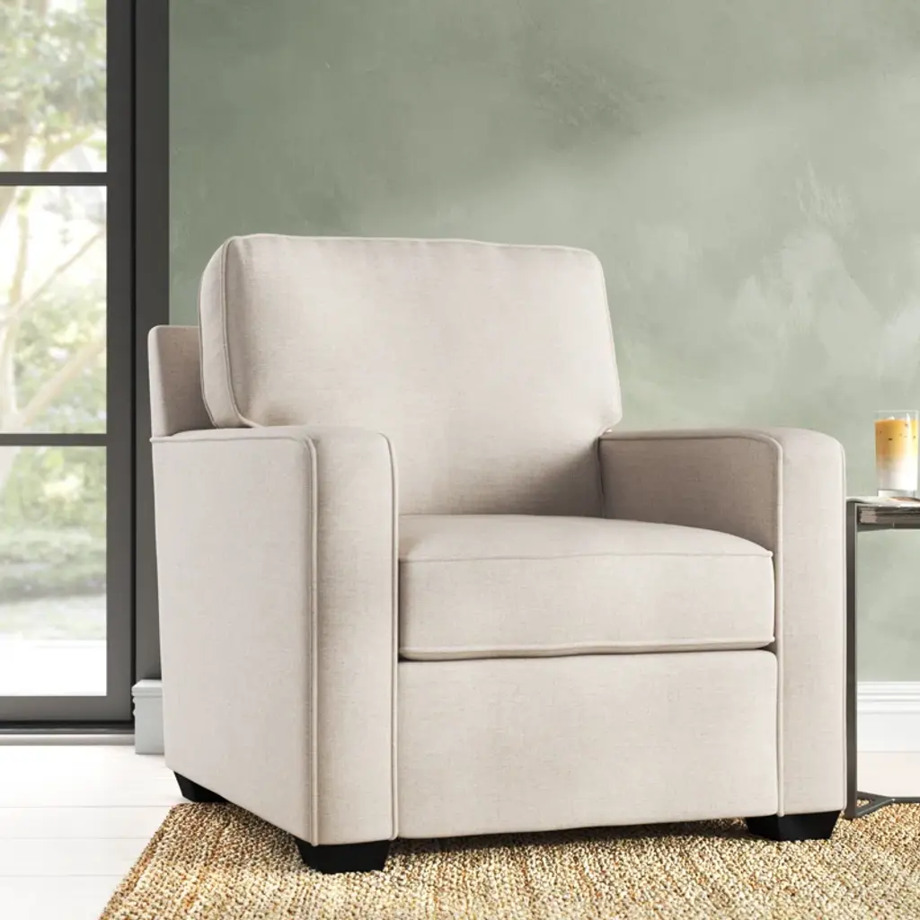 This armchair is practically made for your traditional living room or entryway. It's built with a solid and engineered wood frame that rests on sturdy legs. This chair is wrapped in fabric that's super sturdy and comes in the color of your choice. It has square arms and a cushion back that complete its classic look. Plus, its seat and back cushions are removable, so it's a breeze to vacuum. And the cushions are reversible to help ensure even wear. No assembly is required, so all you have to do is relax.