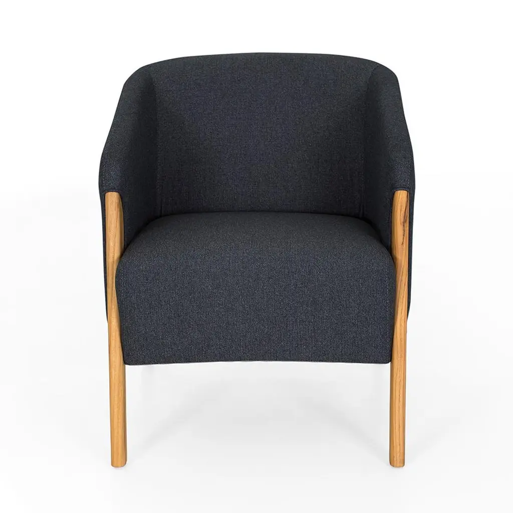 A teak wood armchair upholstered in charcoal fabric, the Abra chair balances visual strength with understated elegance. Please check availability prior to purchase. Its sculptural frame, crafted from solid teak with a soft matte finish, contrasts beautifully with the deep-toned fabric—creating a warm yet contemporary presence in any room.The armrests flow seamlessly into the angled back and legs, revealing the grain and natural variation of the wood, making each chair unique. Soft Ecosoft foam padding provides support without stiffness, making this chair as comfortable as it is stylish. Whether you're reading, relaxing, or entertaining, the Abra delivers a soft comfort level with structure—no excess, no compromise.Its compact footprint and curved silhouette make it easy to place in a living room as a standalone accent, or as a pair flanking a coffee table. In a bedroom, it becomes a reading nook essential. In an office or studio, the Abra brings a tactile sense of calm and focus. The signed detail on the frame adds a discreet nod to its design pedigree, ideal for collectors or clients seeking furniture with intention.Arriving fully assembled, this chair requires no setup—simply place and enjoy. The pairing of durable upholstery with sustainably sourced teak ensures that the Abra armchair is built to last, both in aesthetic appeal and structural integrity.Equally suited for residential and boutique commercial spaces, the Abra is a refined, practical choice for interiors that favor form, comfort, and craftsmanship in equal measure.