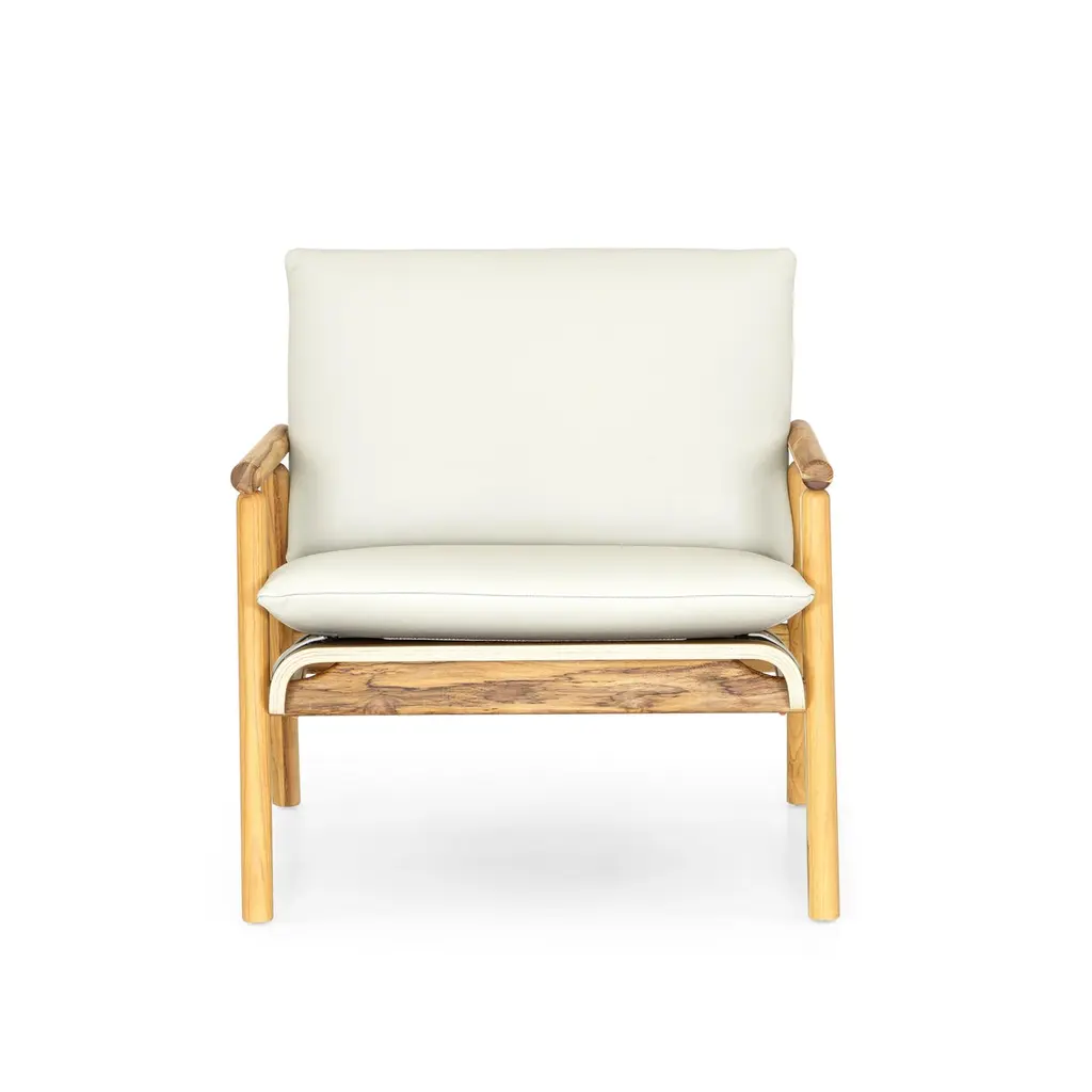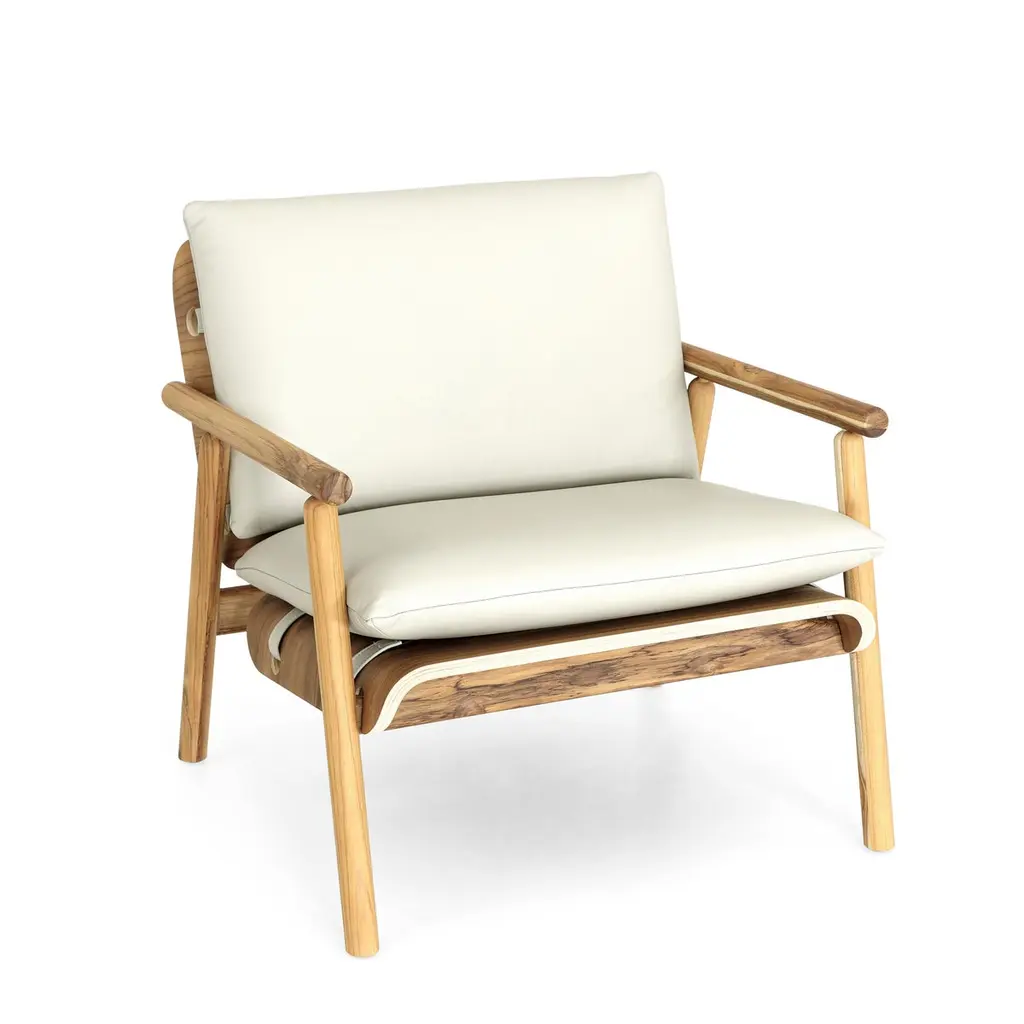 The Tai armchair by Uultis balances organic warmth with a refined modern aesthetic. Please check availability prior to purchase.Crafted in teak wood, the frame showcases soft curves and precise joinery, while the ivory leather cushions add an inviting contrast. The unique sling-style seat and backrest are held in place by tailored straps, giving the piece a distinctive, structured look that blends contemporary design with natural materials.Designed for both visual appeal and comfort, this armchair offers a very firm yet supportive seat, perfect for a lounge setting or reading nook. The fluid lines of the teak frame create a sense of movement, while the neutral leather enhances its versatility, making it an easy fit in minimalist, Scandinavian, or even mid-century interiors. Teak naturally features unique variations, ensuring each piece is one of a kind. It will be finished with a matte, velvety teak touch coating that enhances its natural texture while maintaining the authentic feel of the wood.Place it as a standalone accent piece in a living room, pair it with a sleek side table for a curated reading corner, or use a set in a lounge space to encourage relaxed conversation. Whether styled in a bright, airy space or among richer tones, the Tai armchair elevates the room with its effortless sophistication.