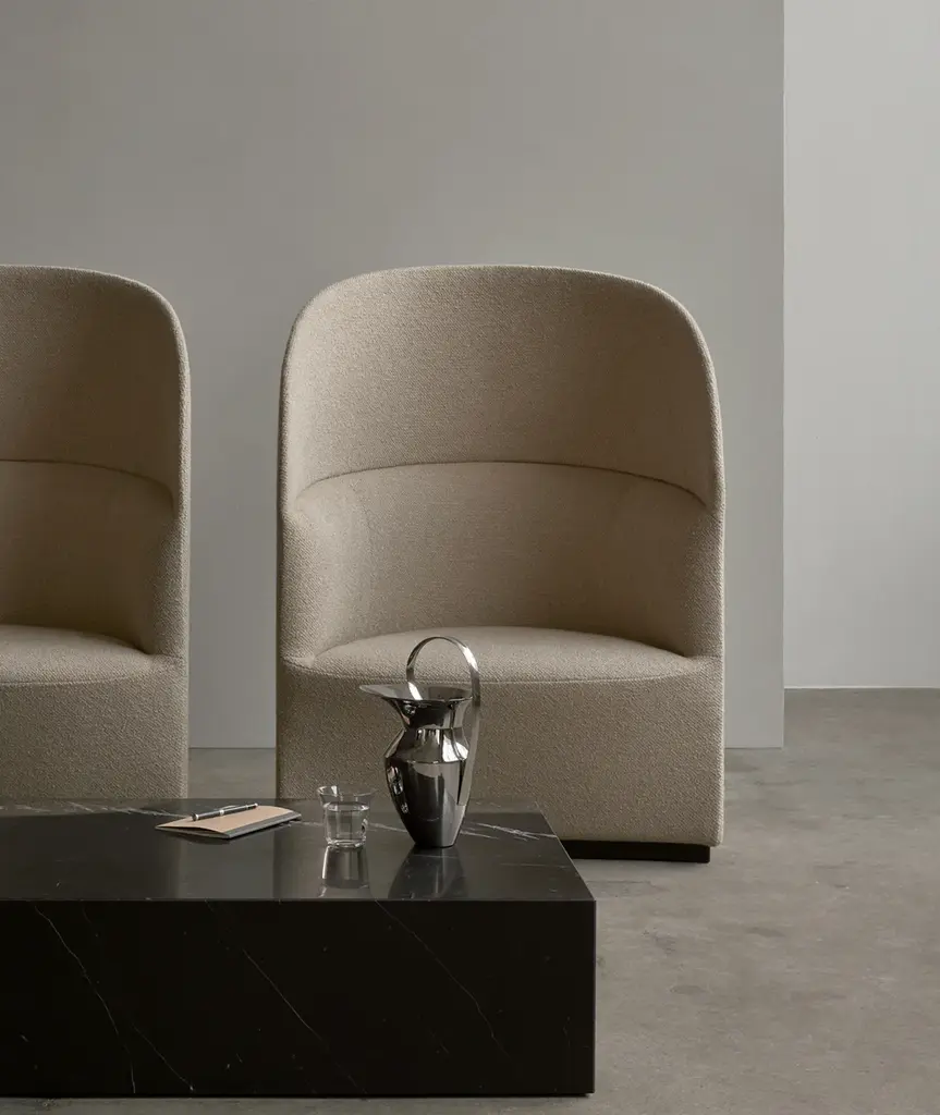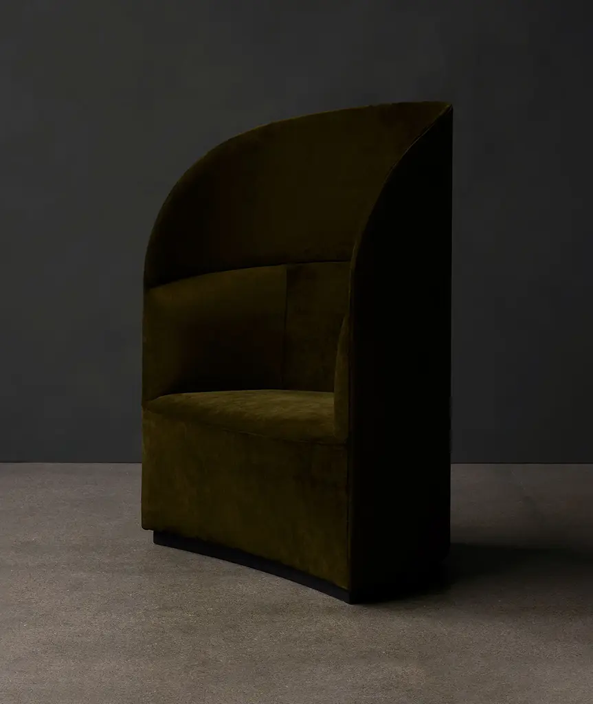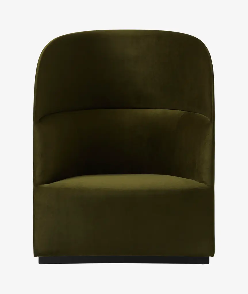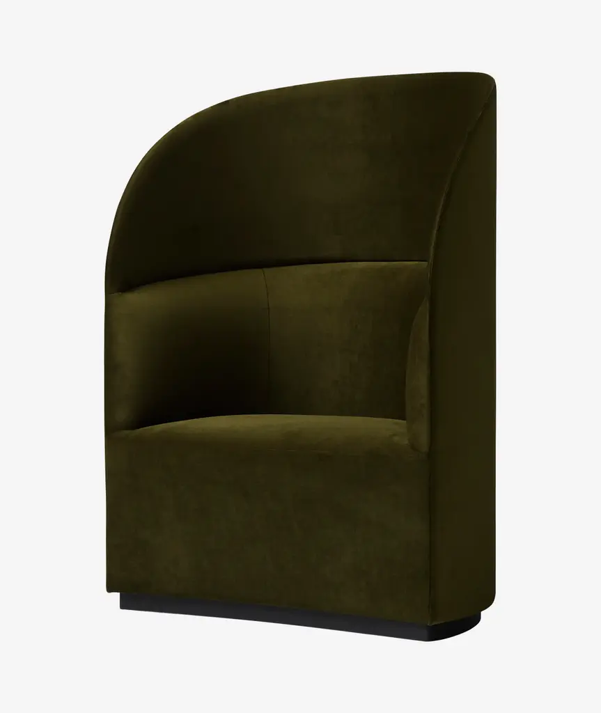 The high back version of the Tearoom Lounge Chair offers moments of quiet contemplation in busy spaces. Expressive and elegant, the secluded, foam-filled furniture piece rests on a wooden base for a natural contrast to the upholstered seat."