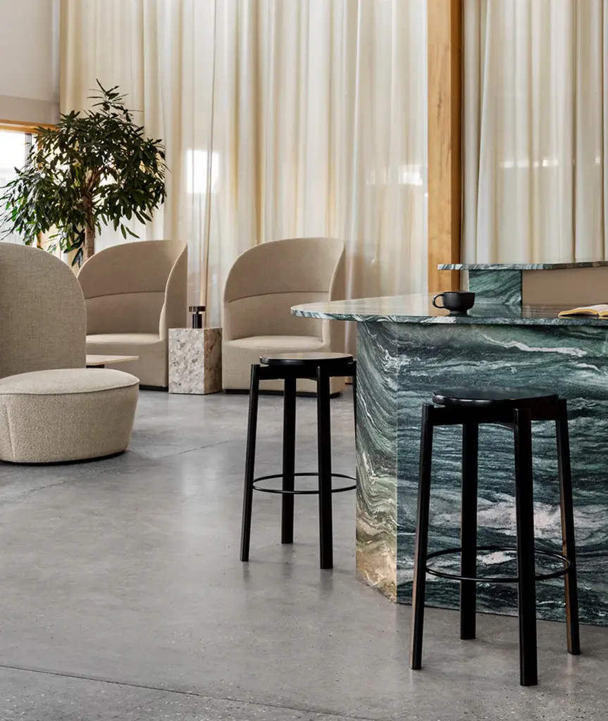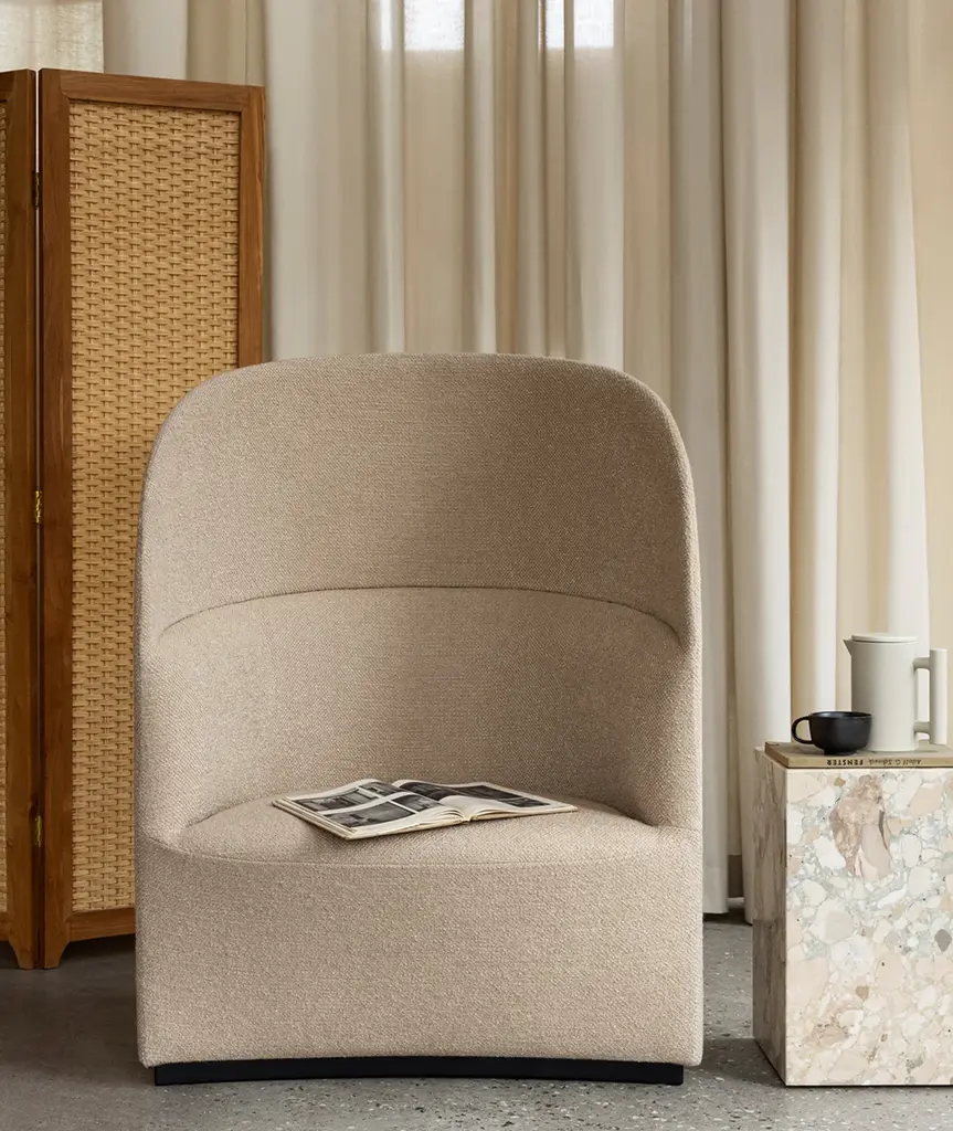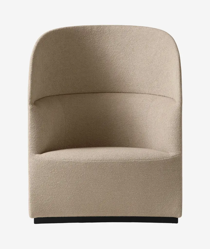 The high back version of the Tearoom Lounge Chair offers moments of quiet contemplation in busy spaces. Expressive and elegant, the secluded, foam-filled furniture piece rests on a wooden base for a natural contrast to the upholstered seat."