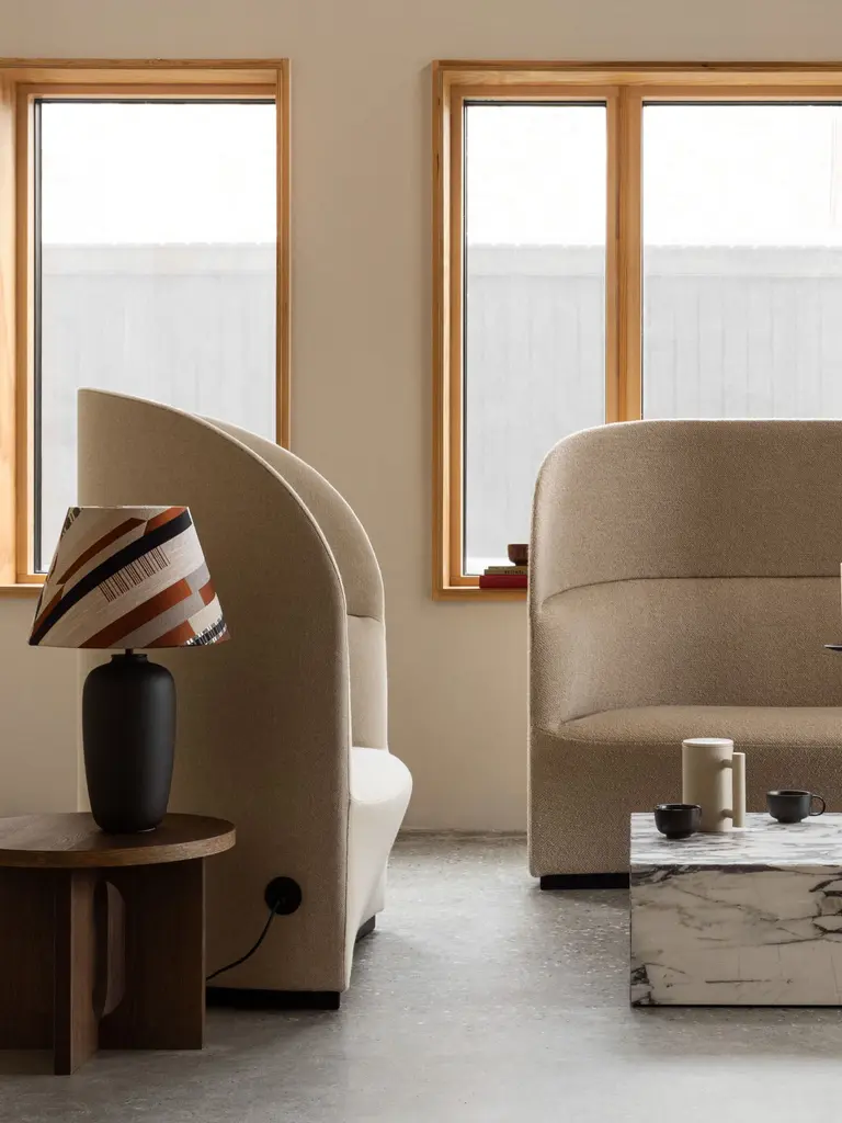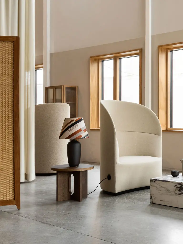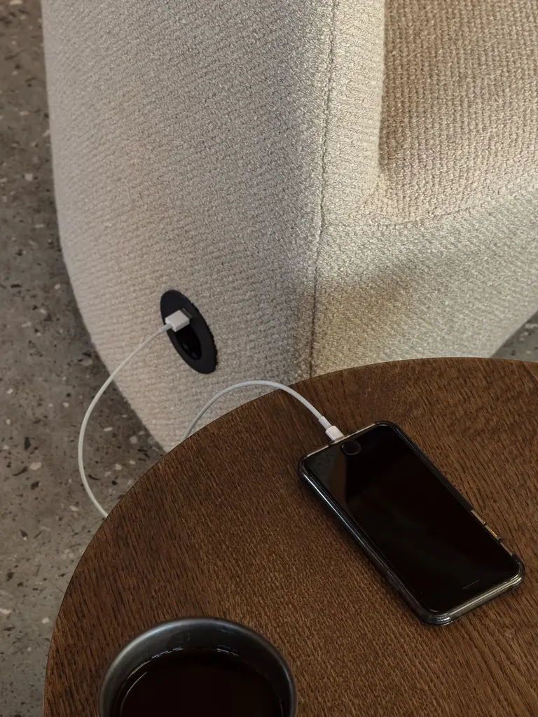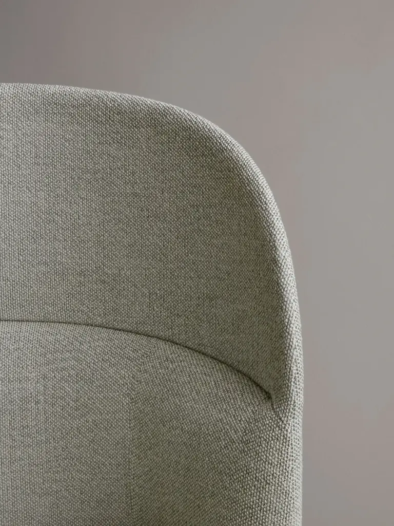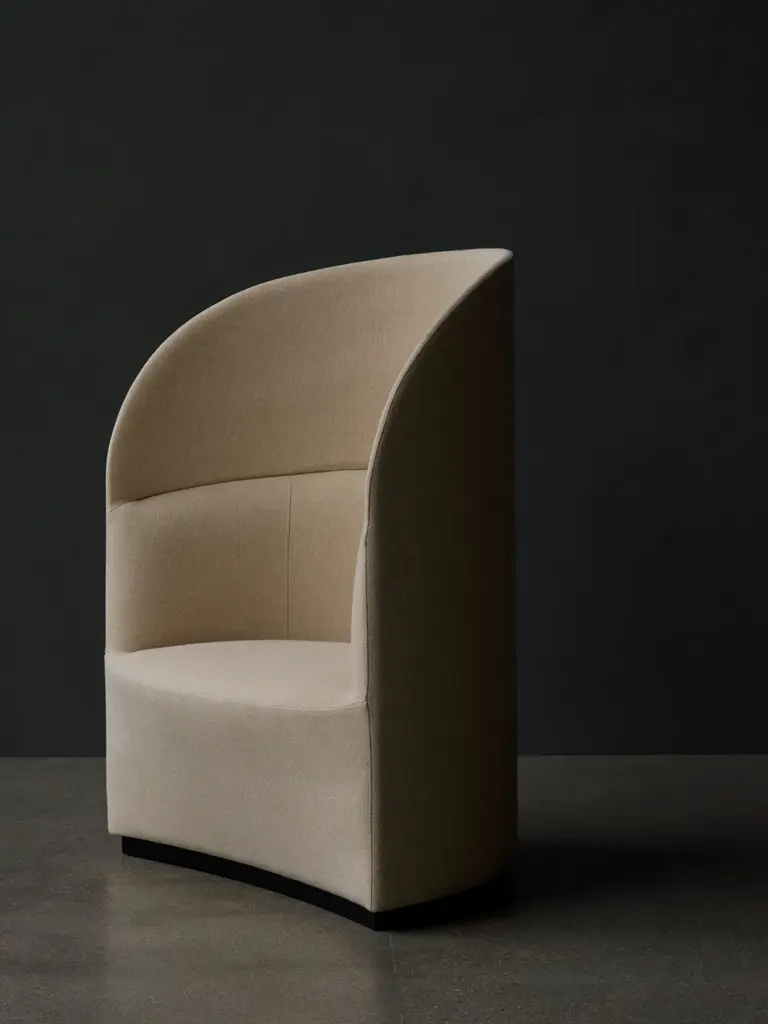 The high back version of the Tearoom Lounge Chair offers moments of quiet contemplation in busy spaces. Expressive and elegant, the secluded, foam-filled furniture piece rests on a wooden base for a natural contrast to the upholstered seat. The addition of a USB port and power socket at the base makes it a practical spot for work as well as play. USB power outlets cannot be added after purchasing a lounge chair without a power outlet.