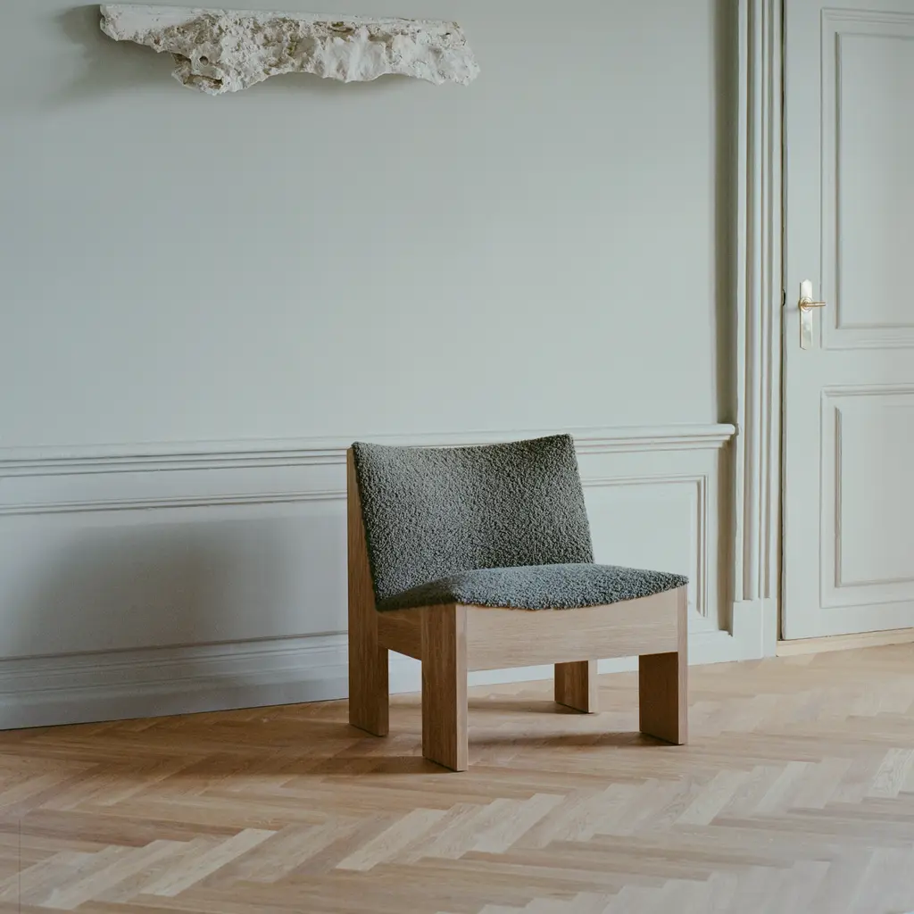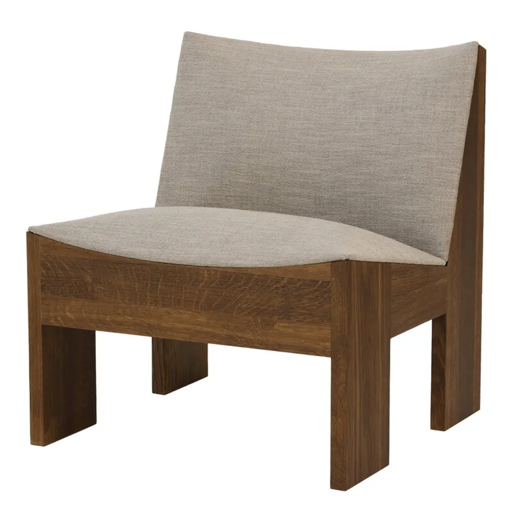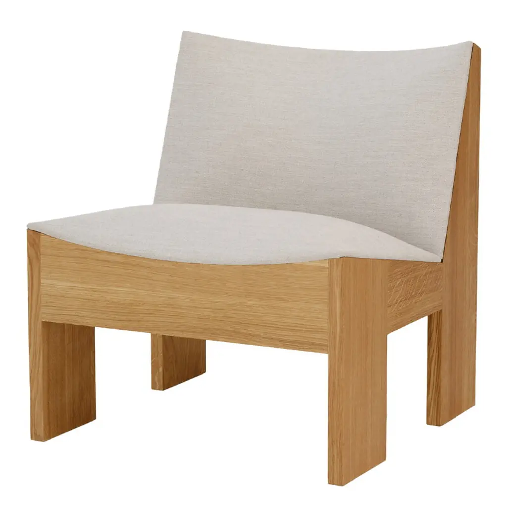 The Lounge Chair features a solid oak frame paired with plush upholstery, creating a balanced contrast between sturdy wood and soft seating. Its frame is crafted with traditional mortise and tenon joints for lasting durability and a refined sculptural look. The chair’s strong lines and robust structure are softened by gentle curves, ensuring both comfort and visual charm.