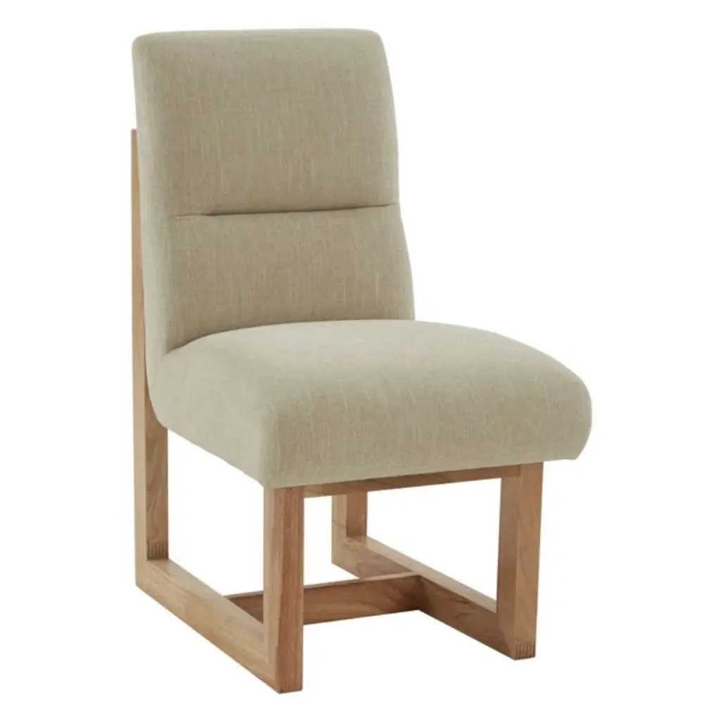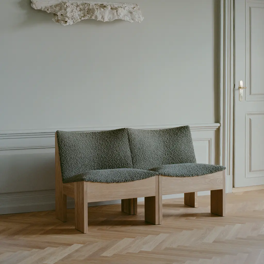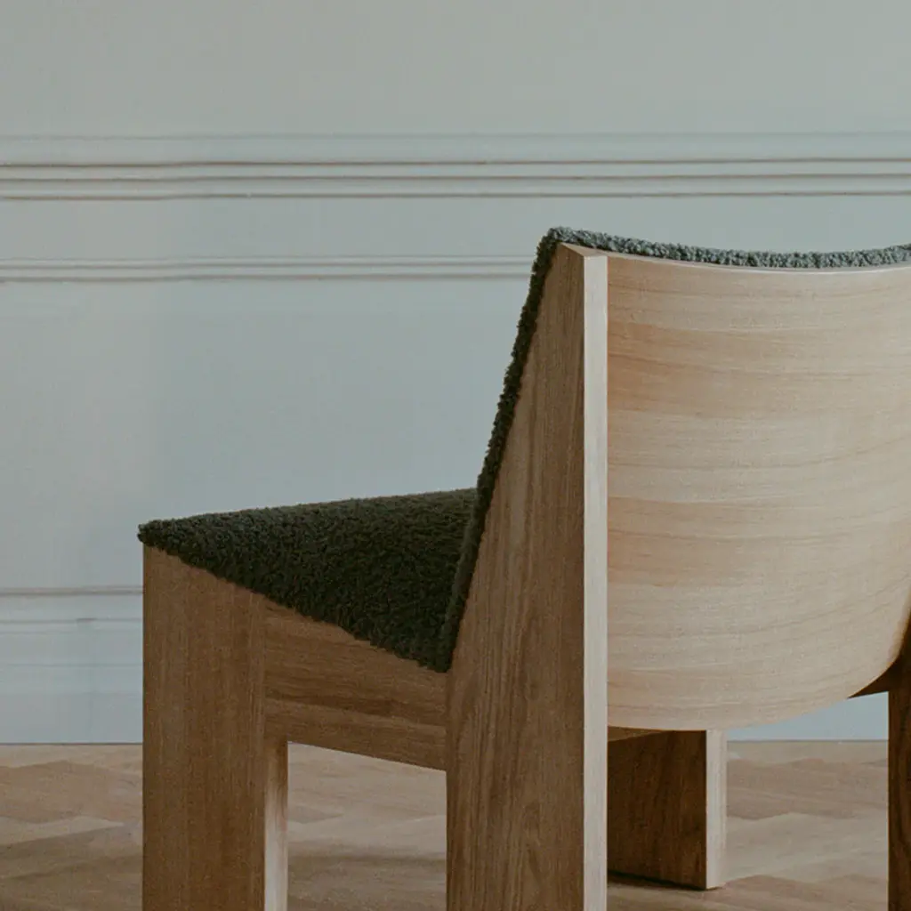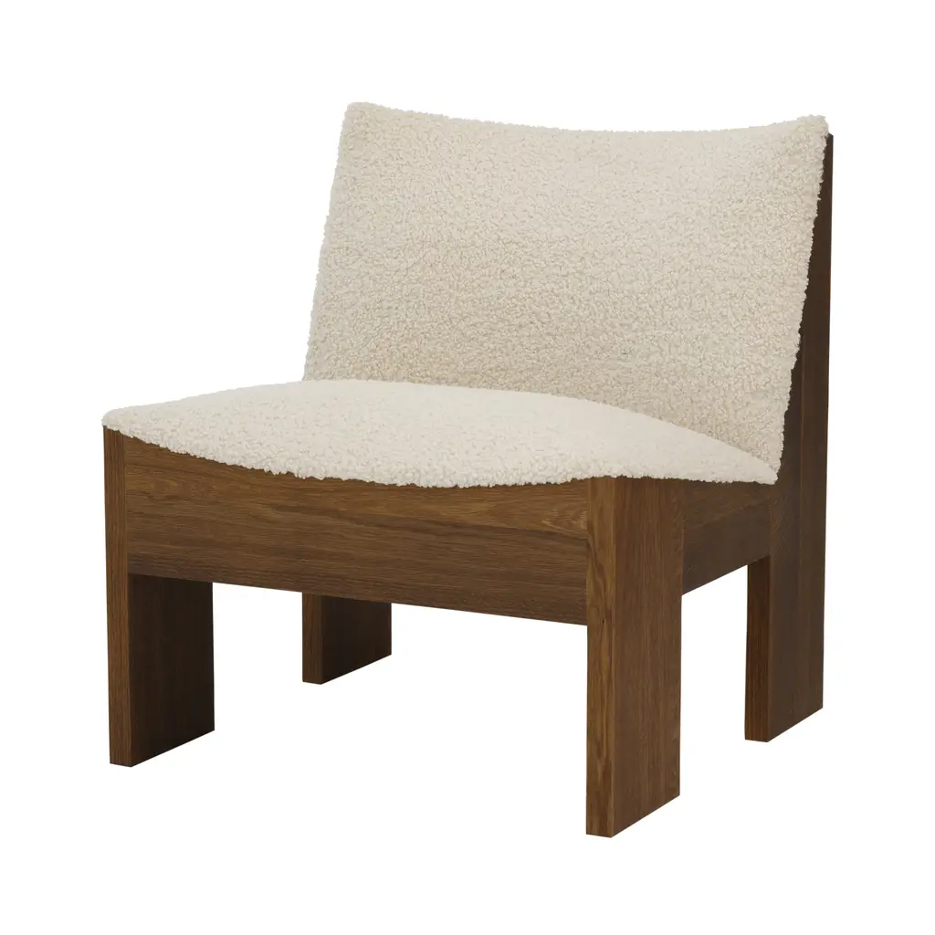 The Lounge Chair features a solid oak frame paired with plush upholstery, creating a balanced contrast between sturdy wood and soft seating. Its frame is crafted with traditional mortise and tenon joints for lasting durability and a refined sculptural look. The chair’s strong lines and robust structure are softened by gentle curves, ensuring both comfort and visual charm.