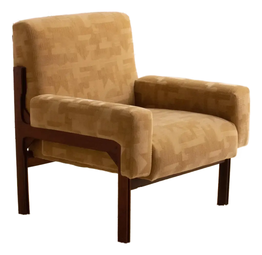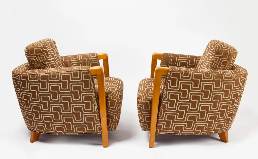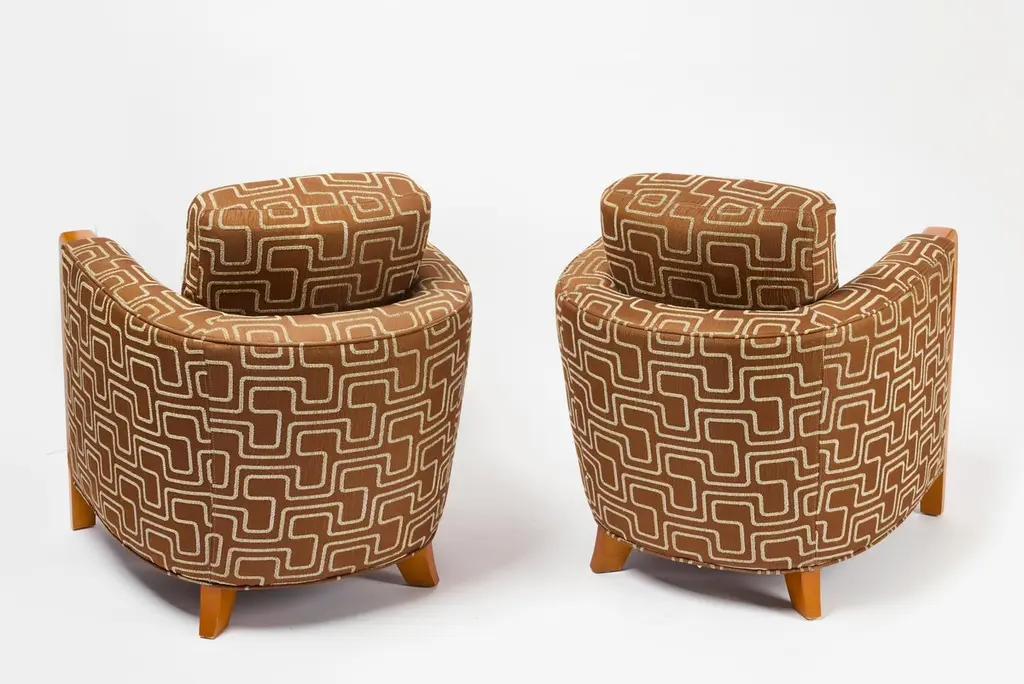 Pair of upholstered armchairs by Thayer Coggin. Wonderful original upholstery. Circa 1970.H 25-1/2" W 29-1/4" D 38".